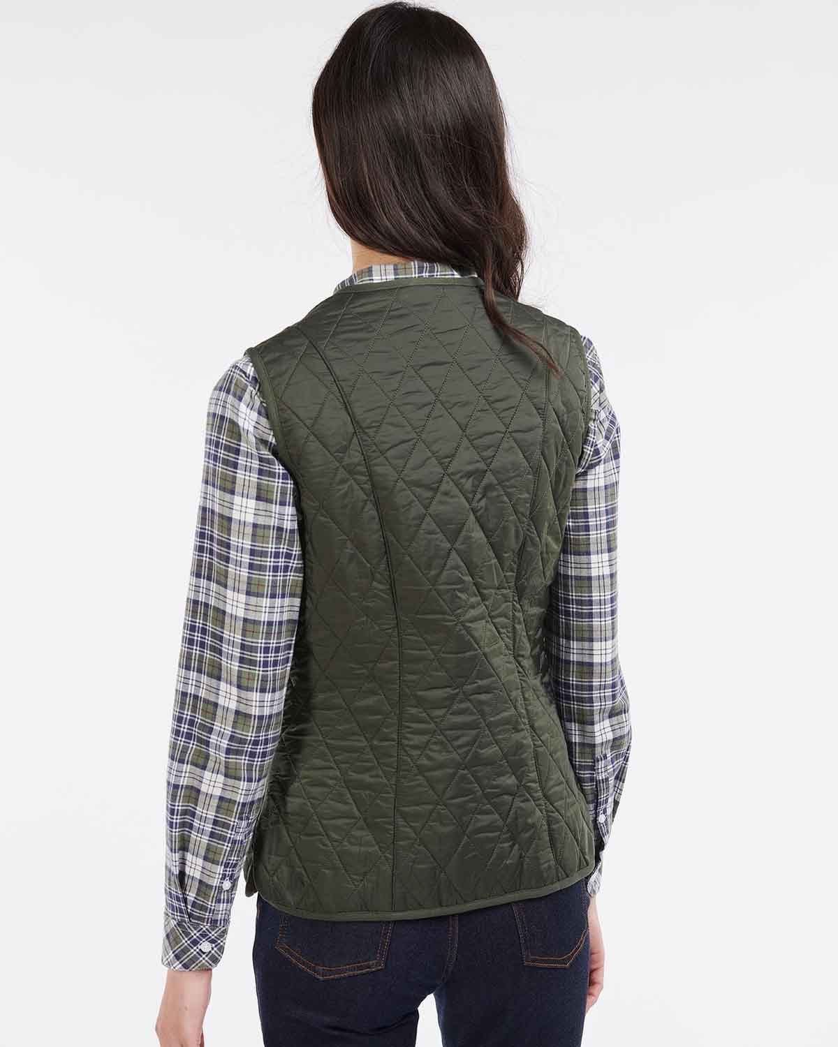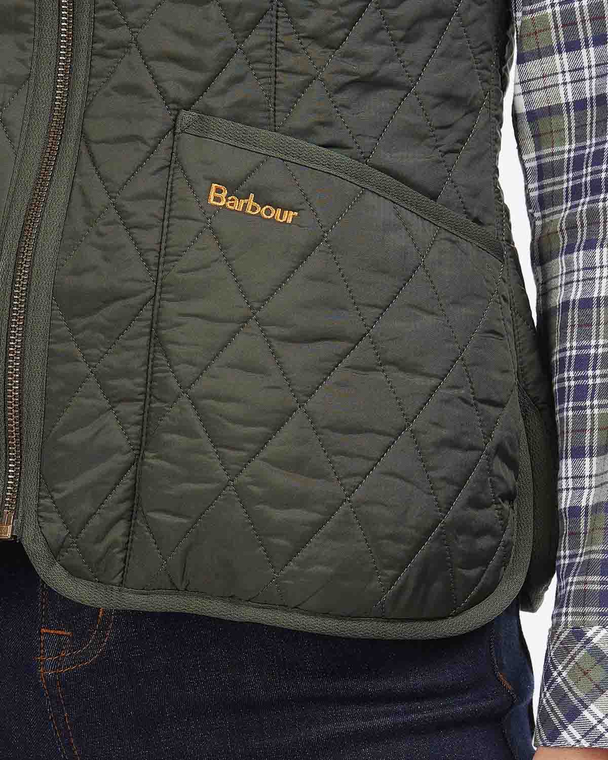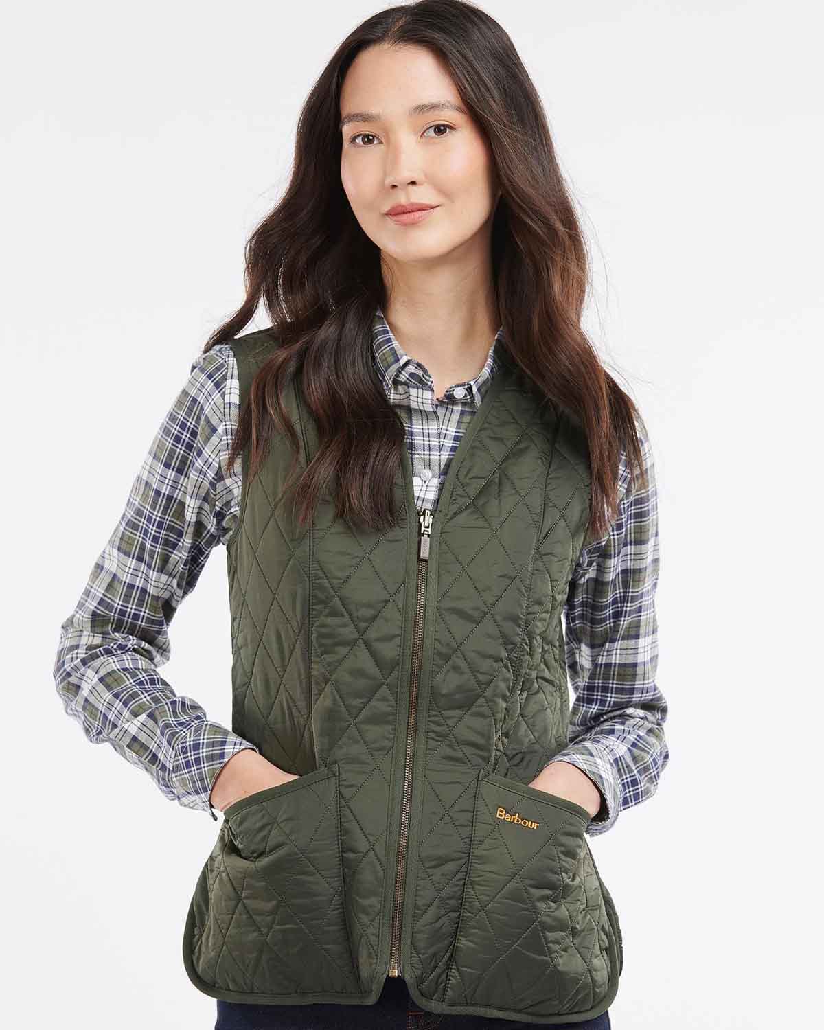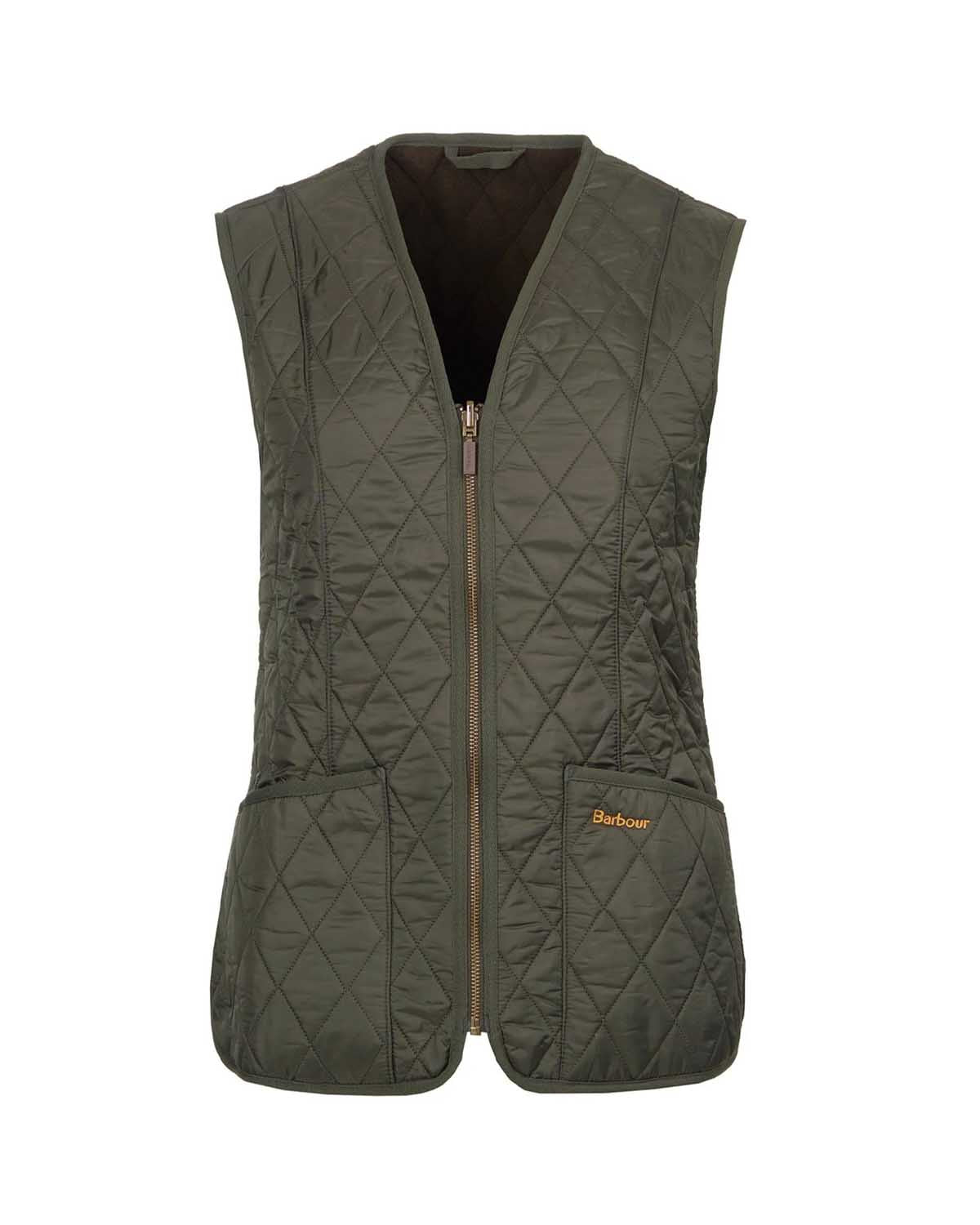 Olivengrønn, quilted vest til dame fra Barbour! Fleece Betty Liner er en tynn vest som passer godt både over en genser og under tykkere jakker på kalde dager. Vesten har flattrende v-utringning, innsvinget fasong, glidelåslukking foran, applikerte lommer i sidene samt gul, brodert logo.