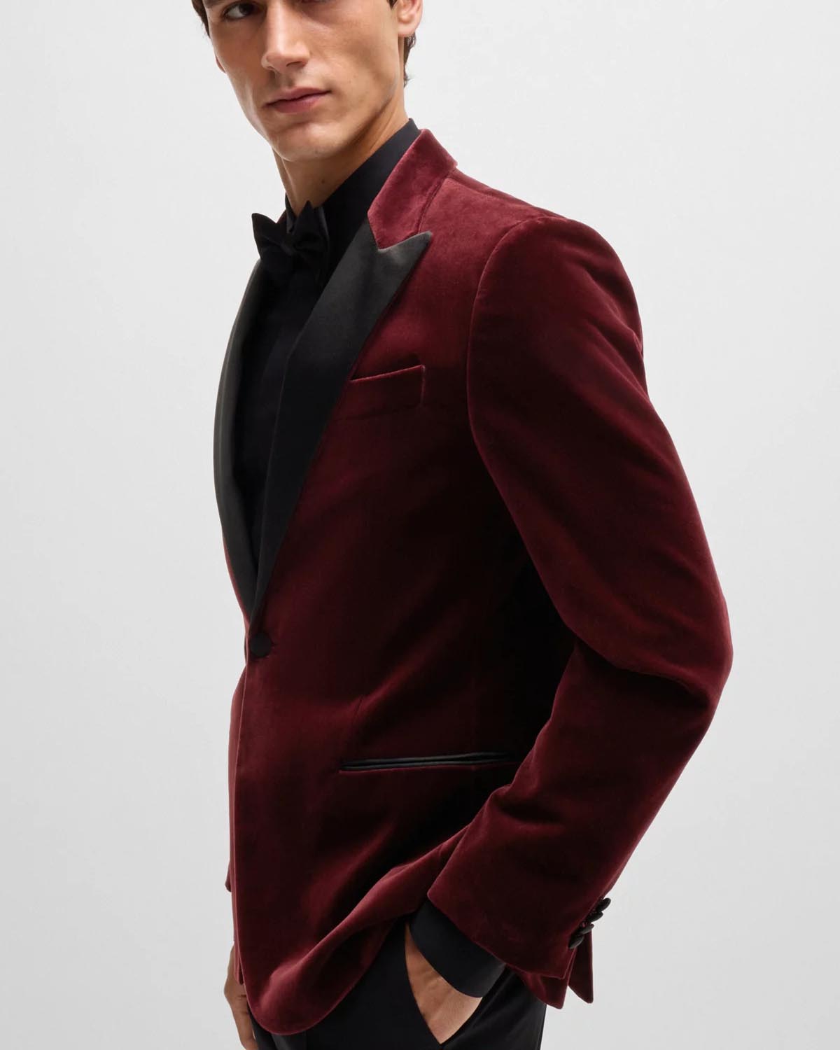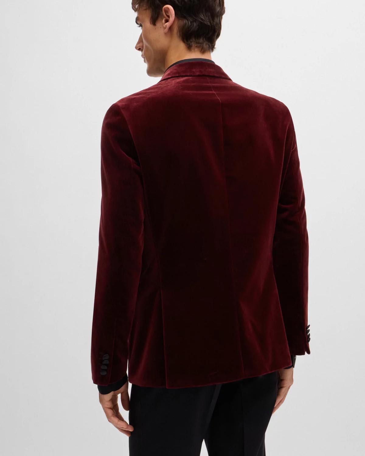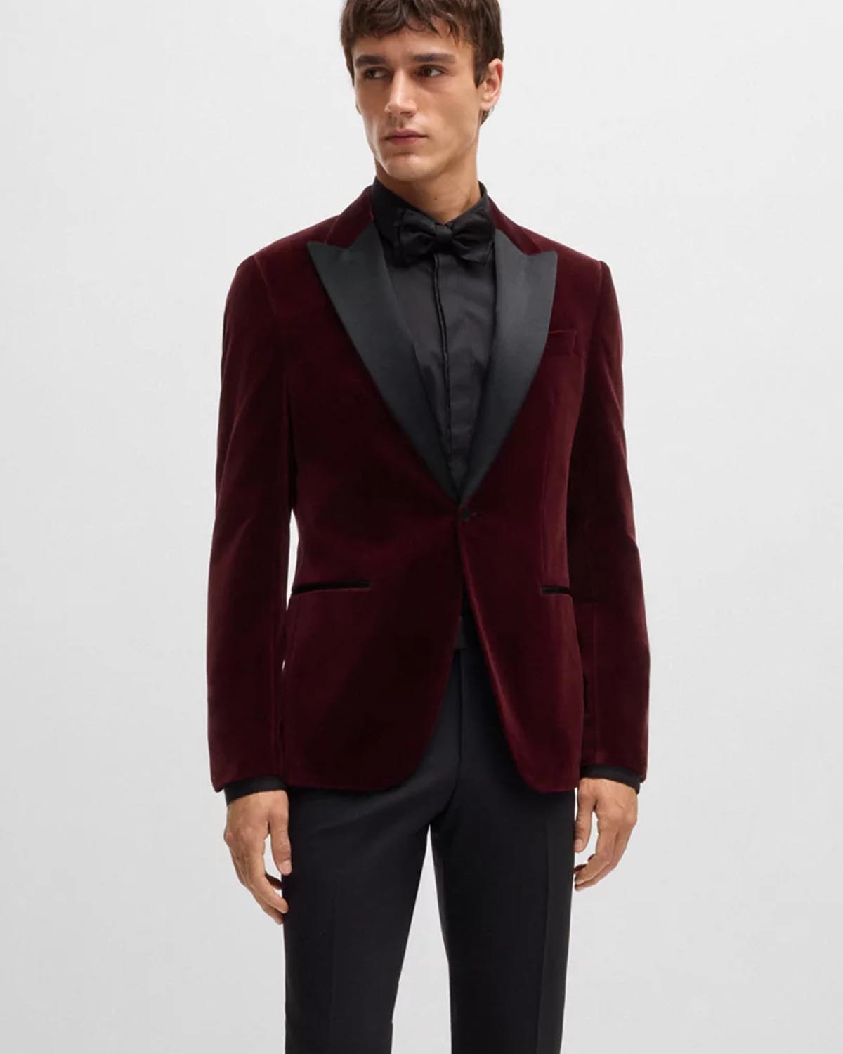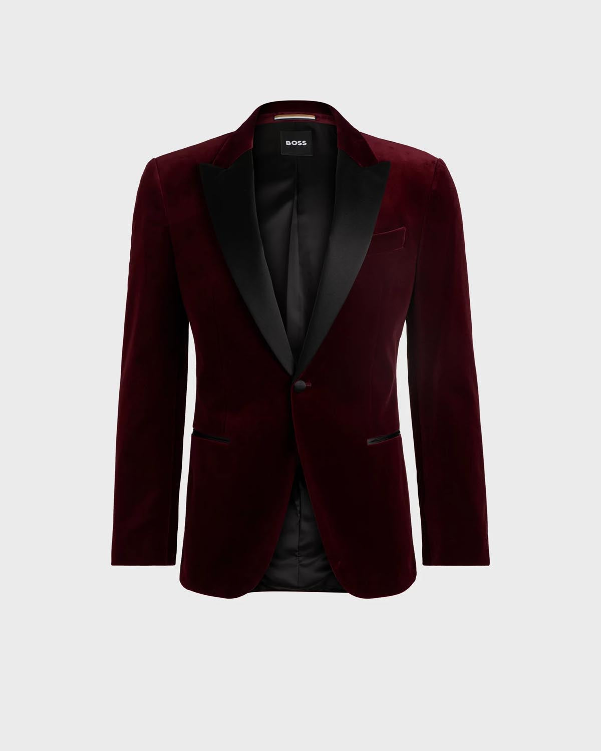 En elegant rød smokingjakke fra BOSS Menswear. Med en enkeltknappslukking er denne raffinerte smokingjakken designet i myk fløyel laget av ren bomull. Silkeblandede aksenter gir et forhøyet preg til dette designet.