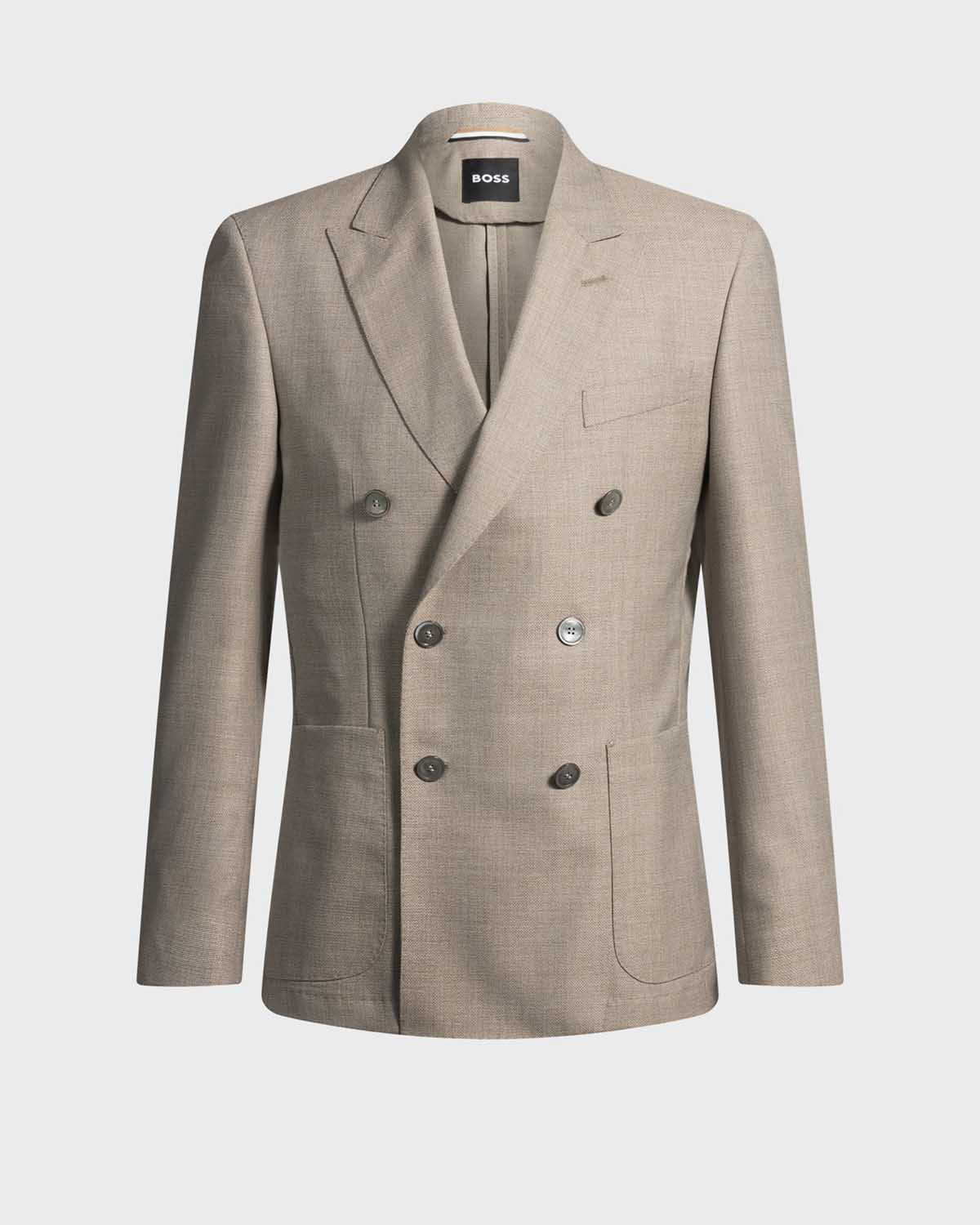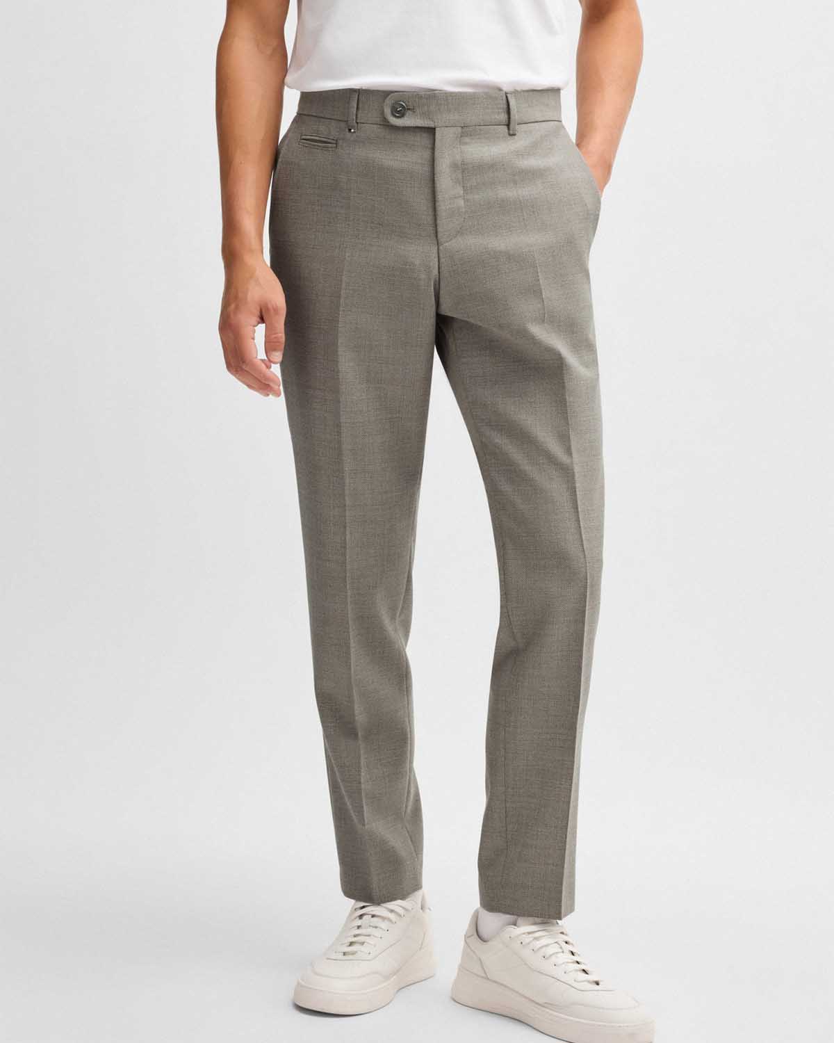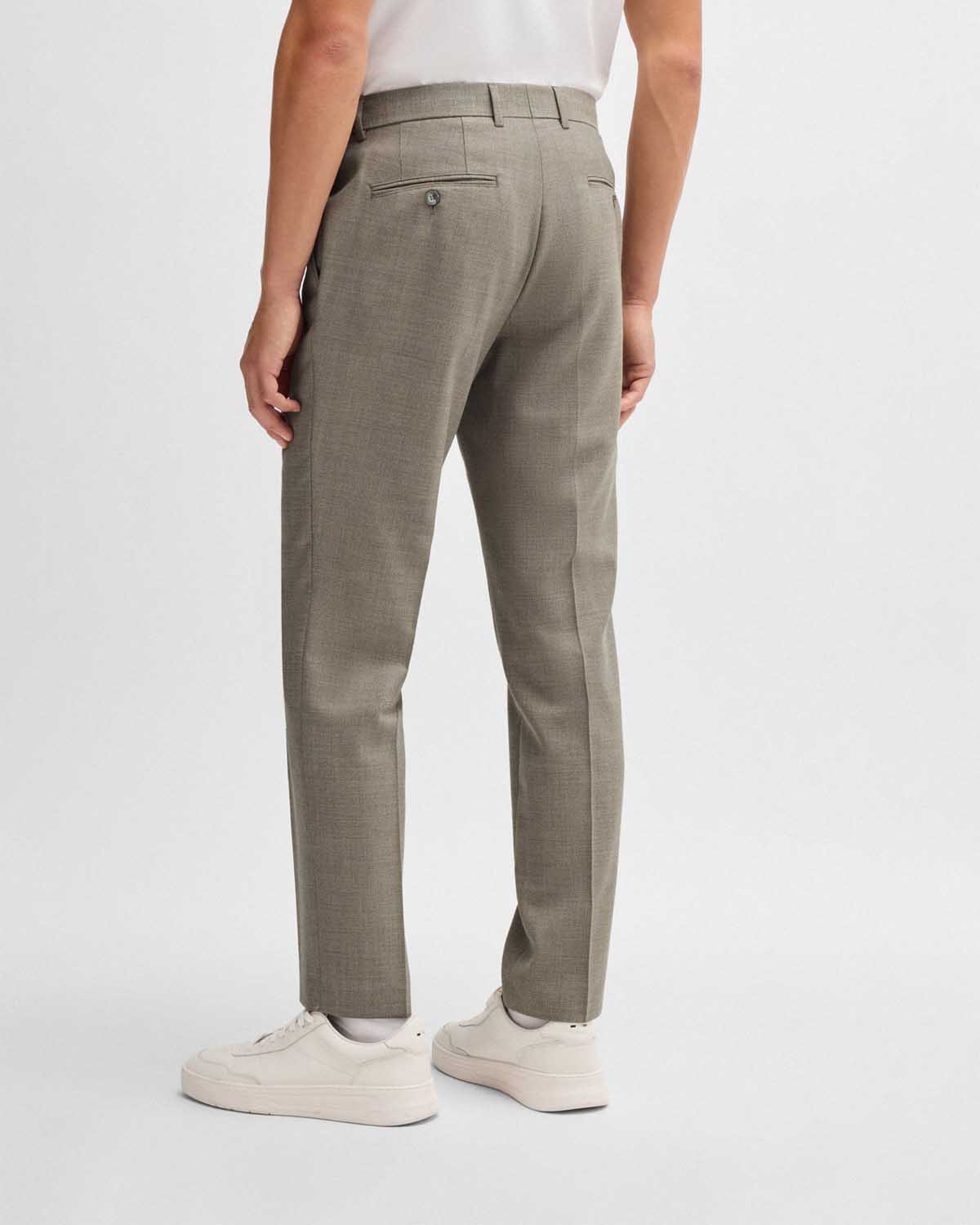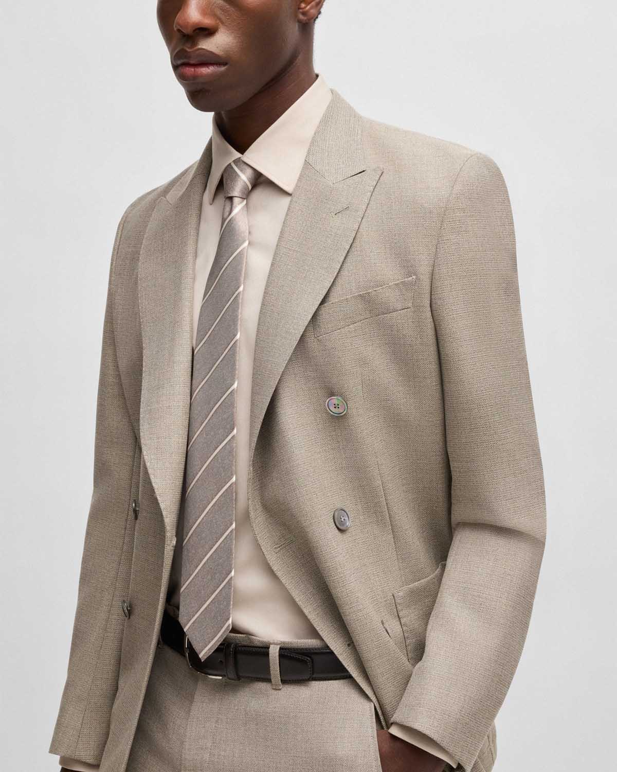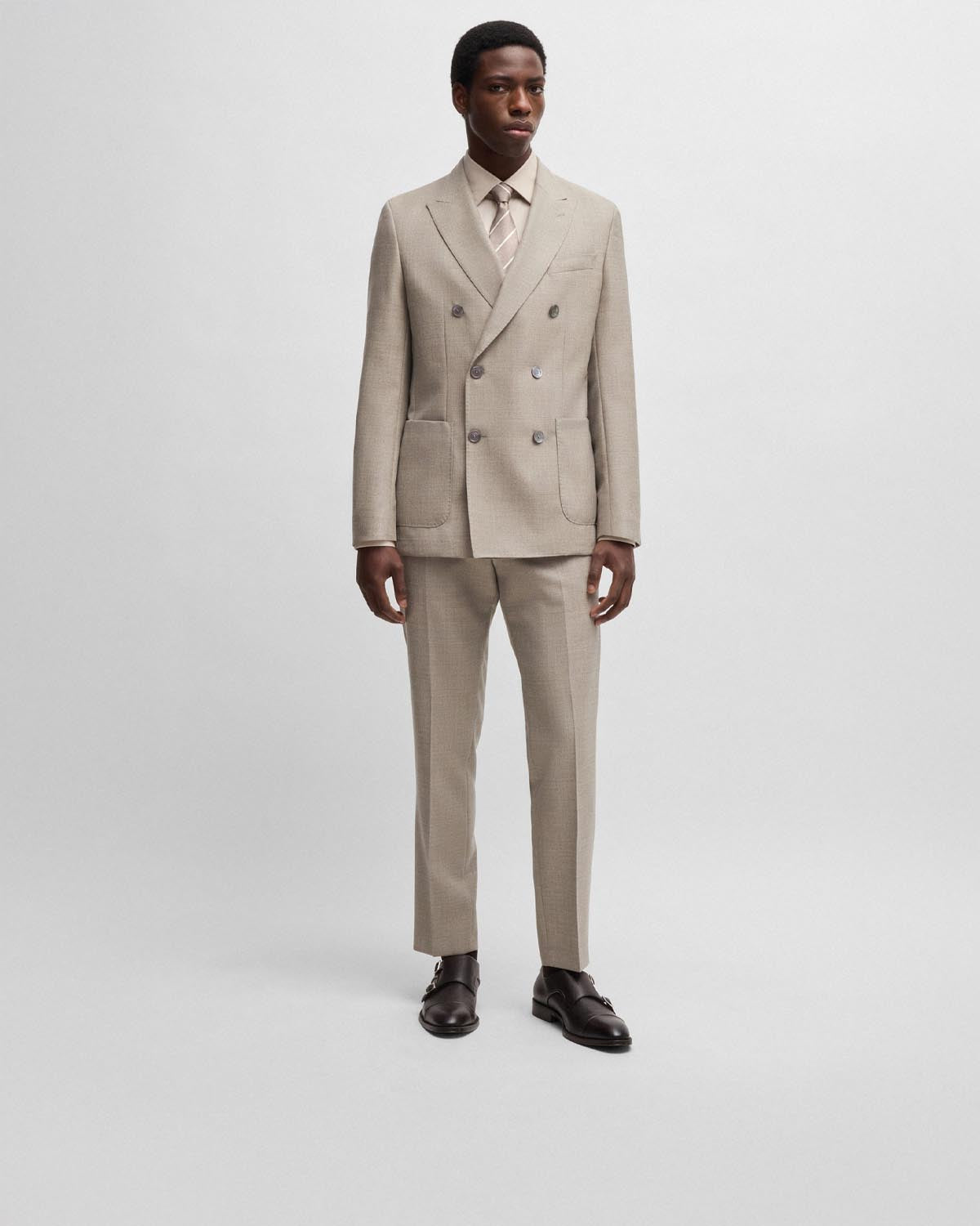 Slim-fit dress i mønstret virgin ull fra BOSS. Med myke skuldre og en definert passform, er denne dobbelsnappede blazeren og høykomfortable buksene designet for et moderne utseende