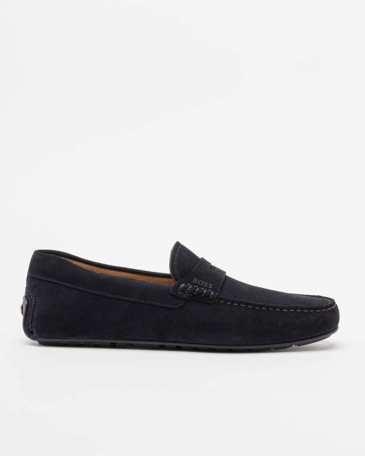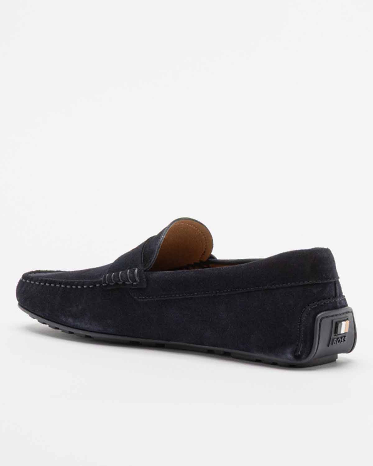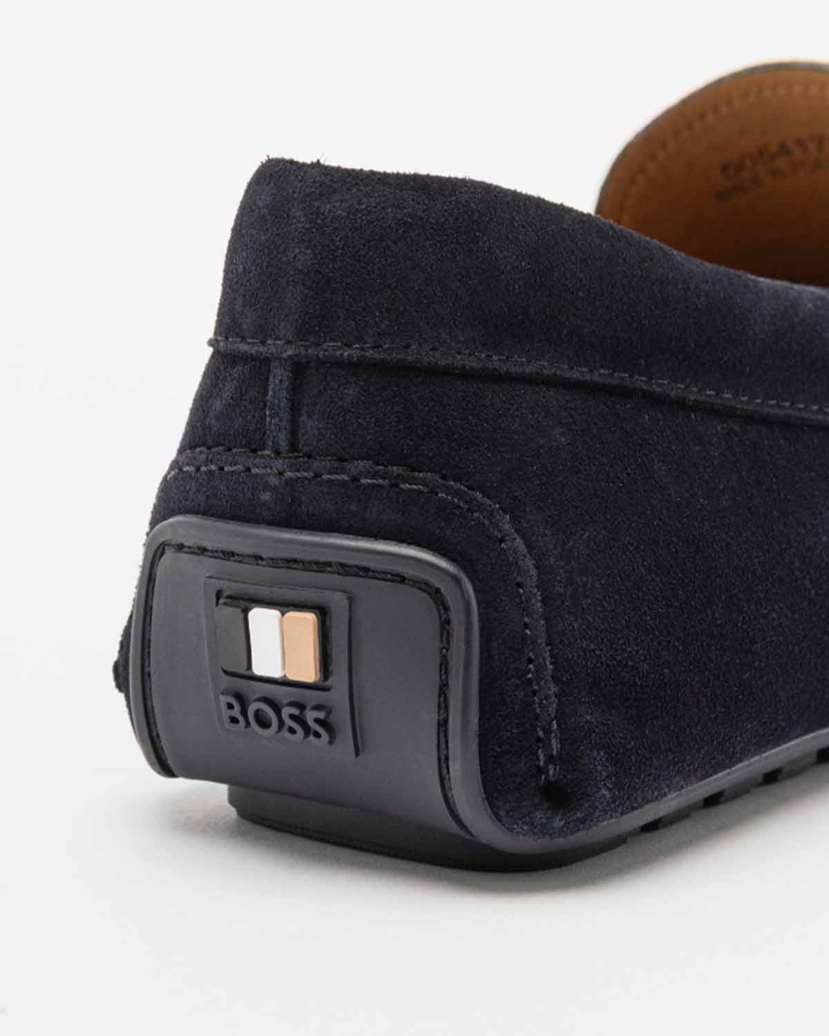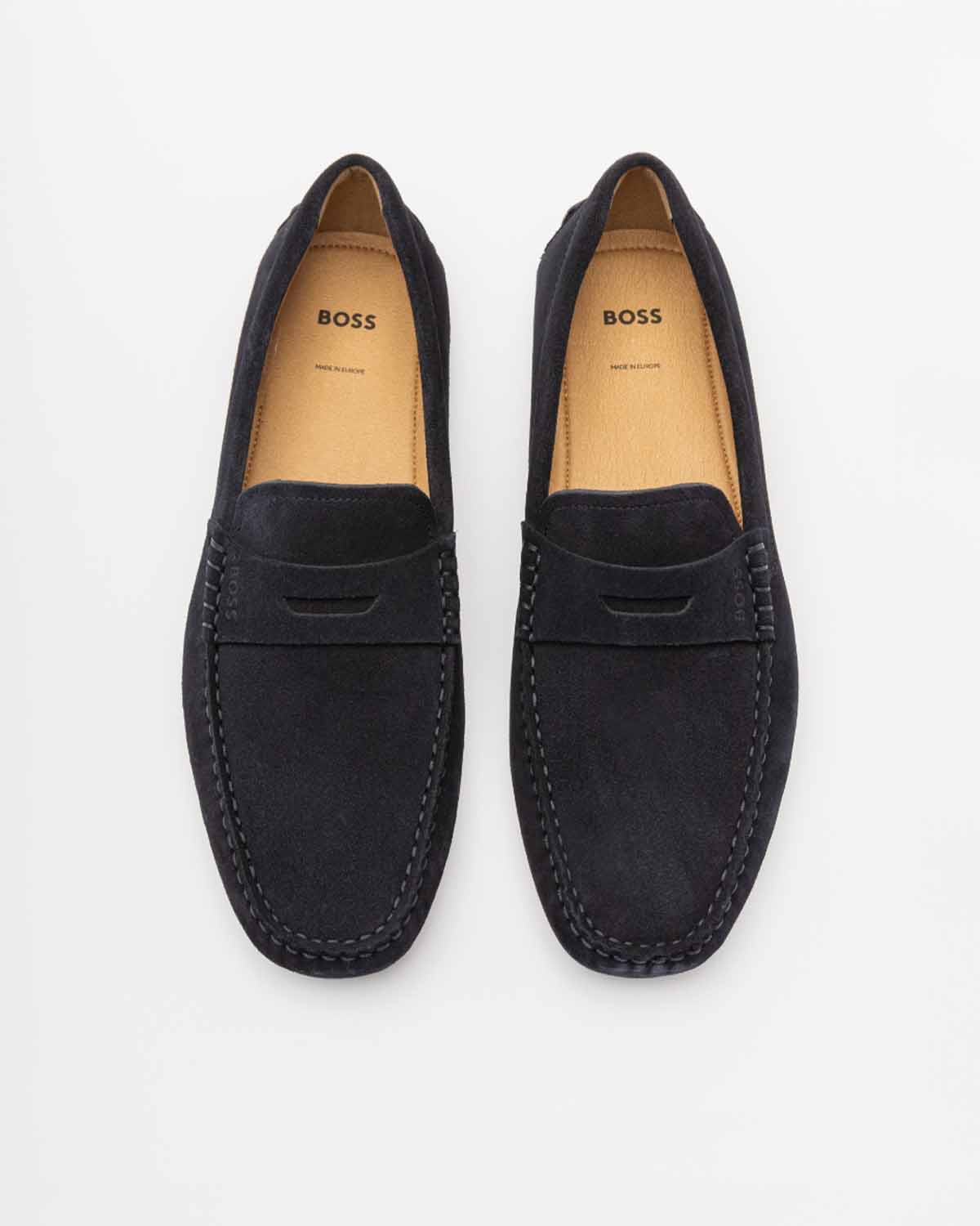 Marineblå loafers laget i semsket skinn med BOSS signaturdetaljer.