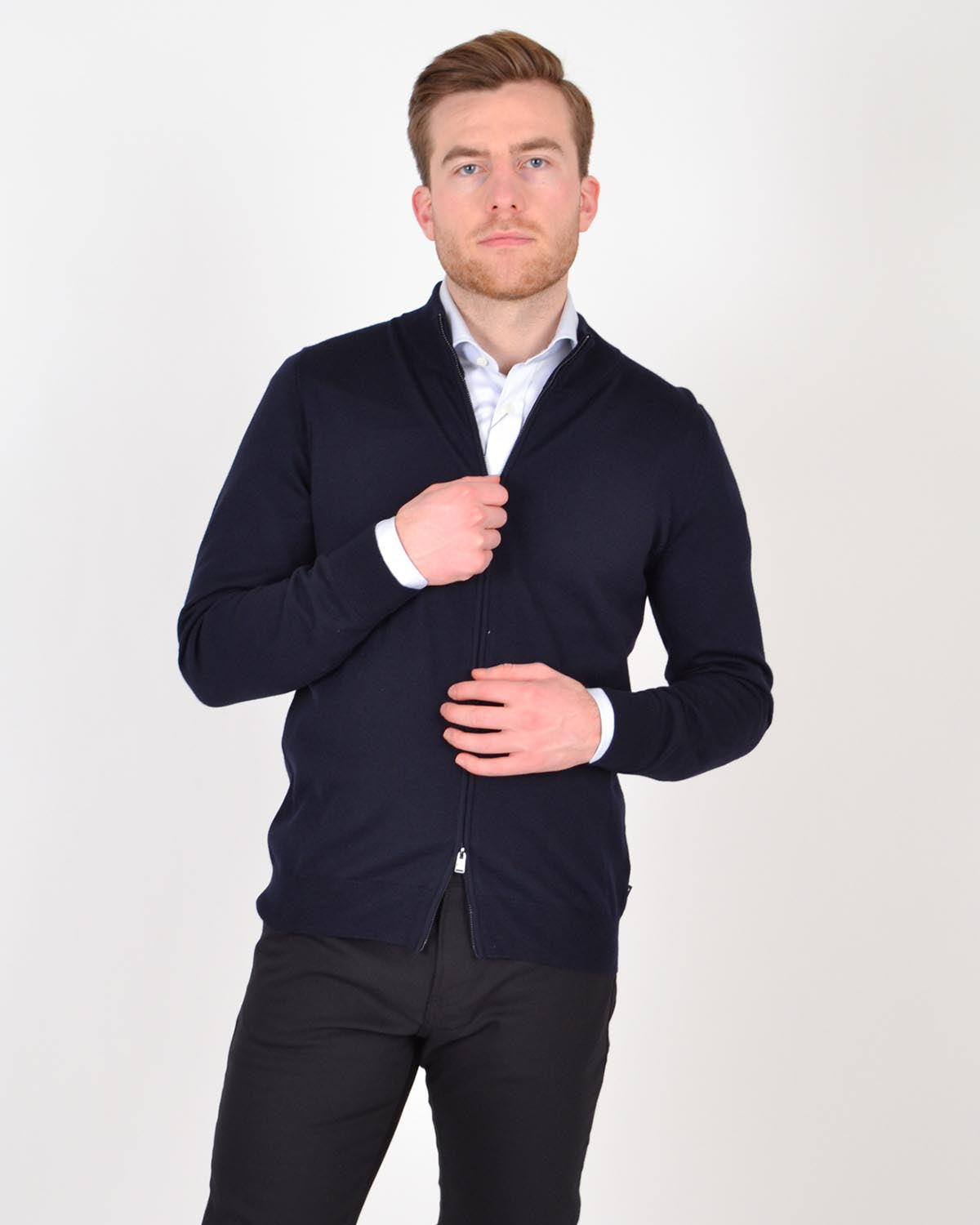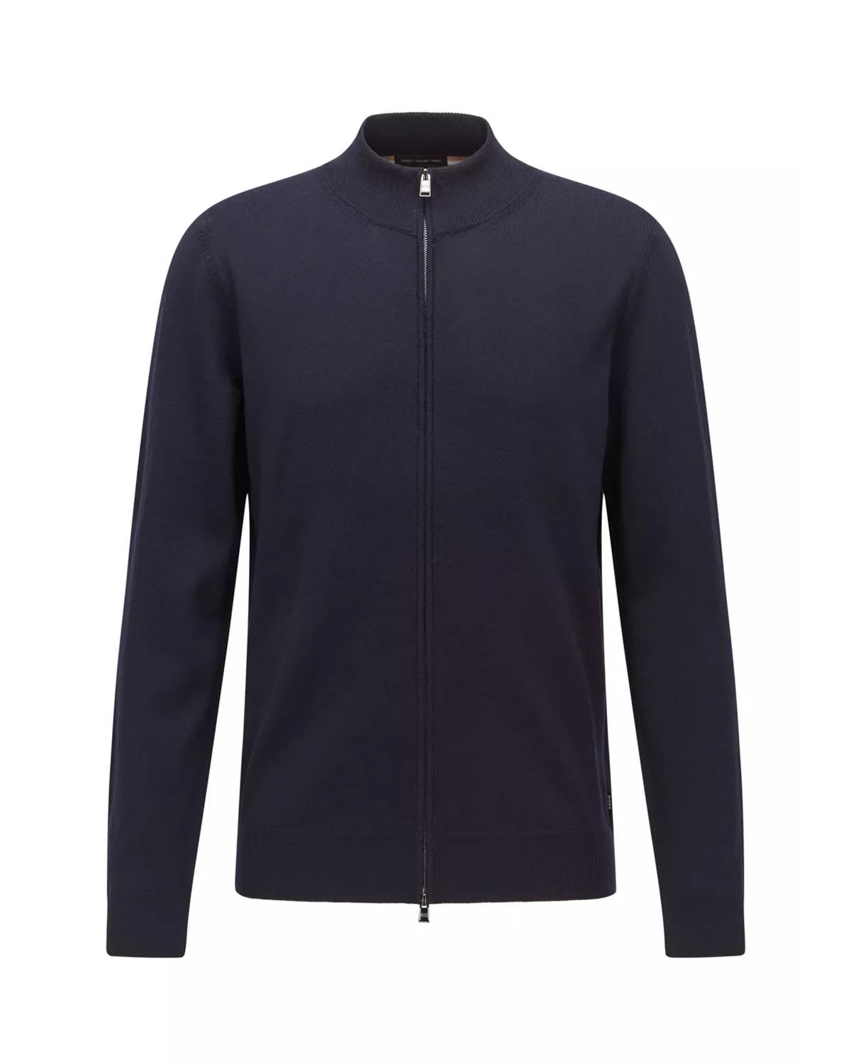 Mørk blå jakke i ull til herre fra Boss. Balonso er en stilren cardigan som enkelt kan styles opp og ned. Jakken har to-veis glidelås, lang erm og ribbestrikkede kanter.
