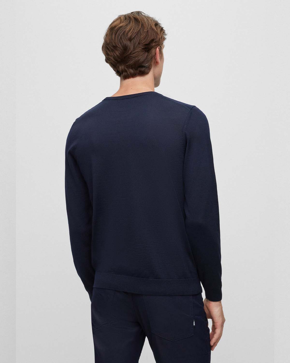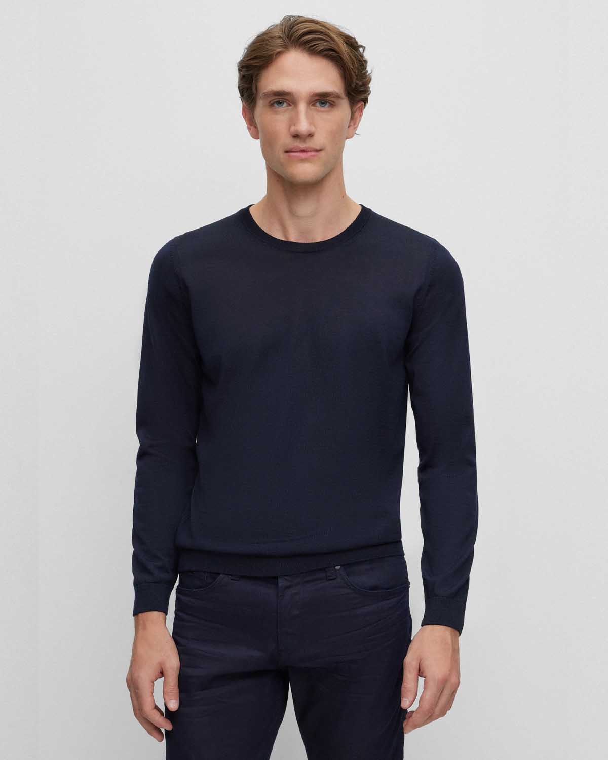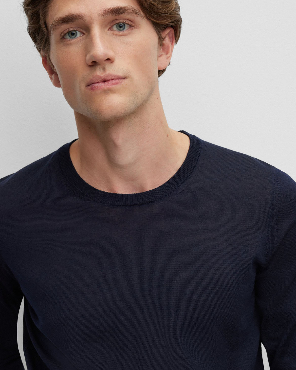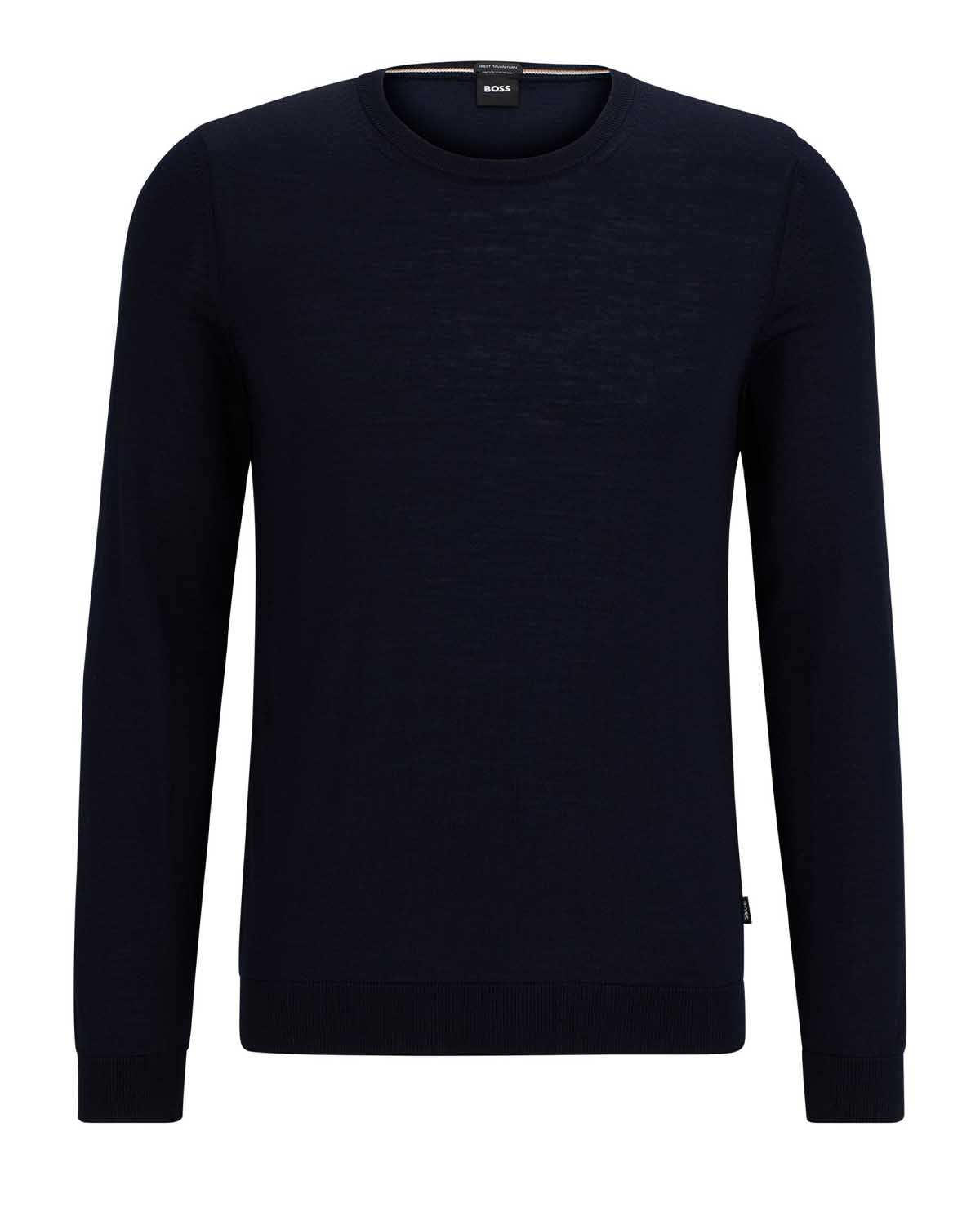 En essensiell genser fra BOSS Menswear. Leno-P er laget i 100 % virgin ull og er detaljert med rund hals, strukturerte sidesømmer og en signaturstripe på den indre kragen.
