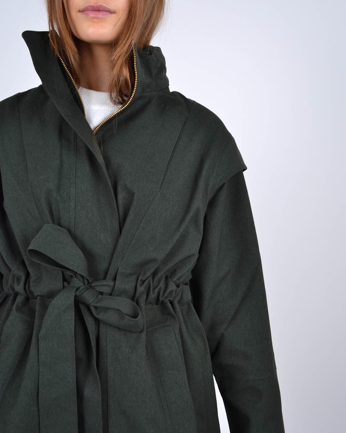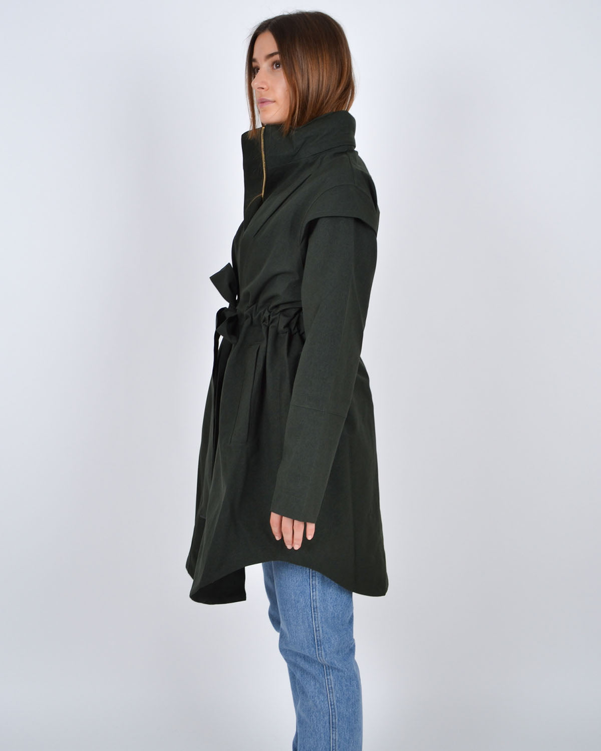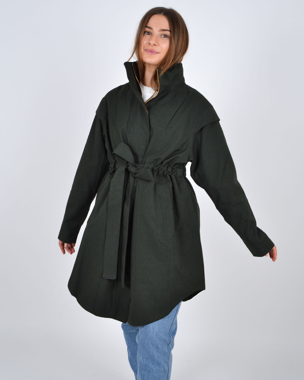 Monsun Coat fra BRGN ble fort en favoritt hos oss i fjor, og nå er den tilbake i denne mørke, delikate grønnfargen! Jakken er vann- og vindtett, og er designet med cap sleeves samt belte i midjen som skaper en tøff fasong. Med skjult hette i krage, enkle sidelommer og brystlommer samt glidelås og magnetiske knapper er den også prakitsk i tillegg til å være fin!