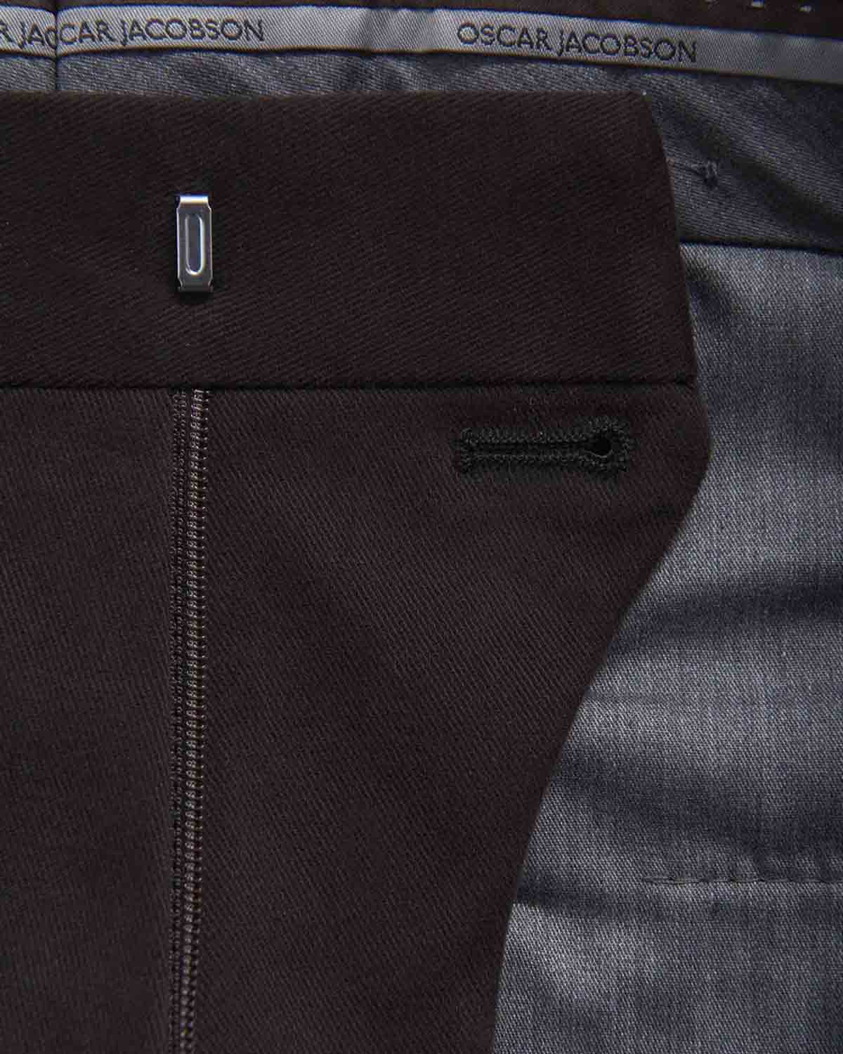 Mørkebrun bukse fra Oscar Jacobson. Denz Chinos Turn Up Trousers er en populær bukse med middels høyt liv, smale ben og stilrent uttrykk. Buksa er like fin til hverdags som fest, og kan enkelt pyntes opp og ned etter anledning.