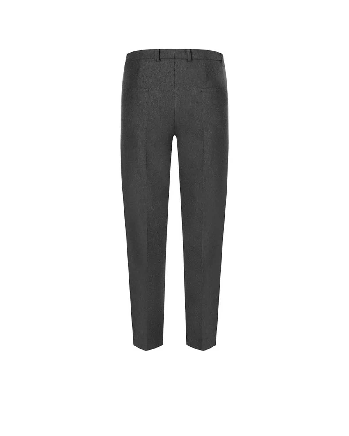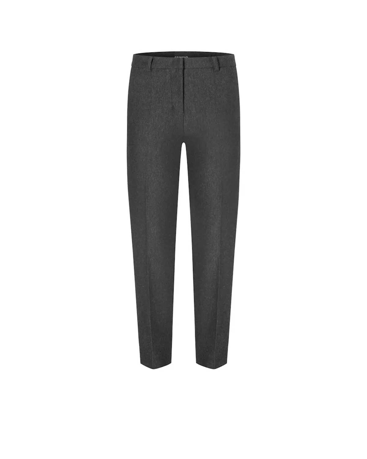 Cambio Krystal Dark Grey Melange. Krystal er en fin buksemodell med ankellange ben. Myk og god å ha på. Buksen har en rett fasong med skrålommer i front, jukselommer bak og ankellange ben med liten splitt i sidene. Lukkes med hempe, knapp og glidelås i front.