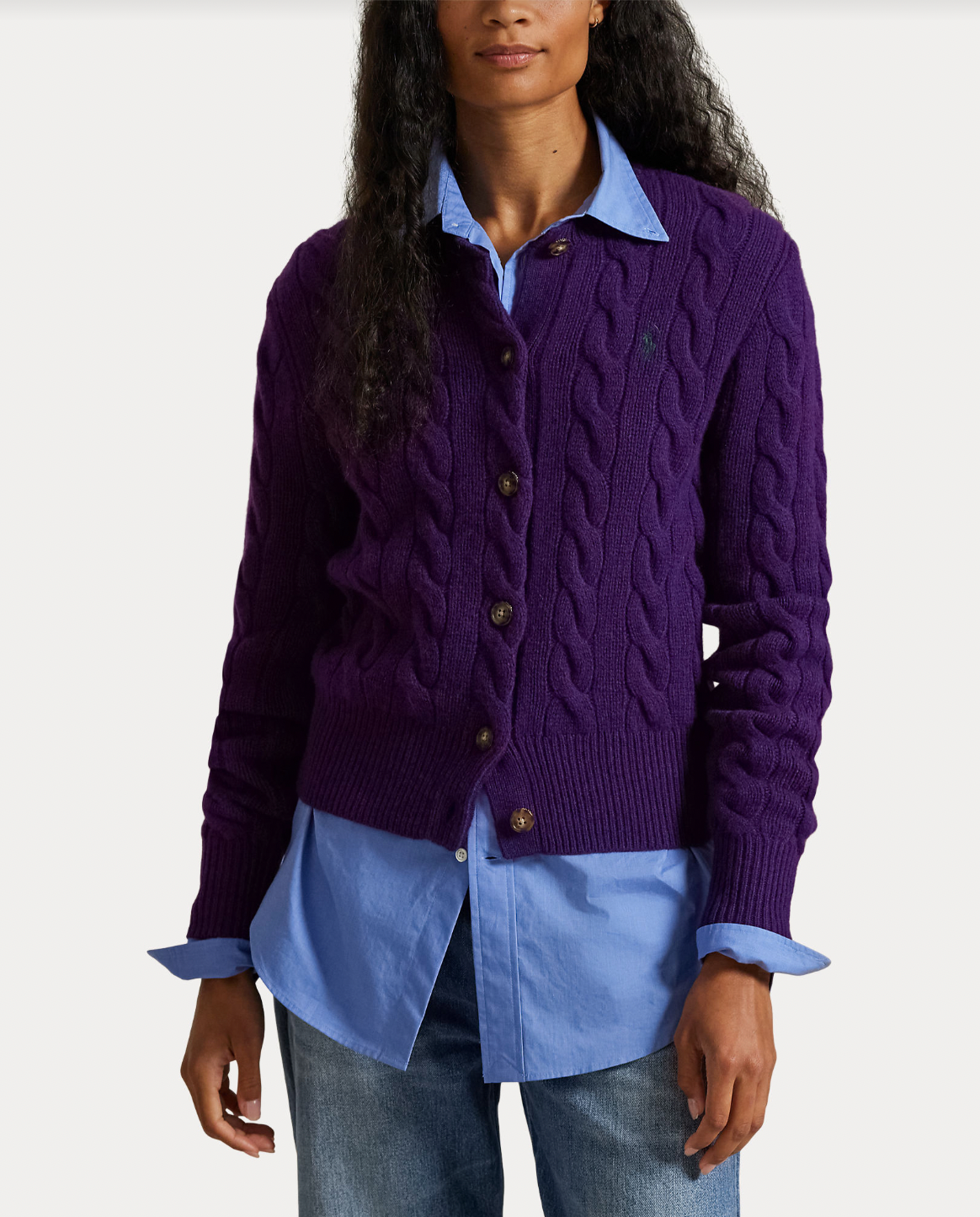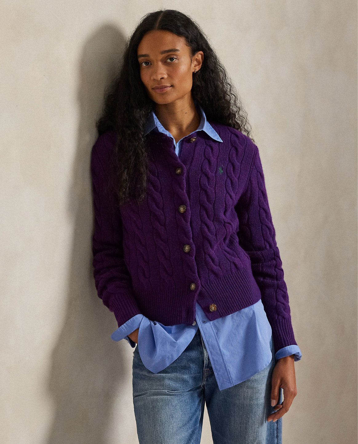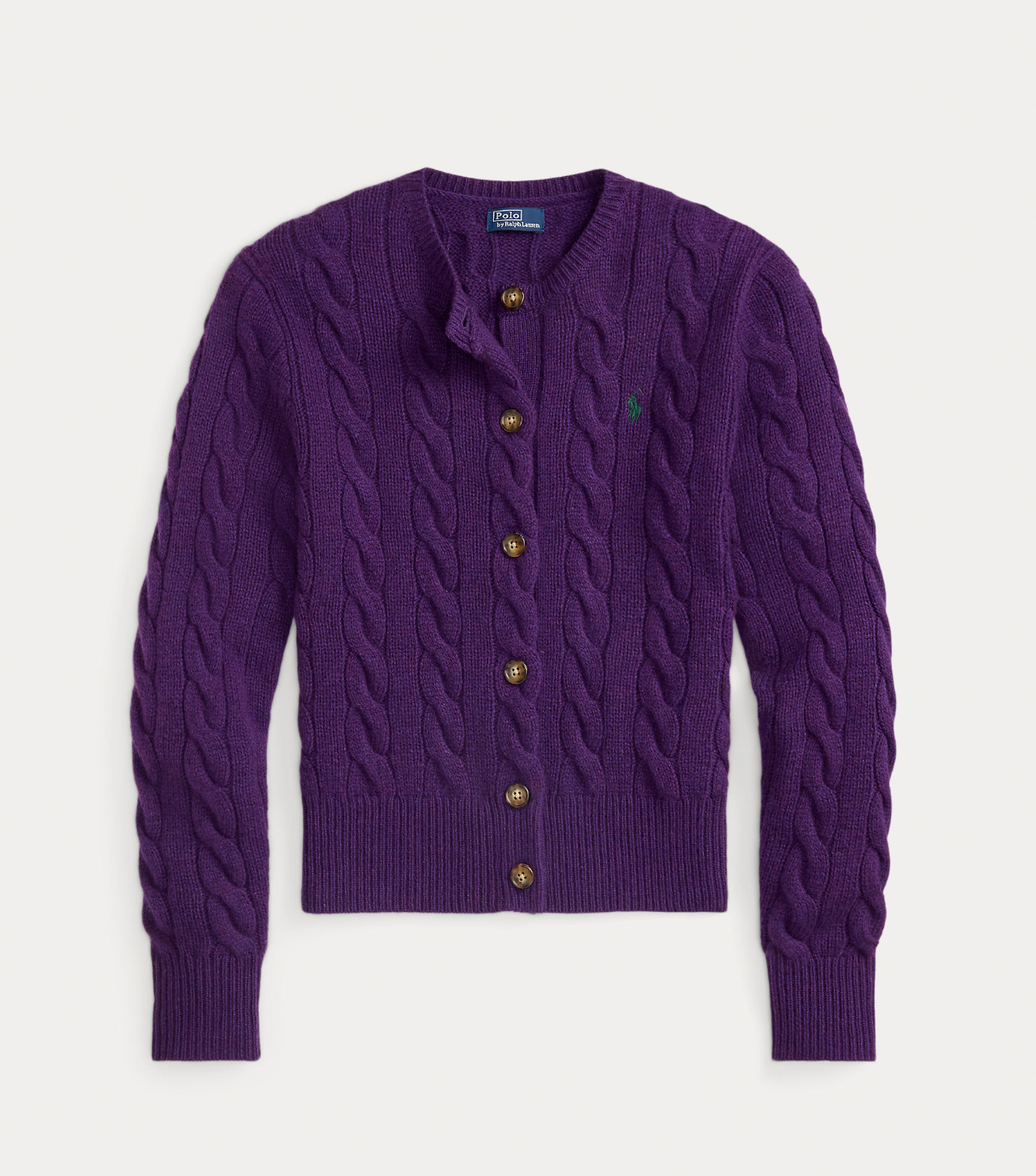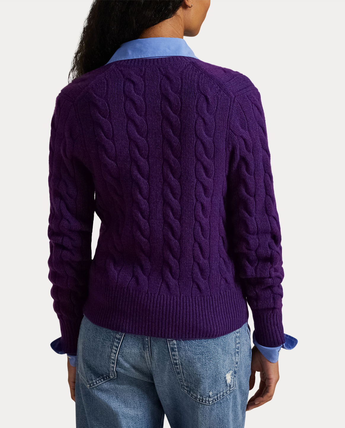 Polo klassisk kabelstrikket cardigan i en myk blanding av italiensk ull og kardet kashmir. Cardiganen har knapper, rund hals og signaturbroderte ponni på brystet.
