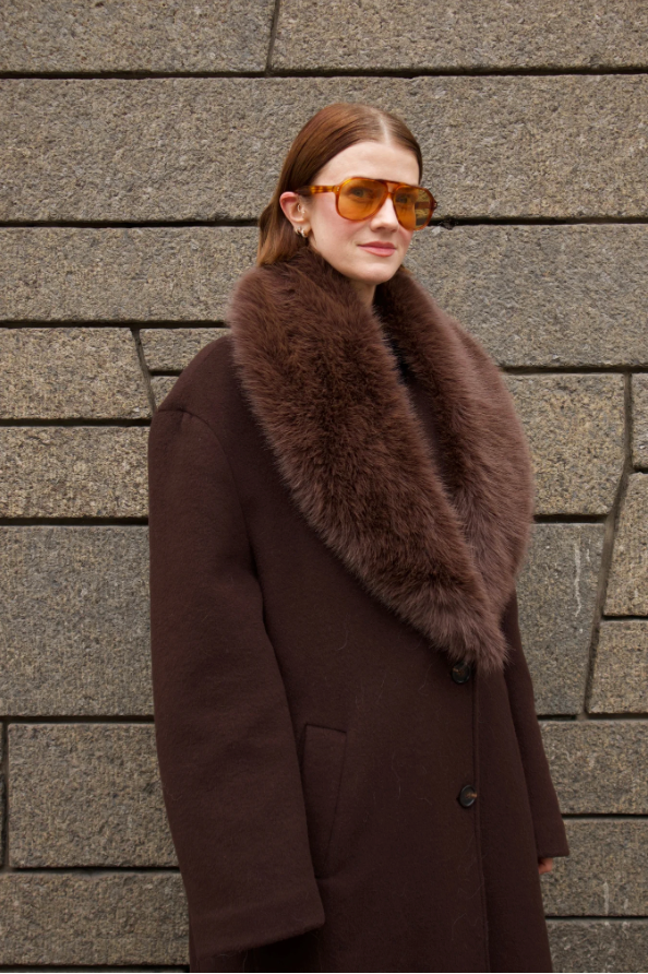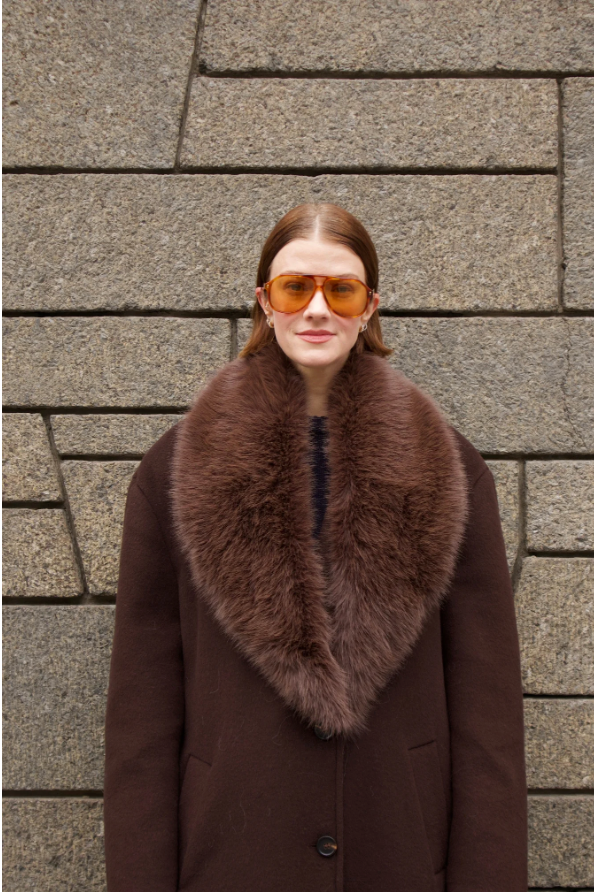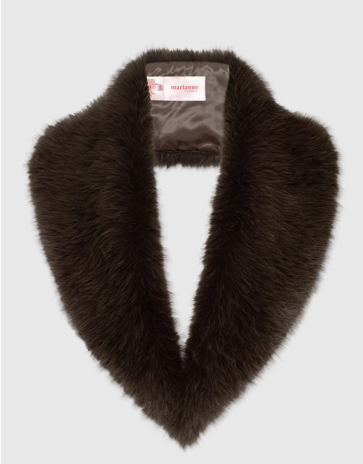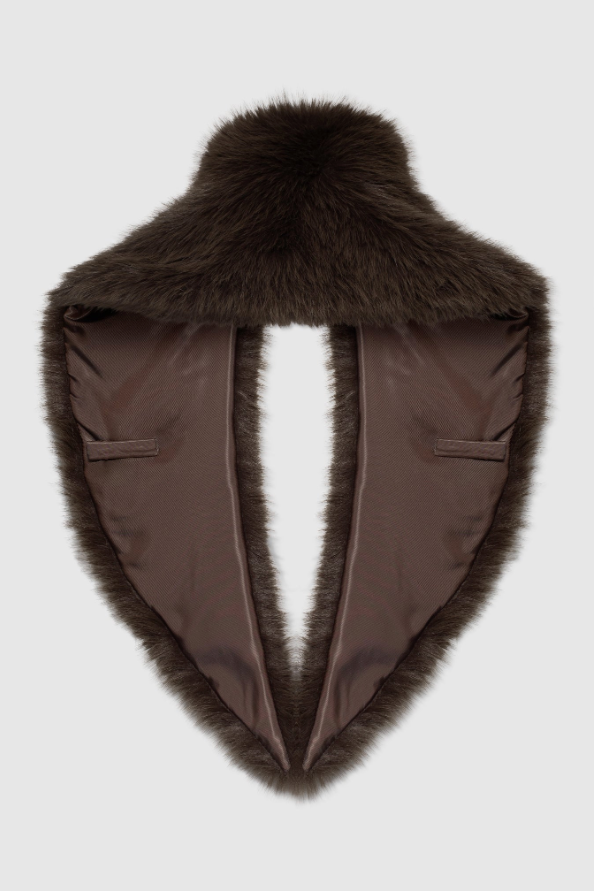 Trude-kragen er laget av fuskepels, og har to spenner slik at du enkelt kan feste dem på kåpen eller blazerkragen. Kragen kan også brukes separat over gensere eller krageløse kåper og jakker - bare for moro skyld.