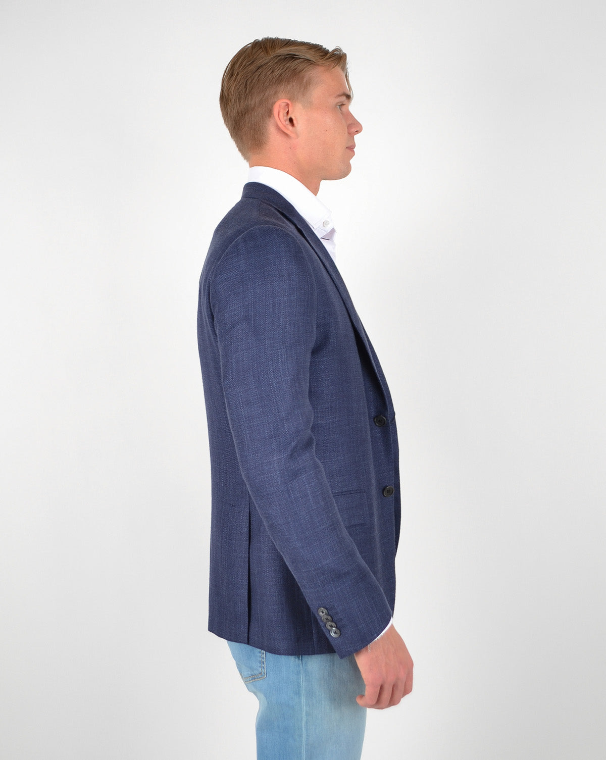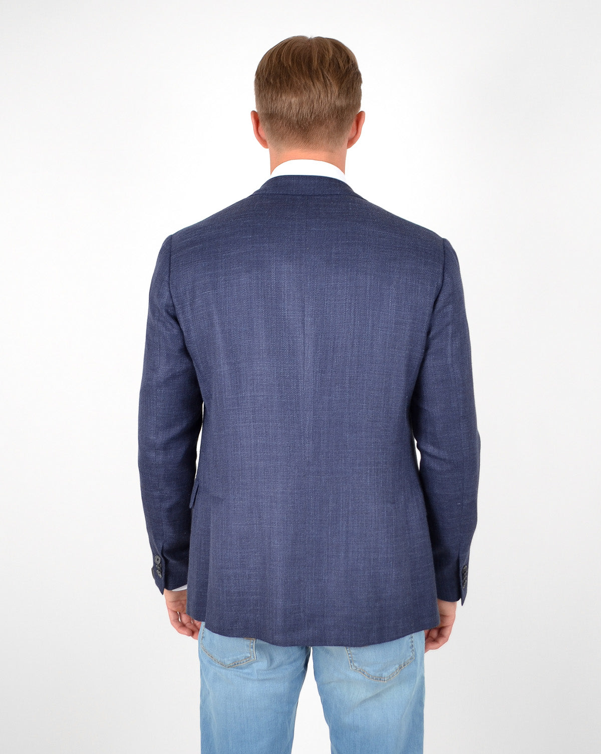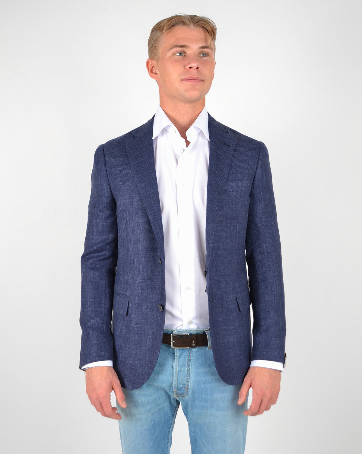 Blå enkeltspent blazer fra Corneliani, håndlaget i Italia. Giacca har knappestolpe og klafflommer.