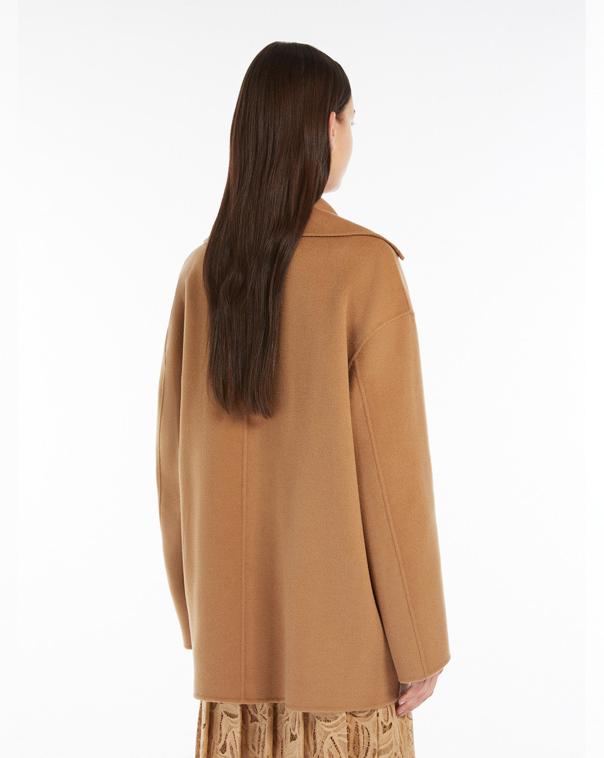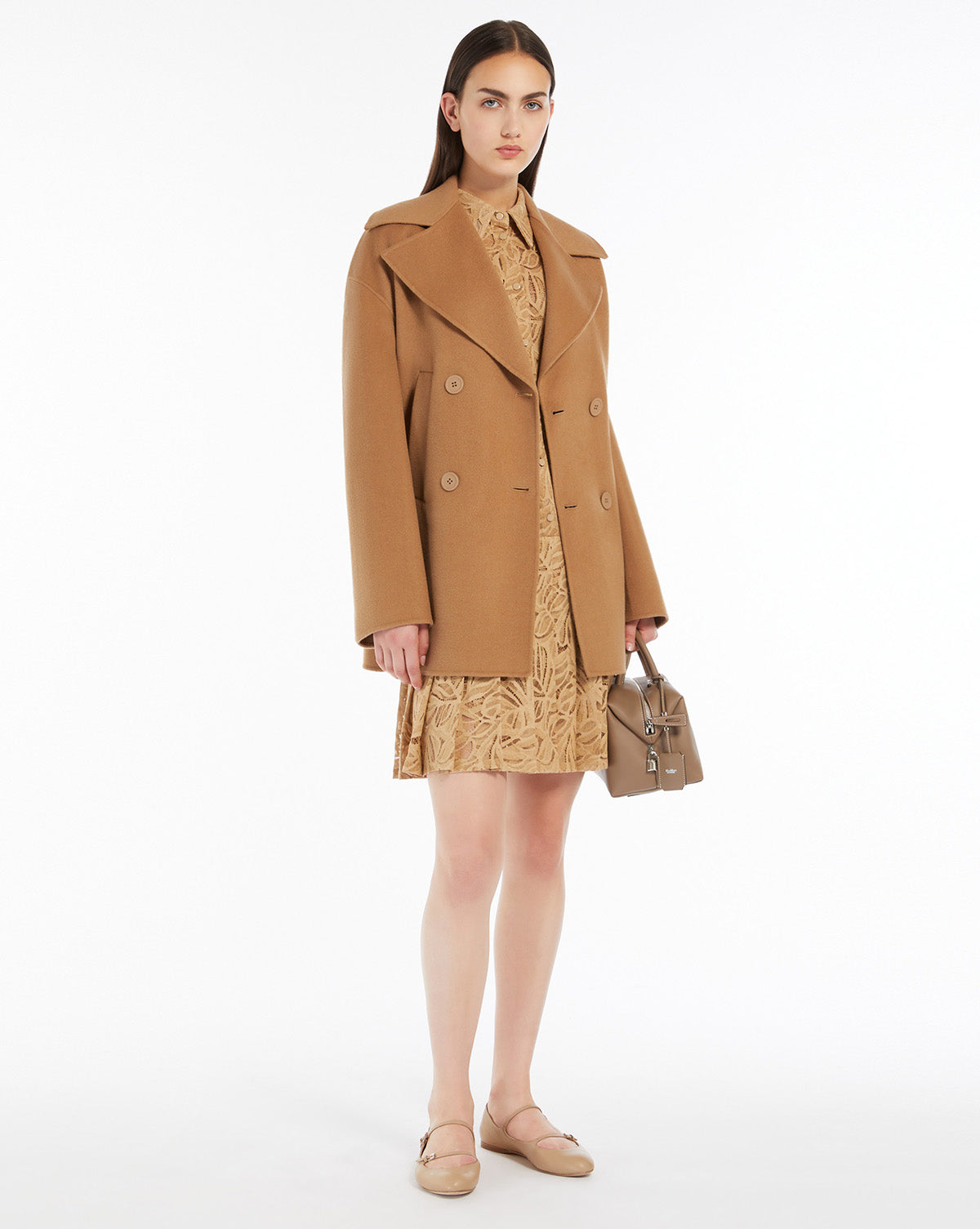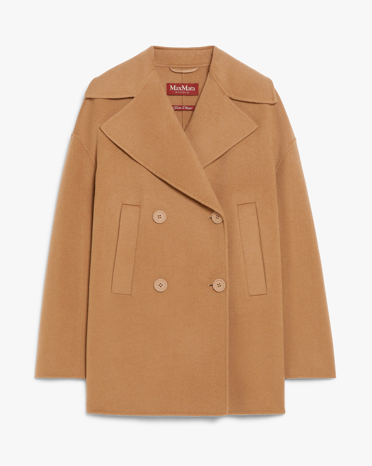 Dobbeltspent kåpe i luksuriøst ren ull, kashmir og silke. Komfortabel stil med en bred jakkekrage, lange lavtsatte ermer og passpolerte lommer foran. Synlig feste med fire knapper.