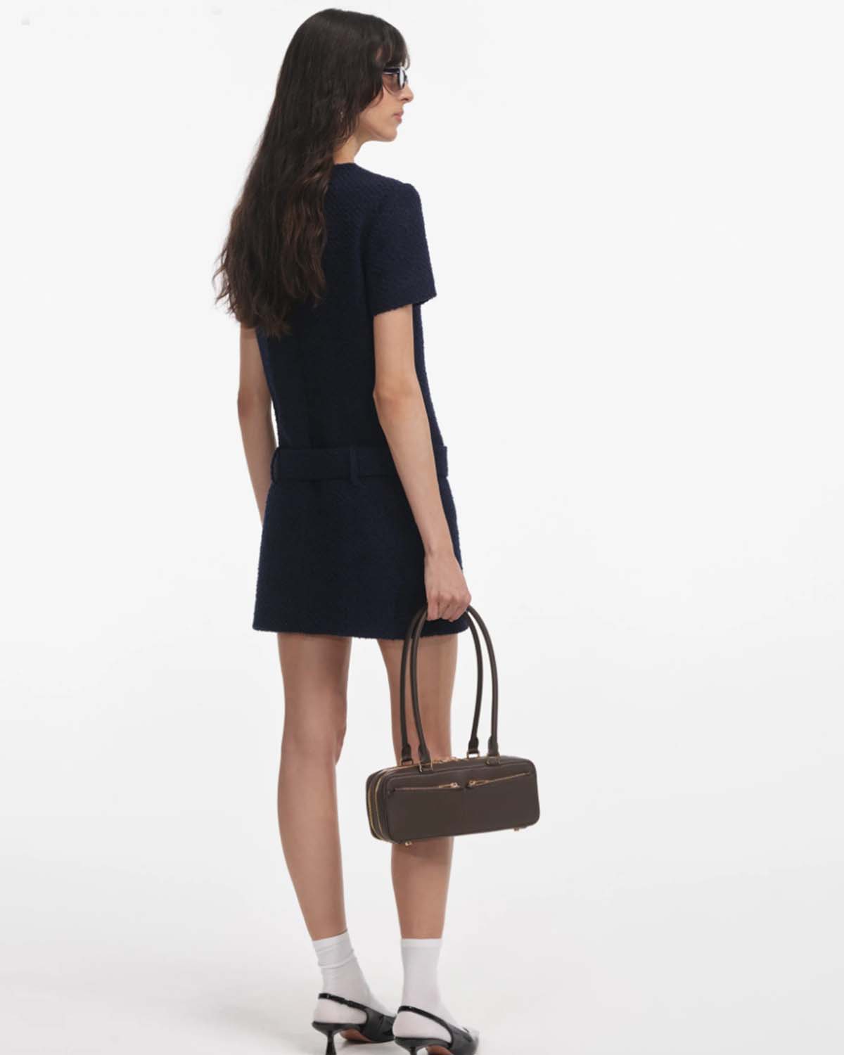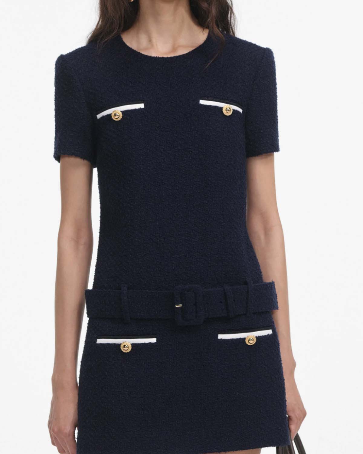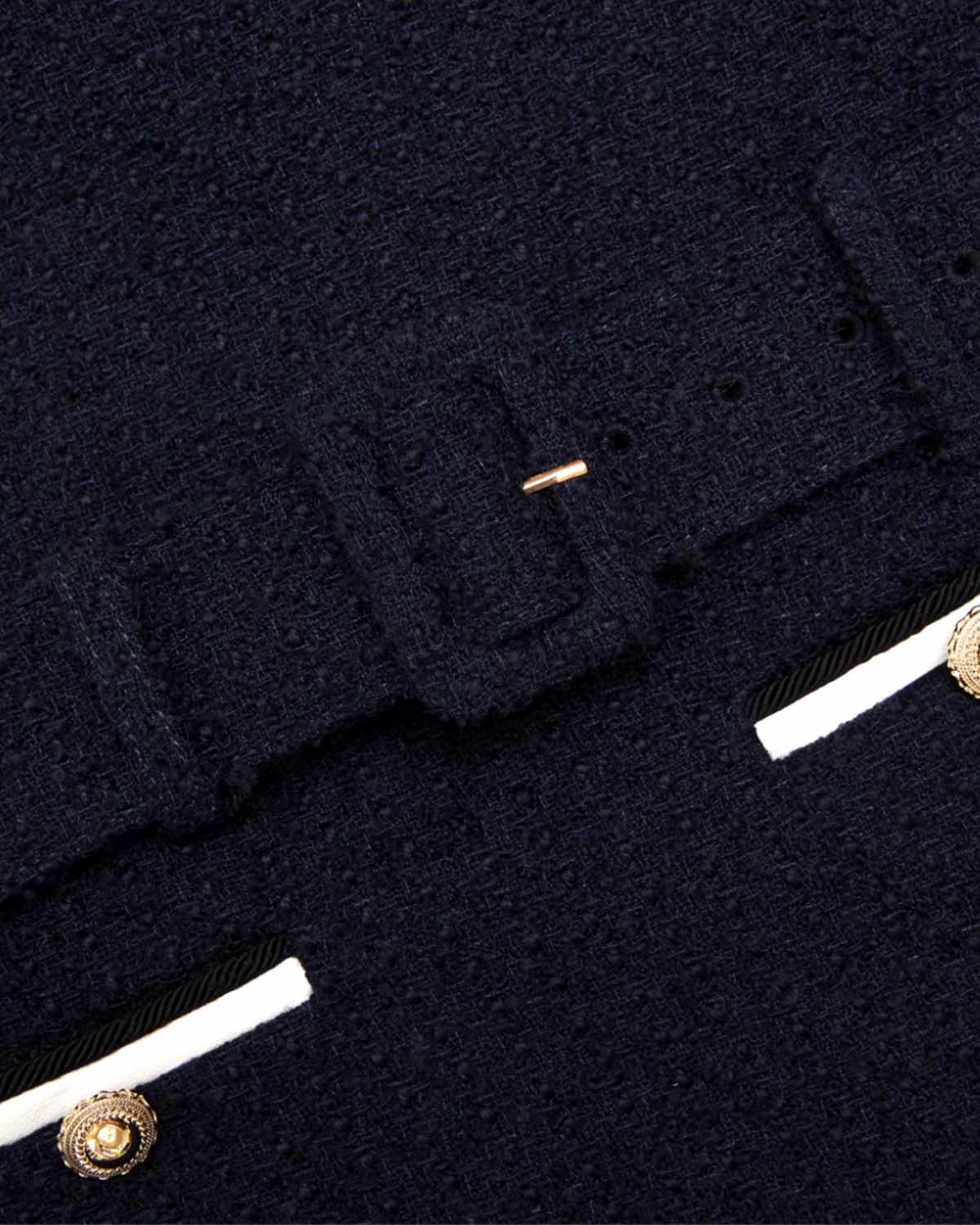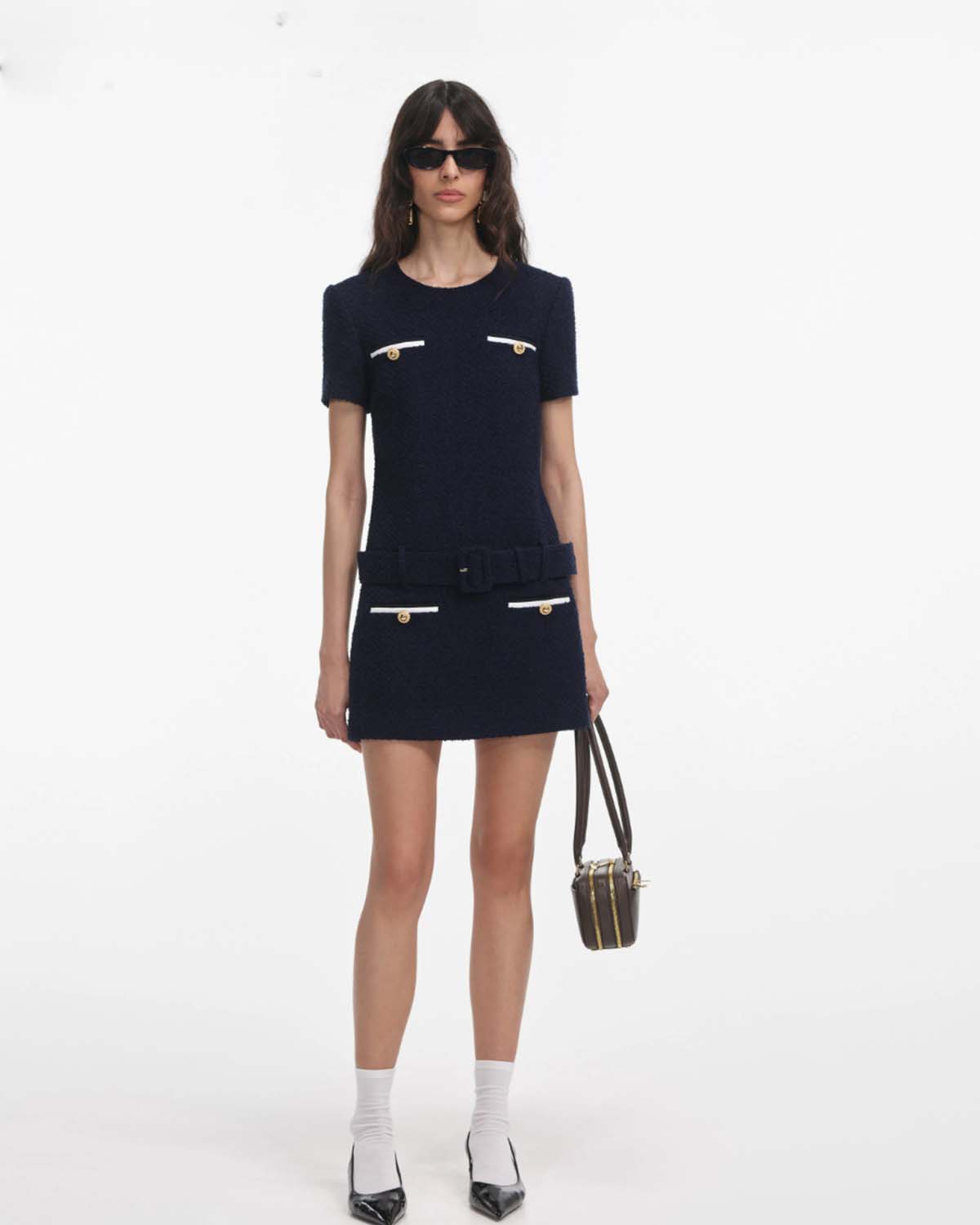 Marineblå minikjole i bouclé, full av preppy sjarm med gullknappdetaljer. Et tonalt belte gir definisjon til midjen – kombiner med loafers for dagen og hæler om kvelden.