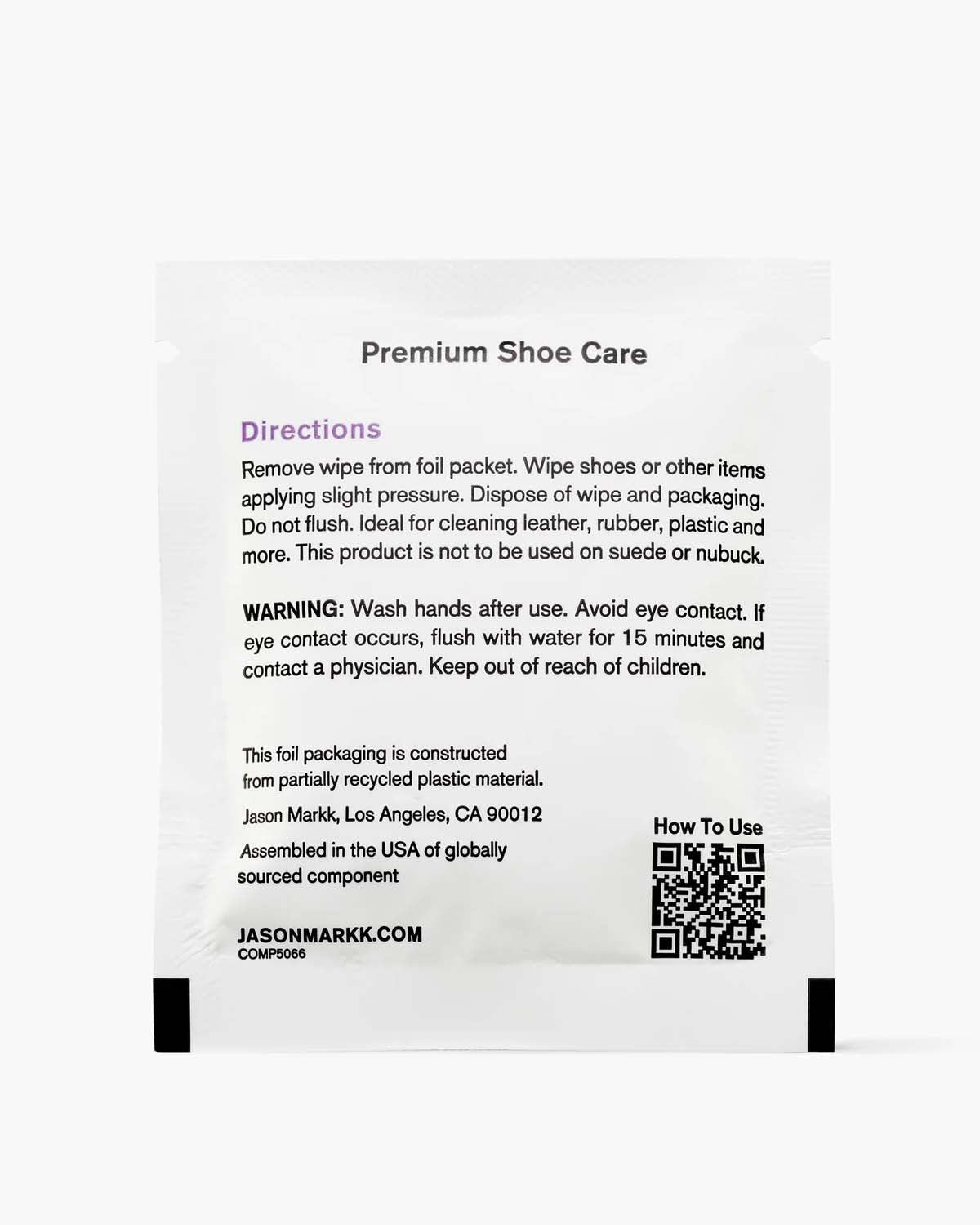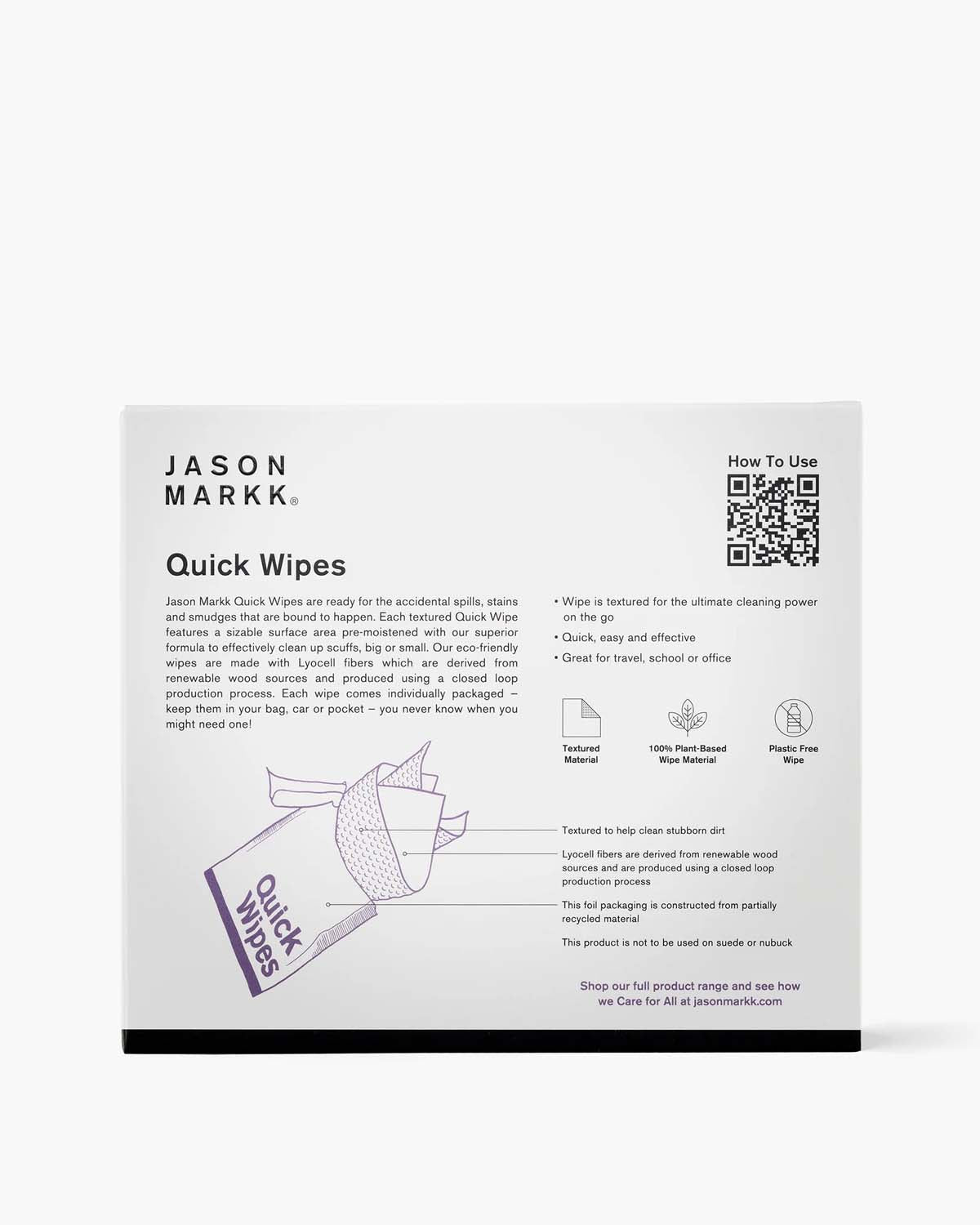 Jason Markk Quick Wipes er klare for utilsiktede søl, flekker og smuss som garantert vil skje. Hver teksturerte Quick Wipe har en overflate som er forhåndsfuktet med deres overlegne formel for effektivt å rengjøre flekker, store eller små. De miljøvennlige våtserviettene deres er laget med lyocellfibre som er utvunnet fra fornybare trekilder og produsert ved hjelp av en lukket produksjonsprosess. Hver våtserviett leveres individuelt pakket – oppbevar dem i vesken, bilen eller lommen – du vet aldri når du trenger en!