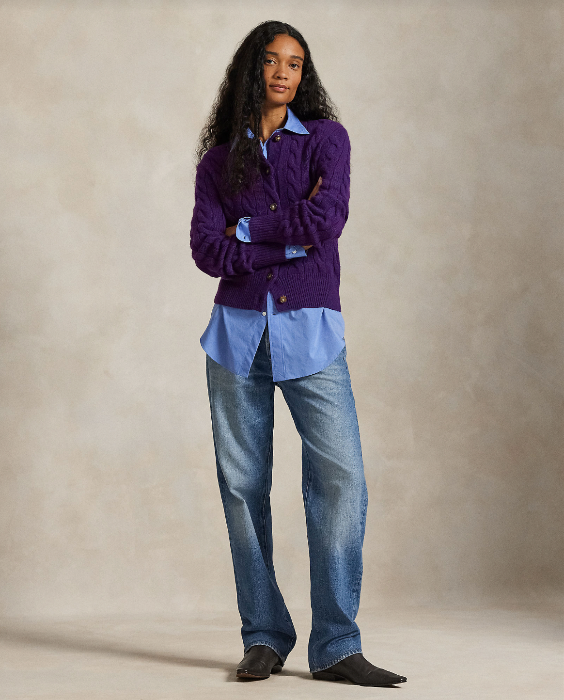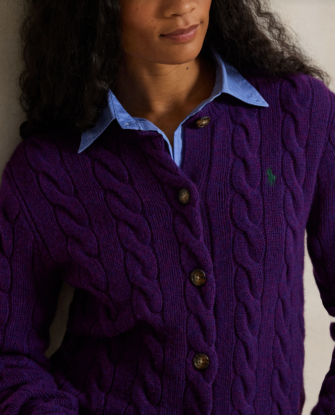 Polo klassisk kabelstrikket cardigan i en myk blanding av italiensk ull og kardet kashmir. Cardiganen har knapper, rund hals og signaturbroderte ponni på brystet.