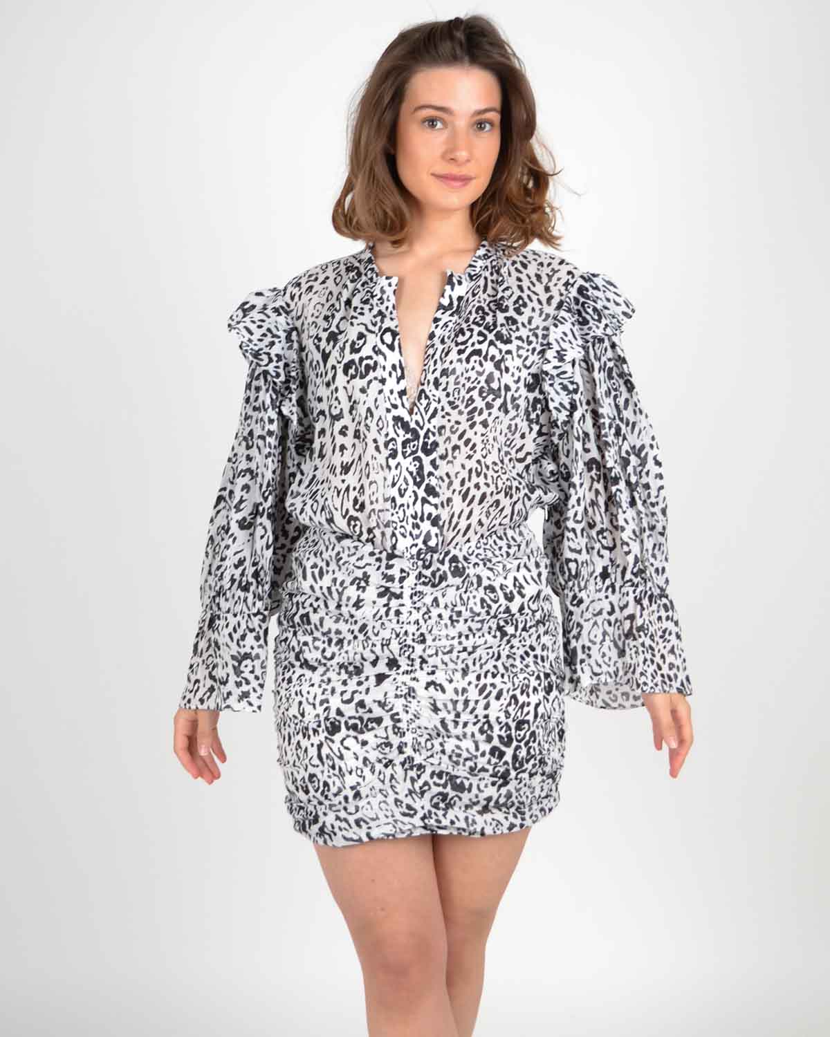 Hvit kjole med deldekkende mønster i sort leopard fra Iro! Gira Dress er en kort kjole i lett kvalitet med lang erm. Kjolen har dyp v-utringning, volangdetaljer på skulder, innsvinget midje, tettsittende skjørt samt voluminøs erm. Superfin festkjole!