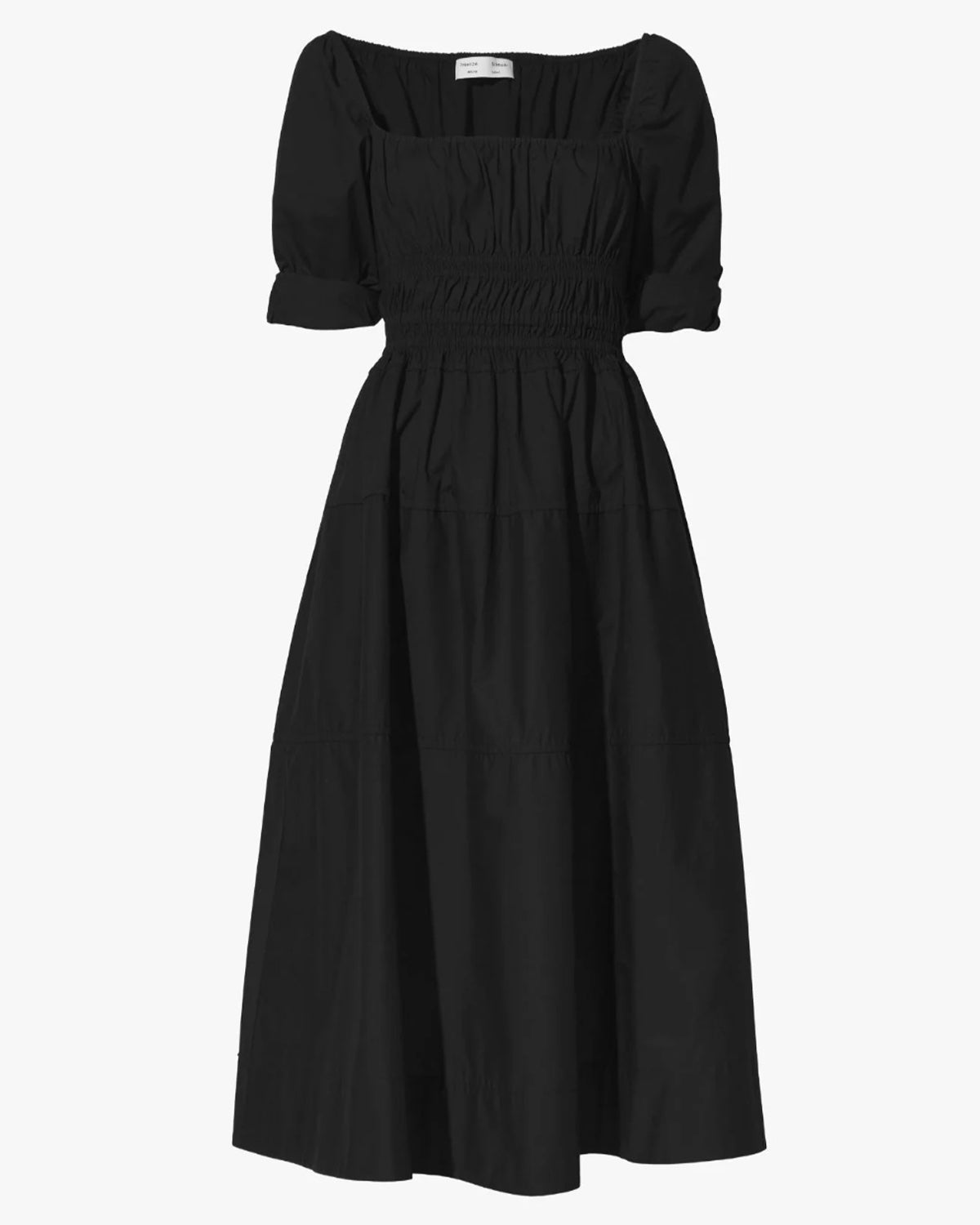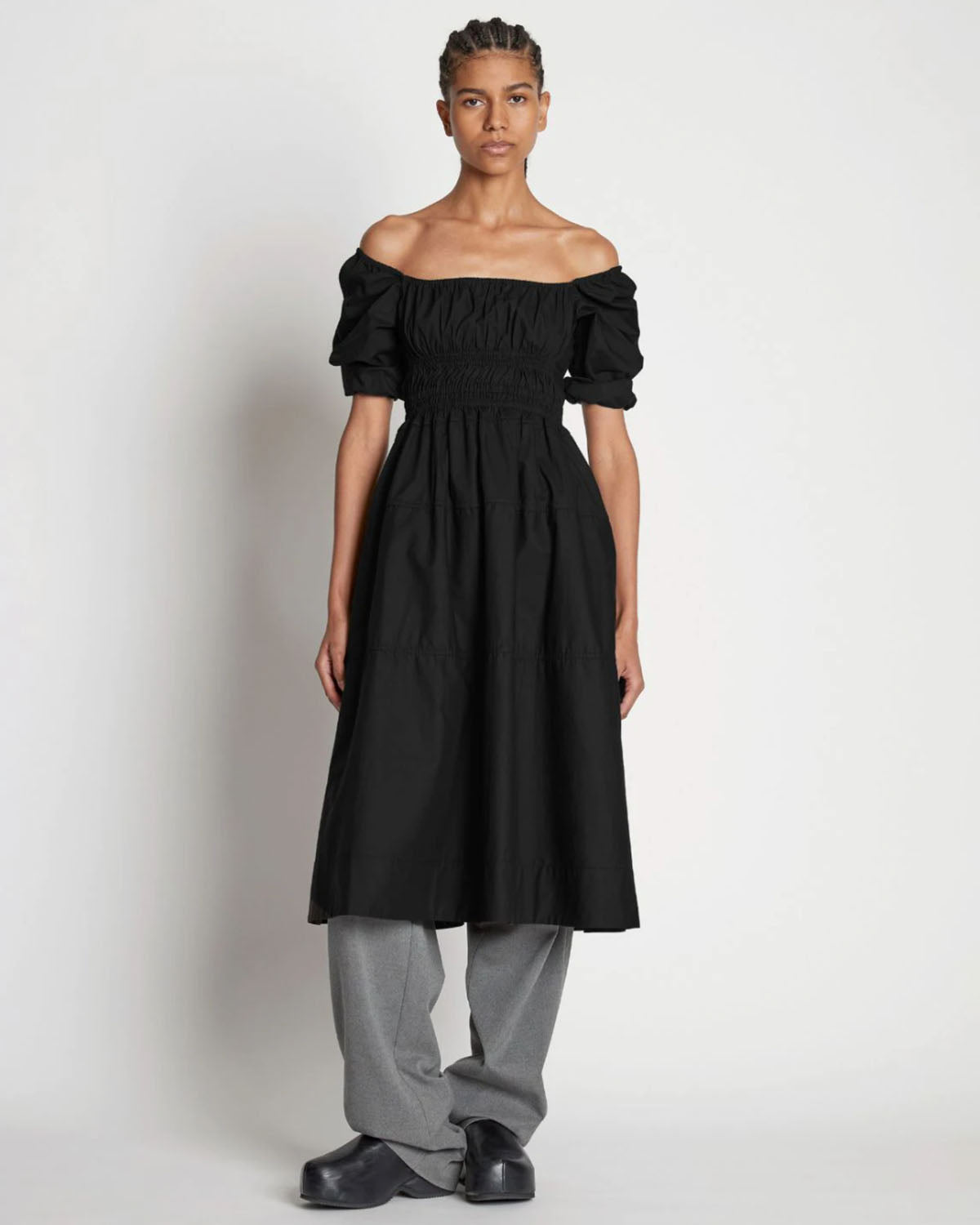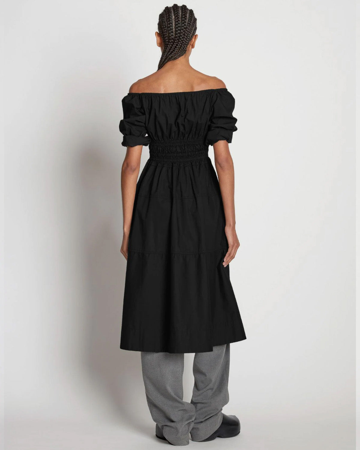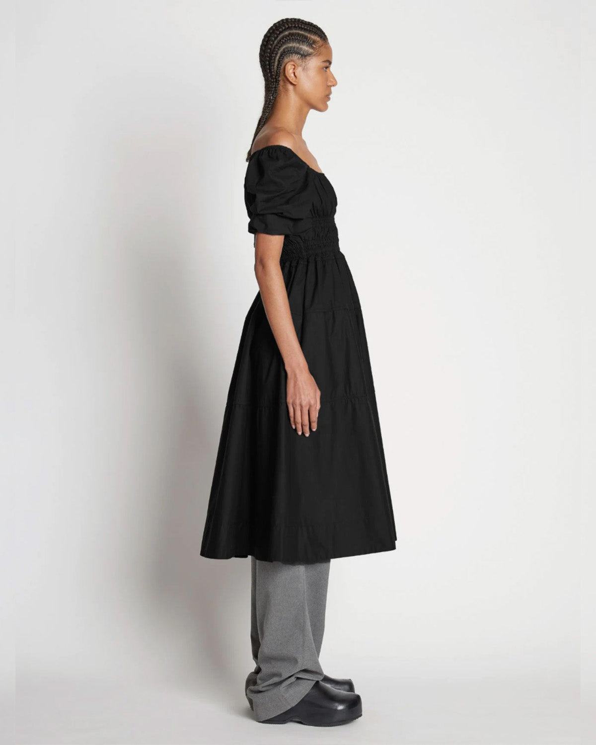 Sort kjole fra Proenza Schouler. Square Neck Poplin Dress har en A-linje silhuett, elastisk firkantet hals og korte ermer med opprullede mansjetter.