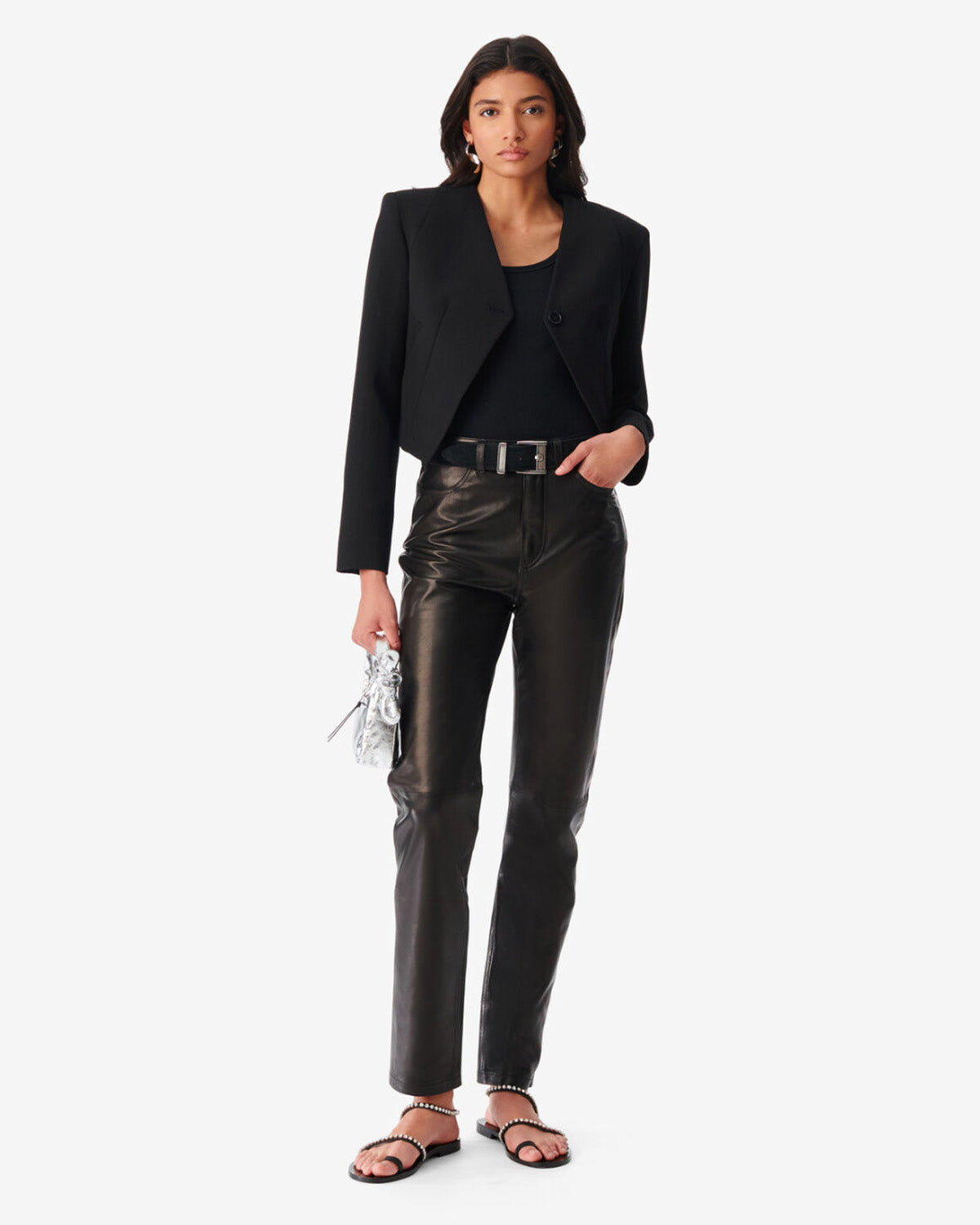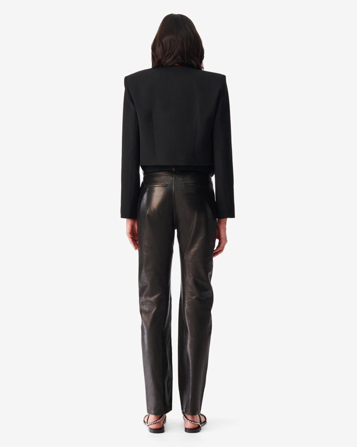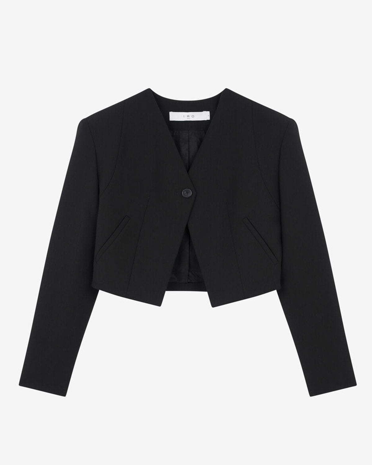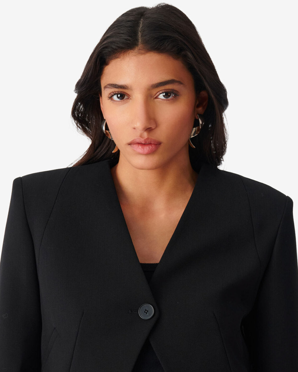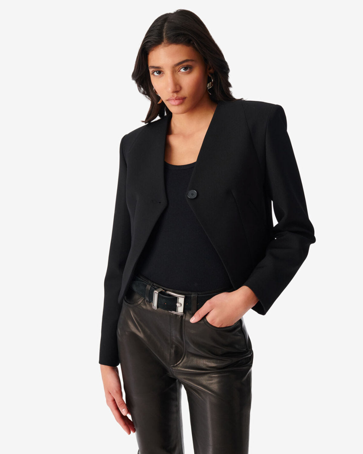 Sort jakke fra Iro. Jakken har avskåret snitt og skulderputer.