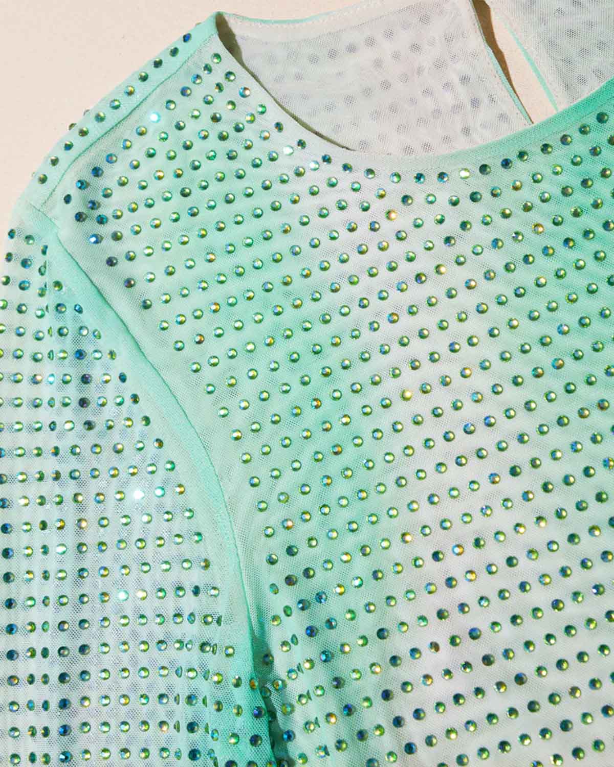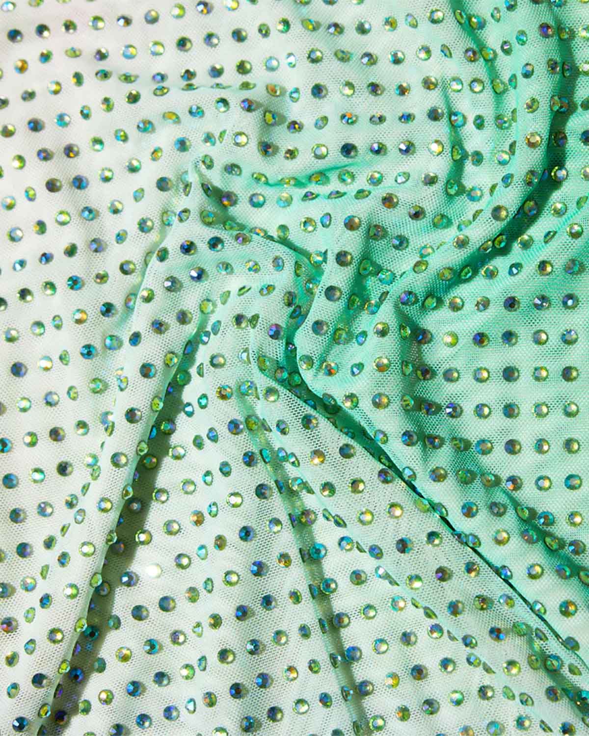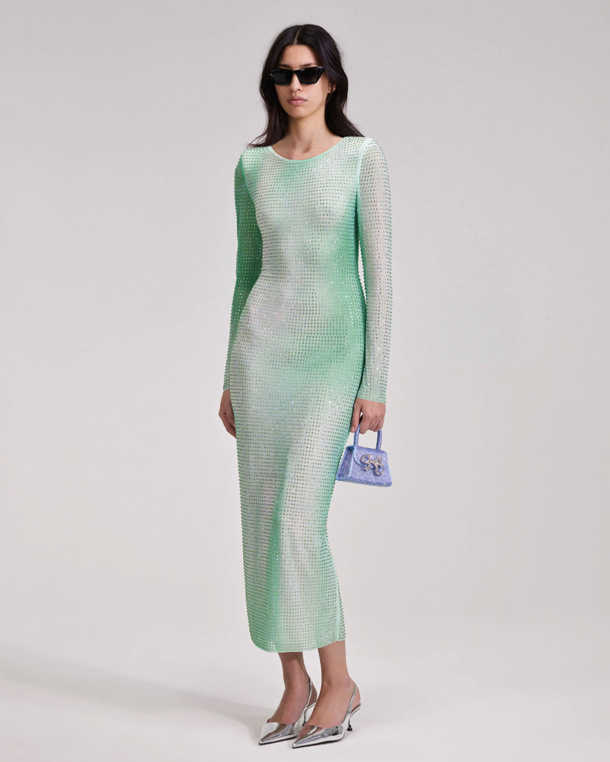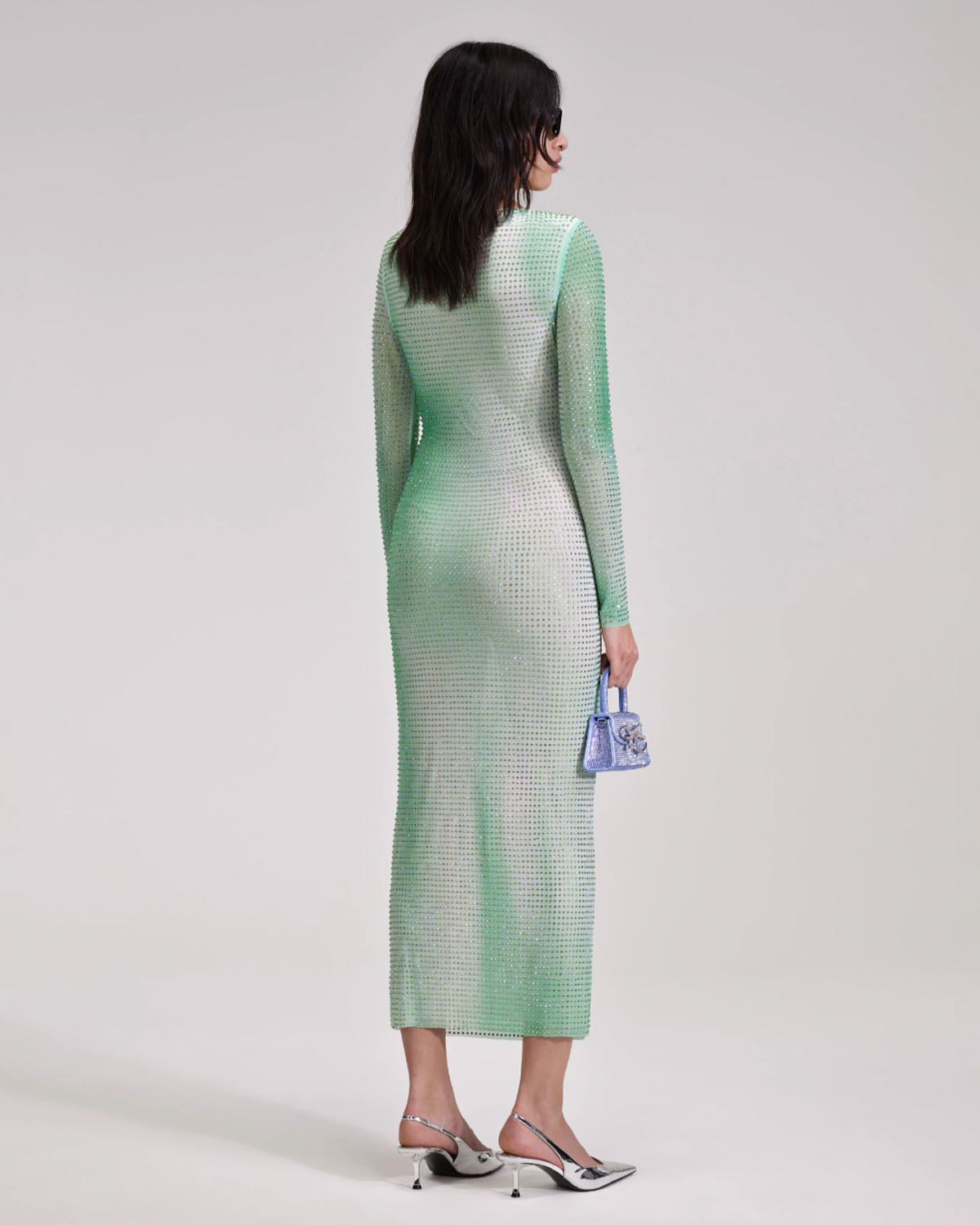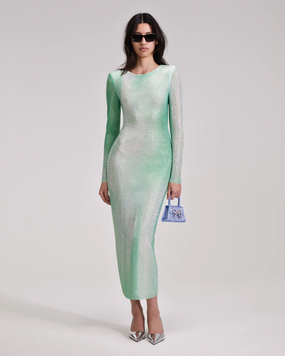 Denne livlige grønne kjolen er laget av rhinestone-besatt mesh for en glitrende finish. Fra den flatterende halsen som setter søkelyset på kragebeinet til det lune konturtrykket, er den tilpasset hele veien for en sensuell silhuett. Sett den sammen med stiletter og en lekker veske for en kveld ute.