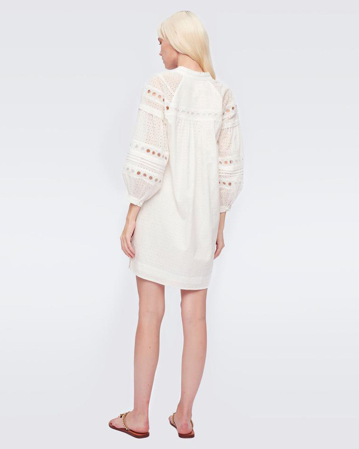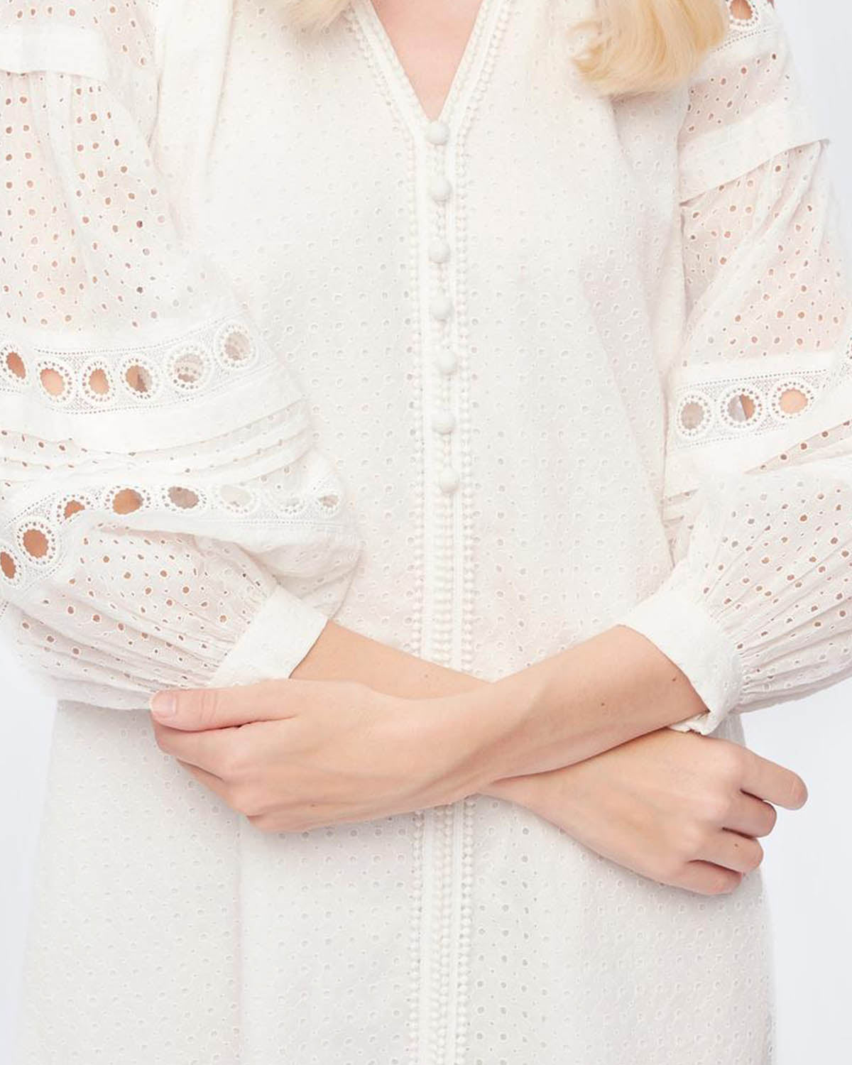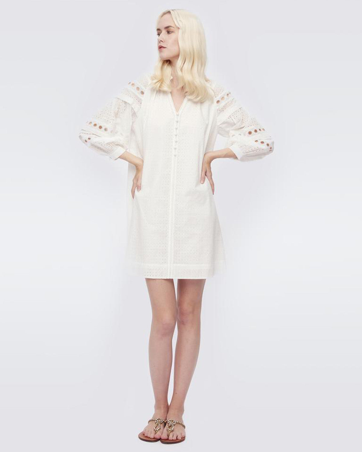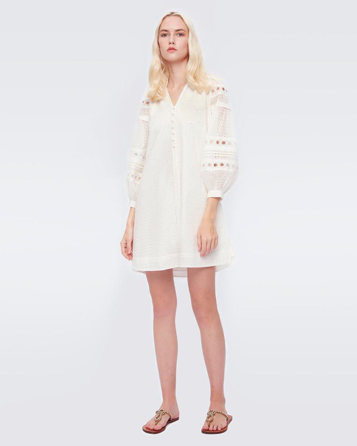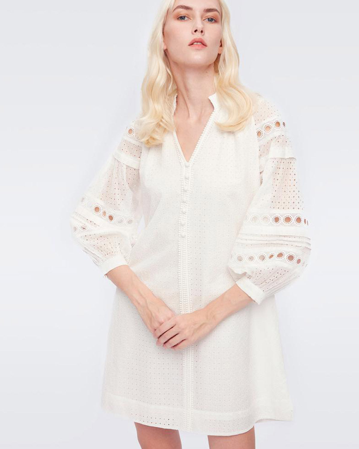 Hvit kjole med nydelige blondedetaljer fra selveste Diane von Furstenberg! Nicolette Mini Dress har en flatterende v-hals med en liten, høy krage samt forseggjorte knapper foran. Kjolen har trendy, voluminøse ermer og en rett og behagelig passform. Nicolette Mini Dress er en perfekt sommerkjole som enkelt kan pyntes opp og ned - et smykke i garderoben!
