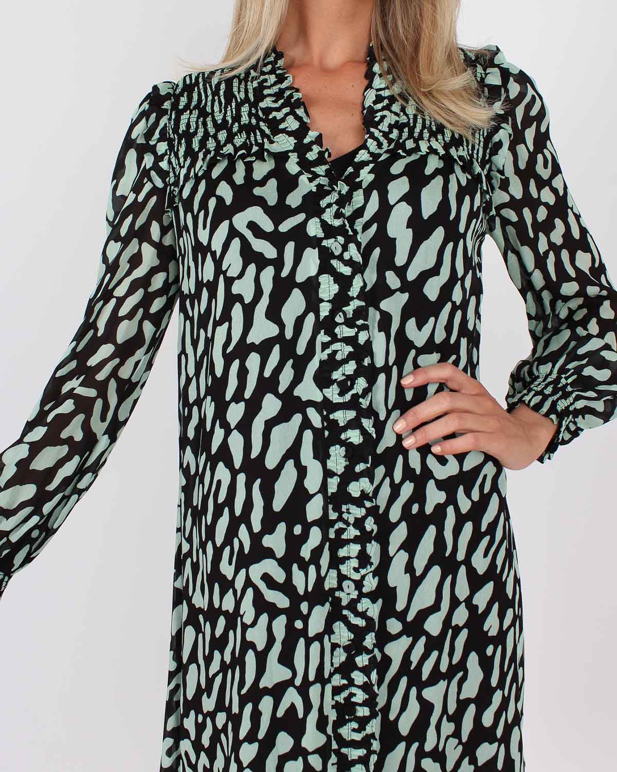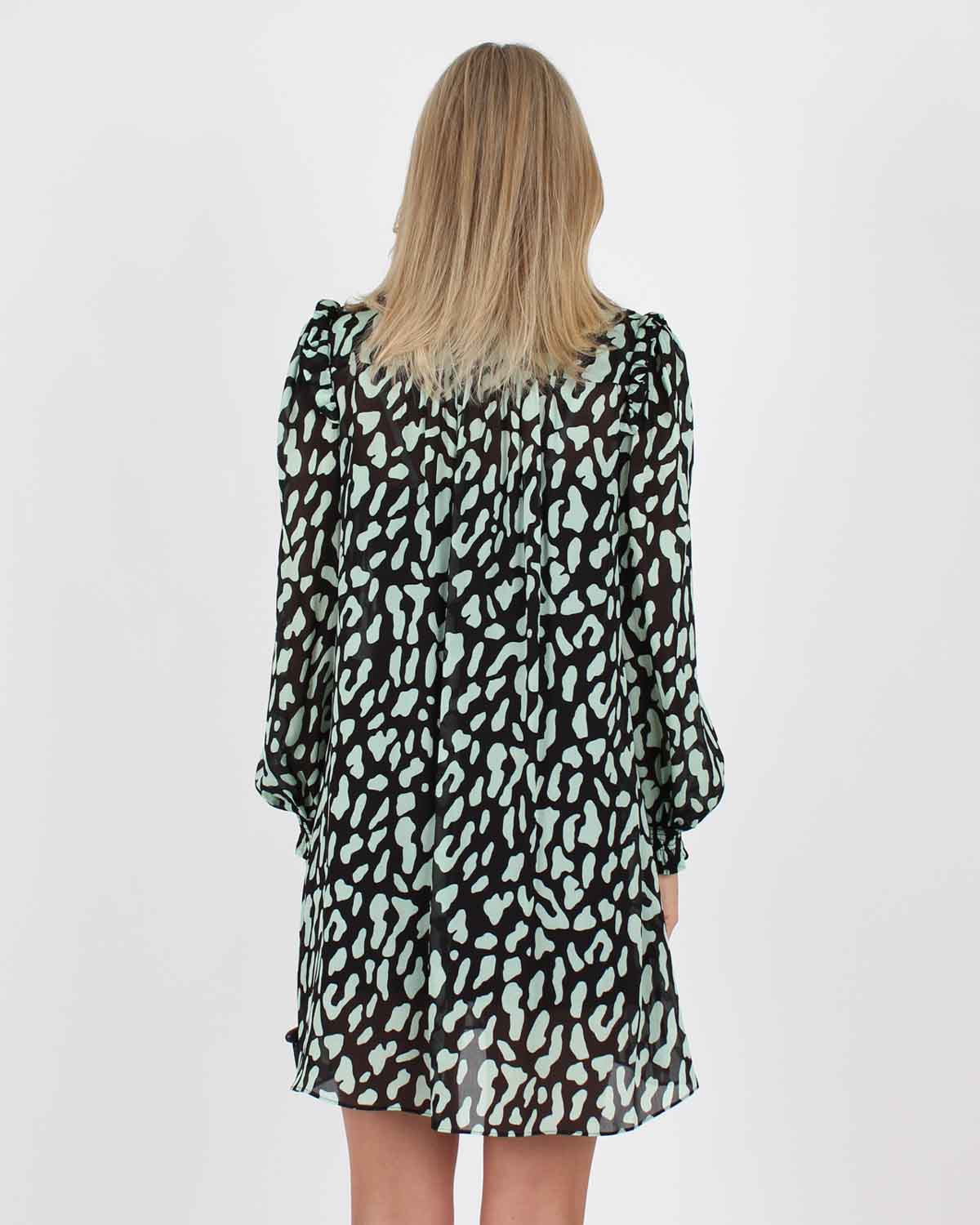 Kort kjole fra Diane von Furstenberg. New Layla dress kan også brukes som en fin bluse over en sort dressbukse.