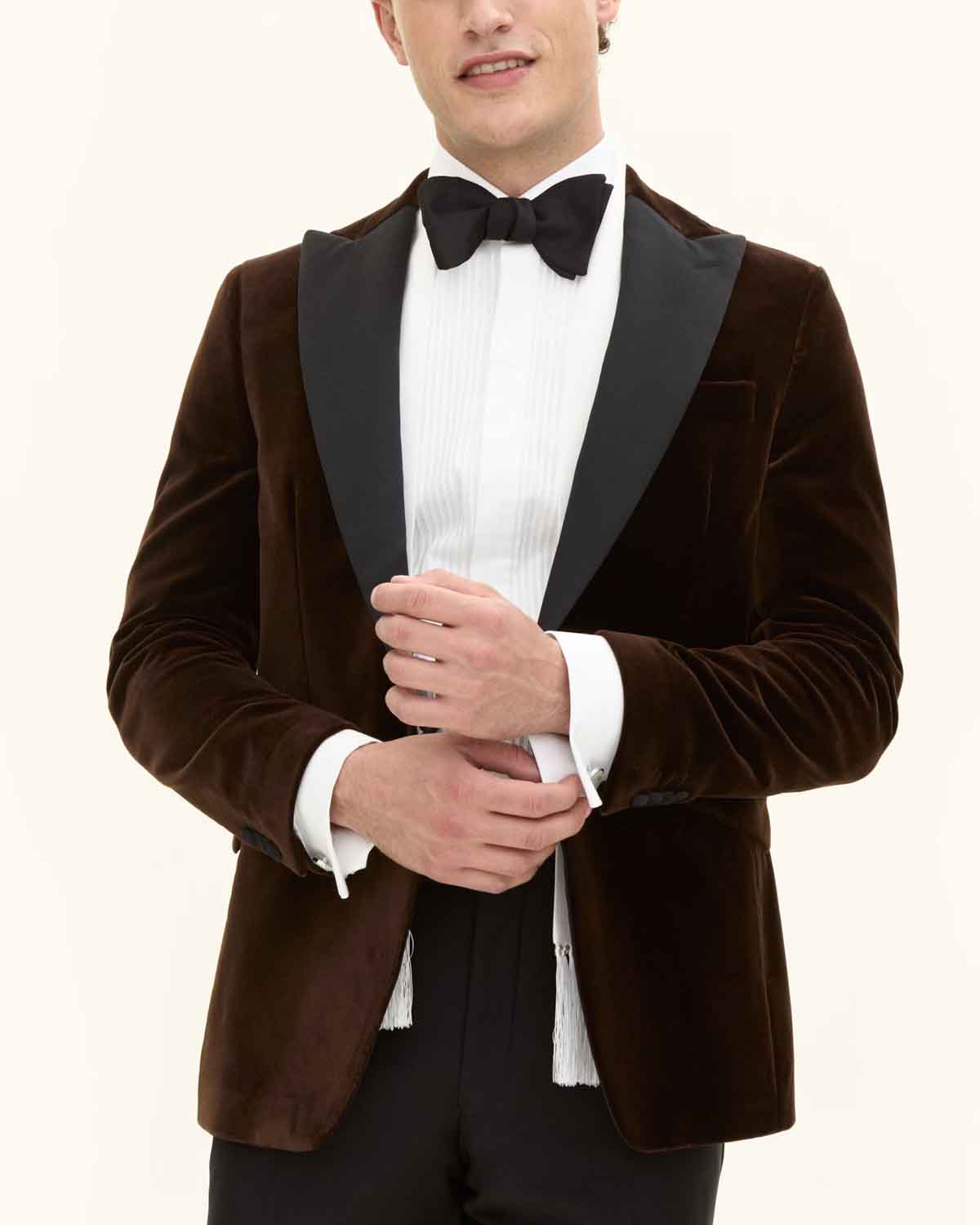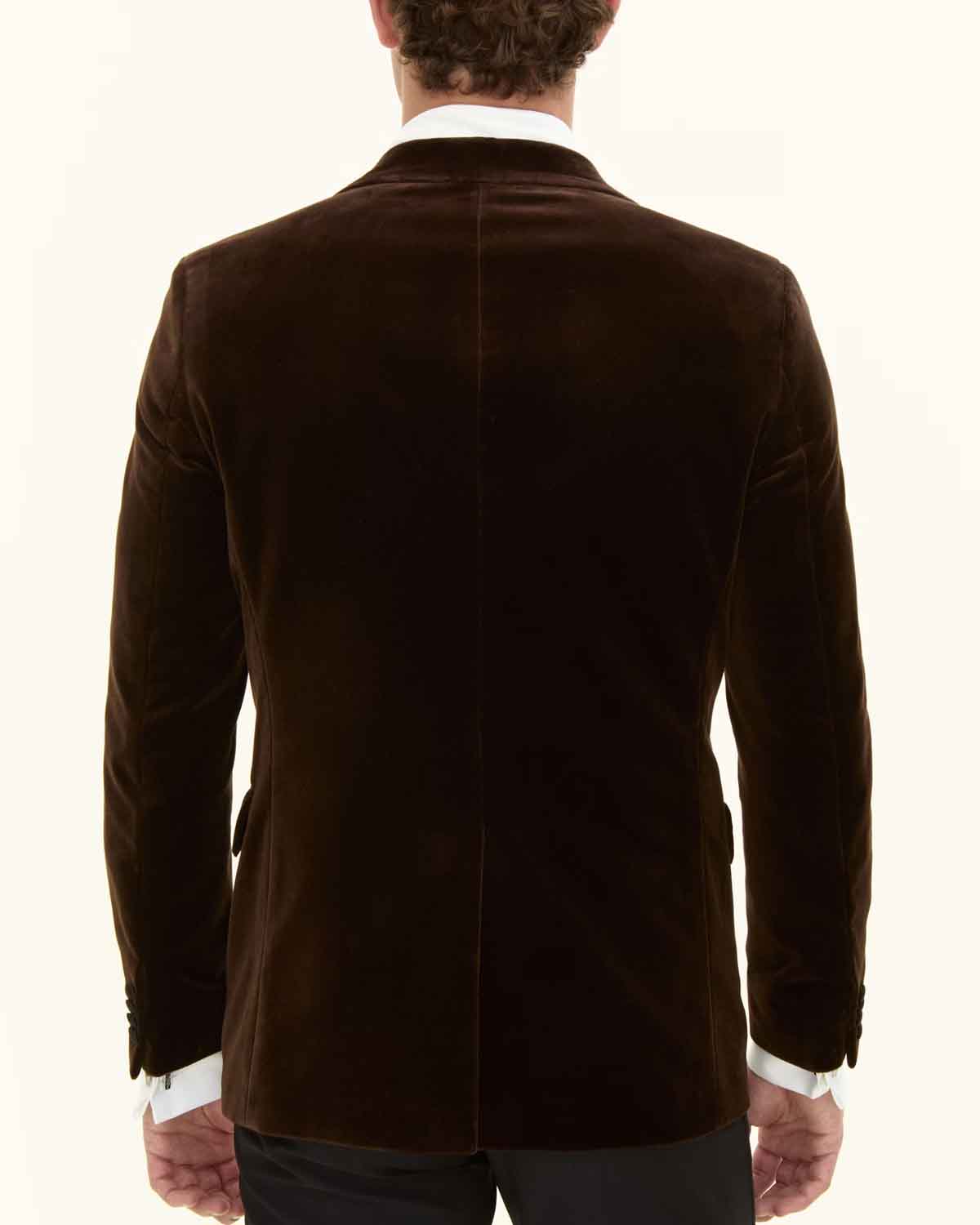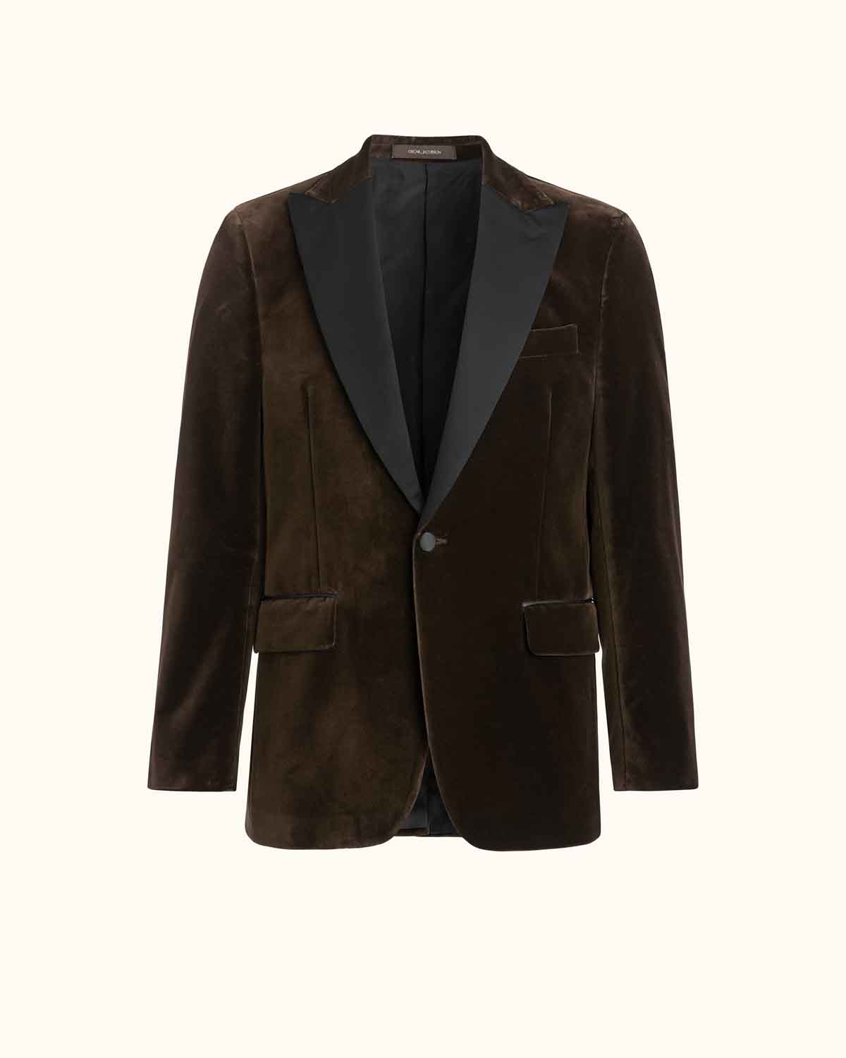 Tuxedo i fløyel med spisse silkeslag. Laget av bomull fra veverne Pontogilo. Normal passform som gir en moderne silhuett uten å føles for stram. Innsiden er helfôret i viskose for økt komfort og en deilig følelse.