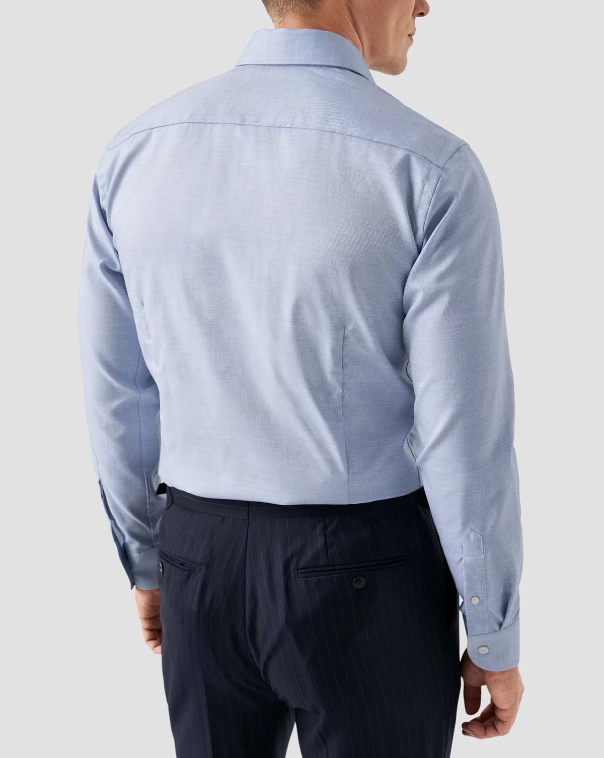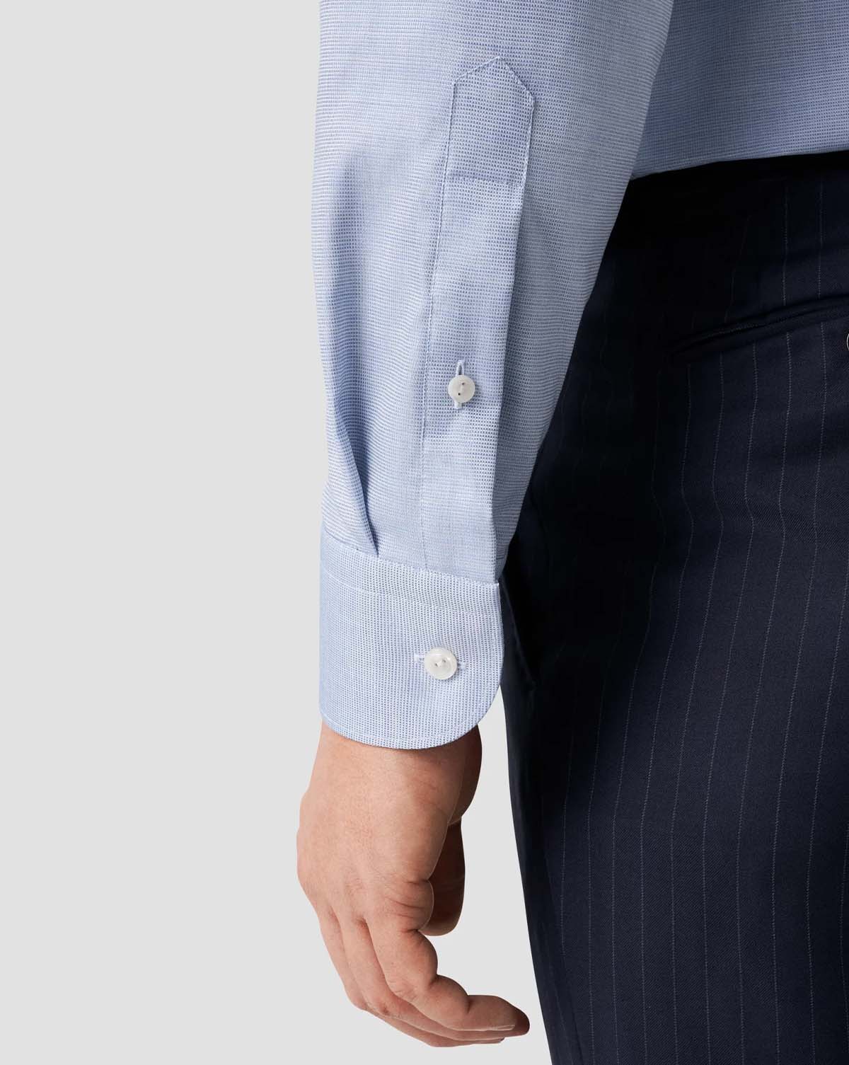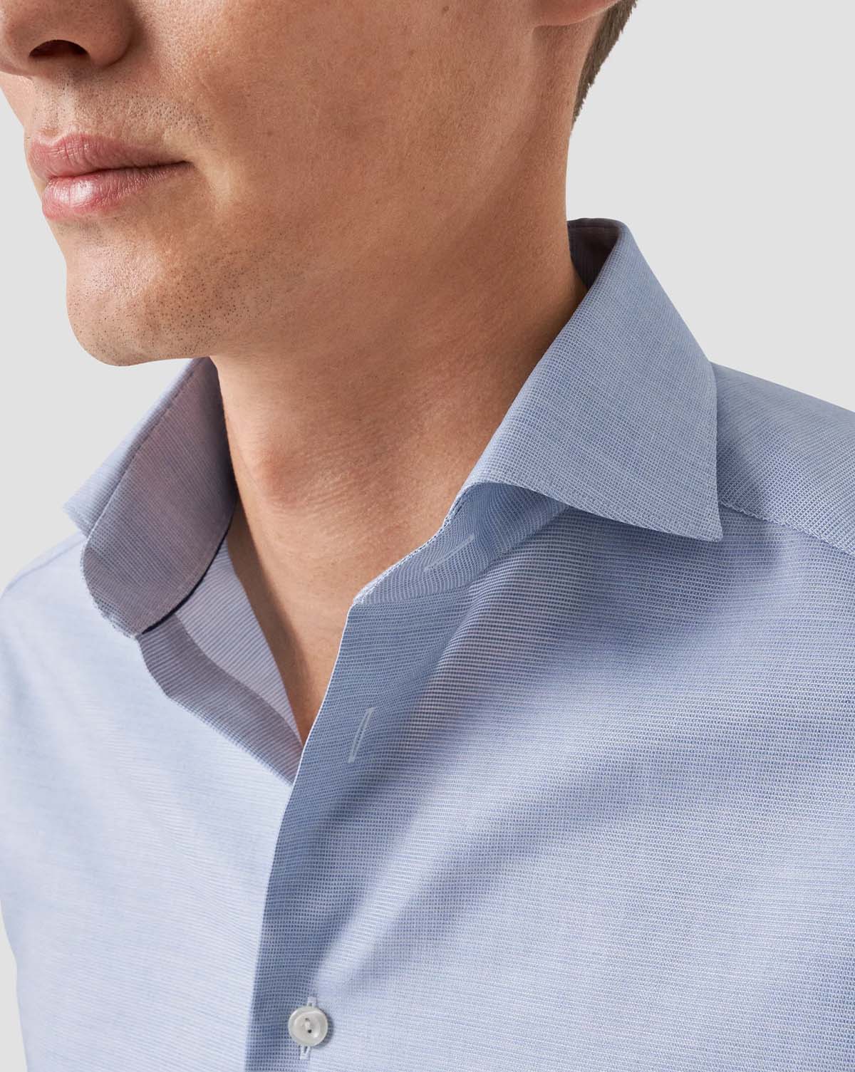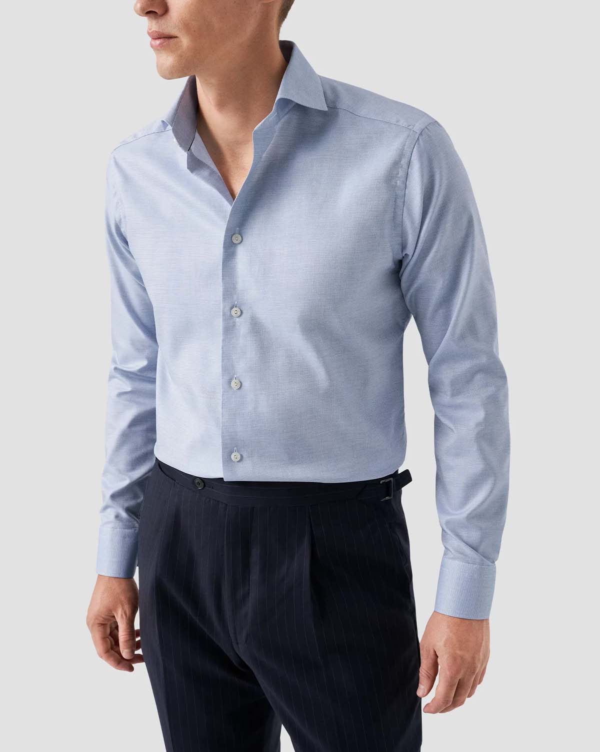 En elegant lyseblå skjorte, laget av 100% bomull vevd i Italia med et tonalt melert garn. Dette utsøkte stykket har et subtilt halvsolid mønster og er utsmykket med standardknapper, som tilbyr både stil og raffinement.