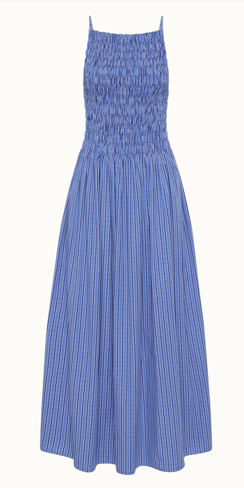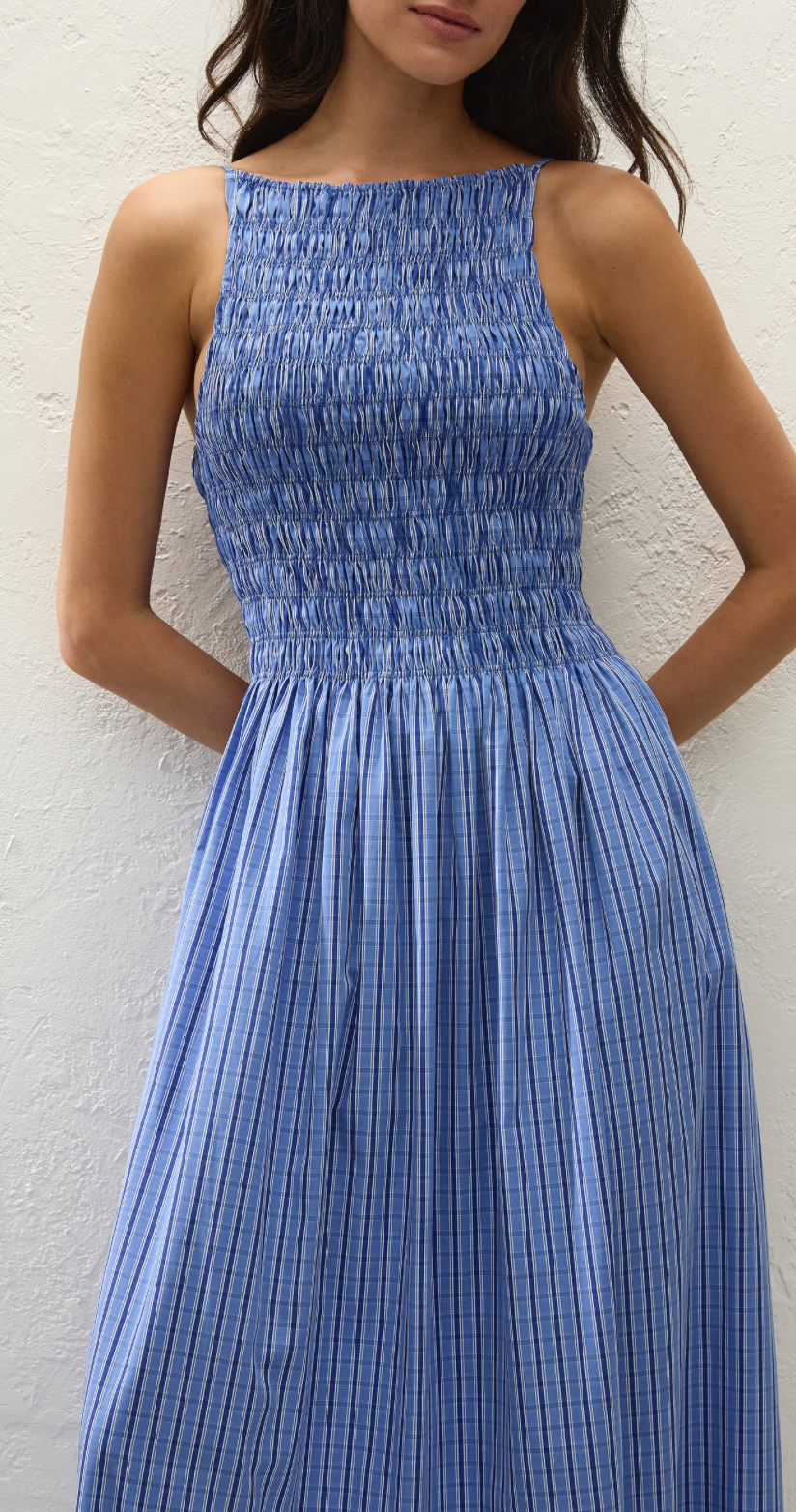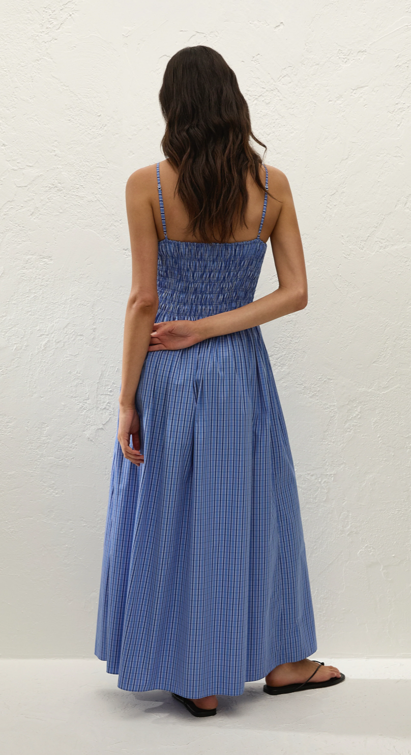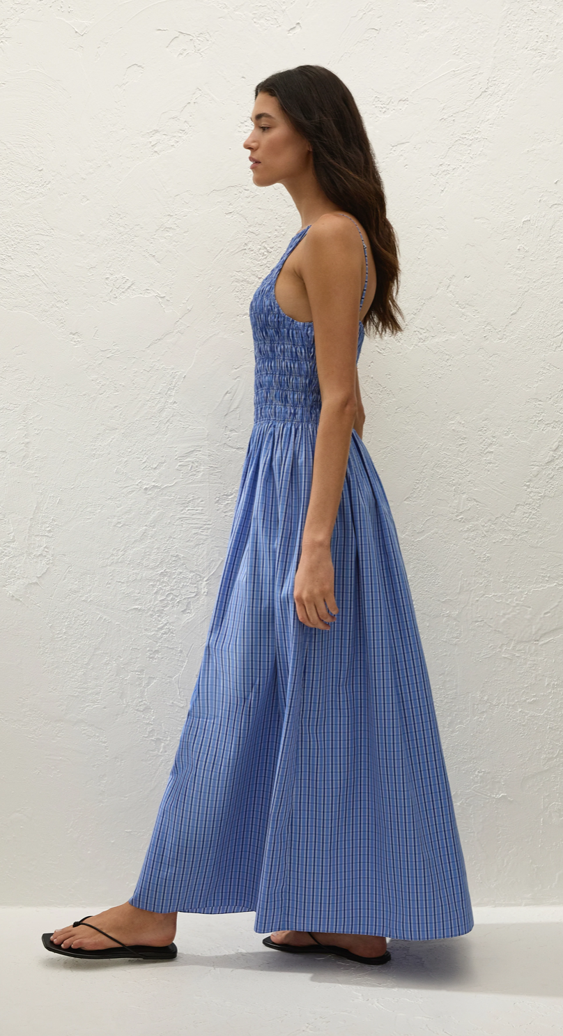 En hverdagslig maxikjole, designet av et signaturmateriale av 100 % bomull i en nostalgisk blå gingham-farge. Med firkantet halsutringning og tynne justerbare stropper, er den rynket gjennom overdelen med en samlet midje. Derfra faller den over i et mykt A-formet skjørt som går ned til anklene. Designet med en uanstrengt av-og-på-sleng-stil, er den den perfekte luftige sommerfølgesvennen.