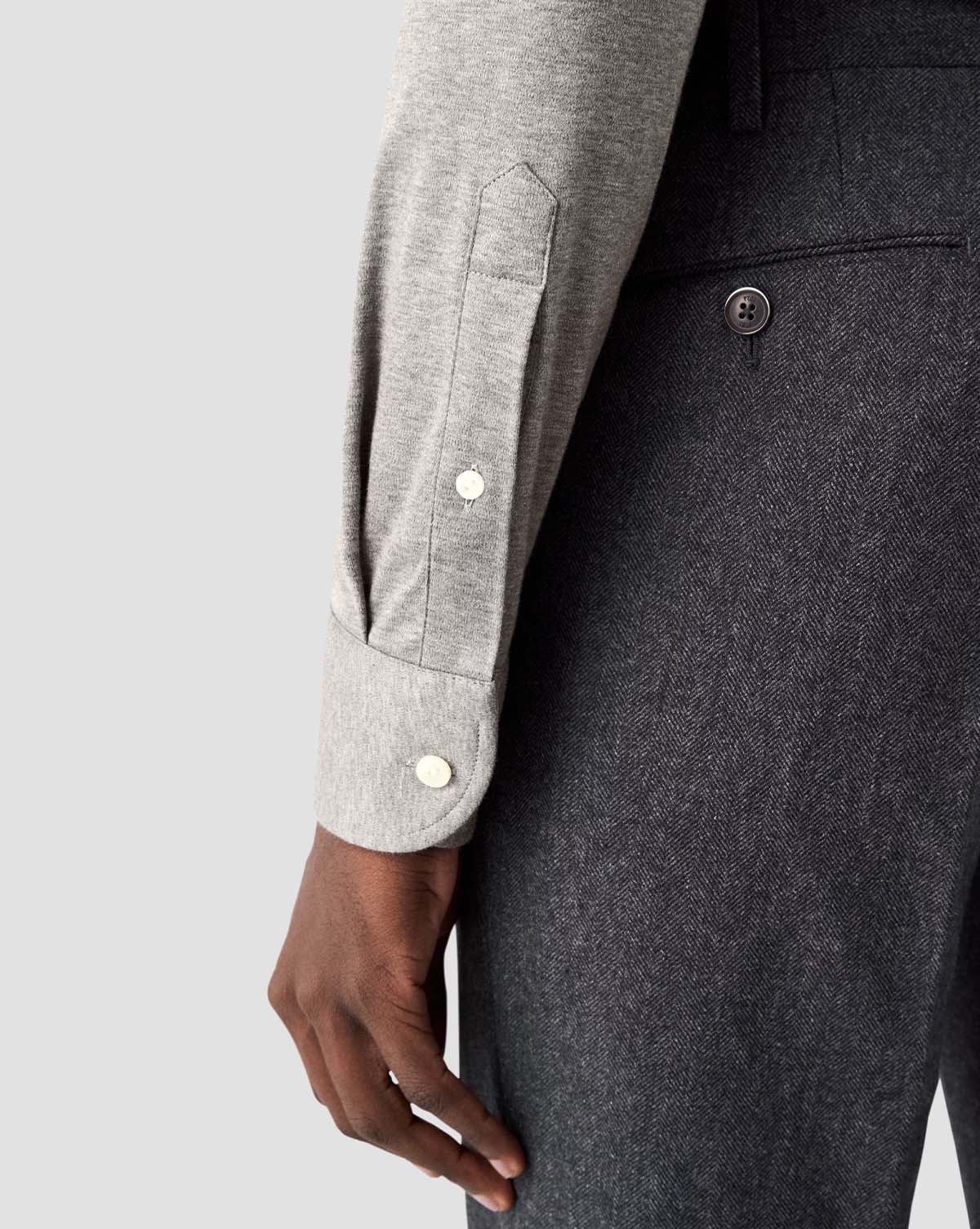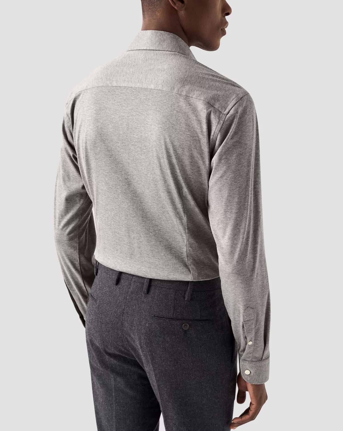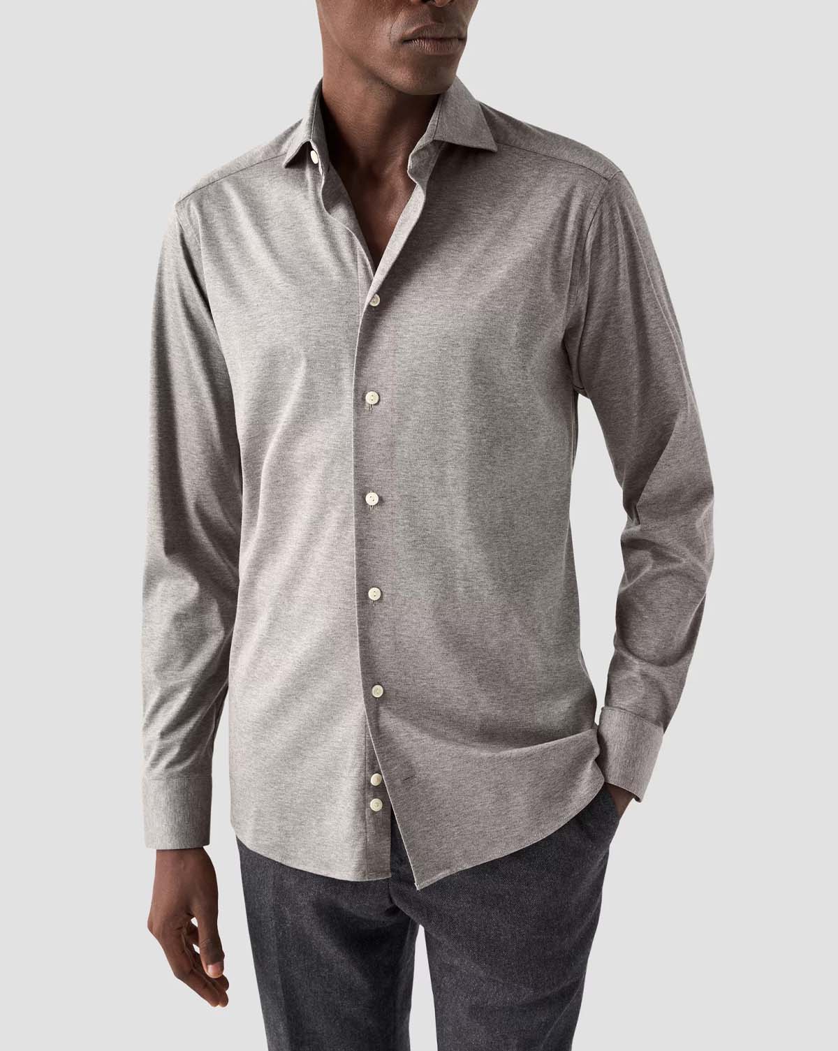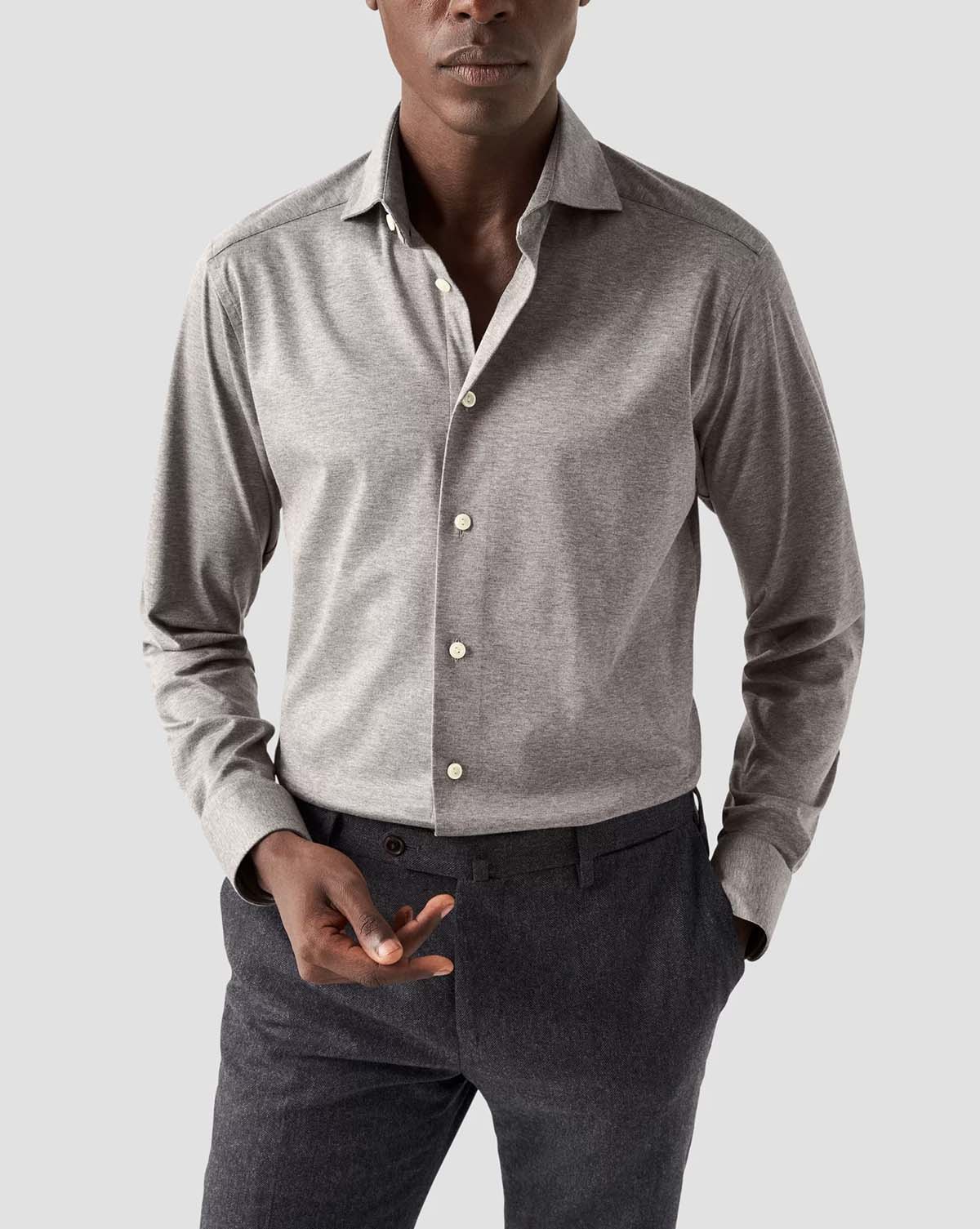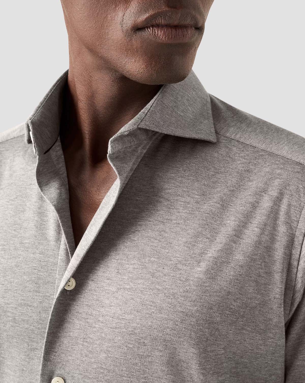 En grå fritidsskjorte, laget av 100% bomull. Skjorten er vevd i Italia med et fint Filo di Scozia-garn, noe som resulterer i en skinnende finish og fleksibel drapering som sikrer skarphet hele dagen. Den har en spredt krage og avrundede mansjetter, som skaper et sofistikert utseende.