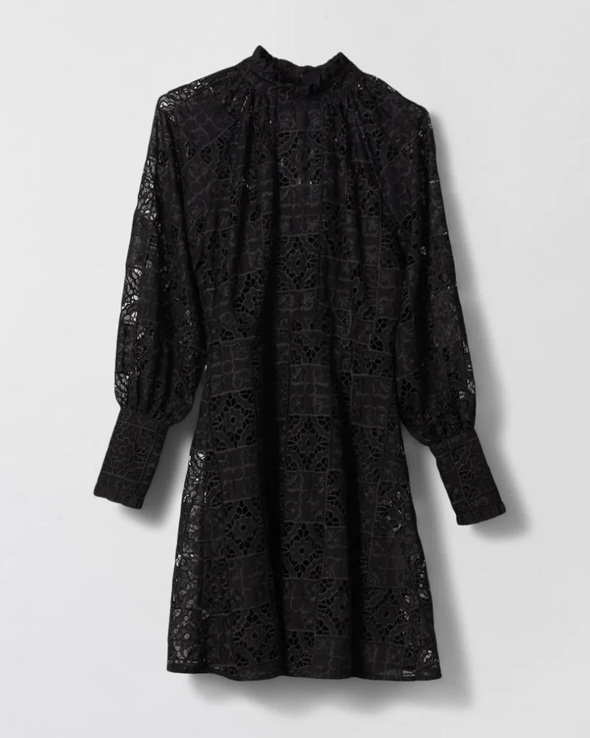 Sort kjole fra FWSS. Skipper Dress har lange ermer, figursydd midje, halvhøy hals, praktisk glidelås i ryggen og stoffkledde knapper.