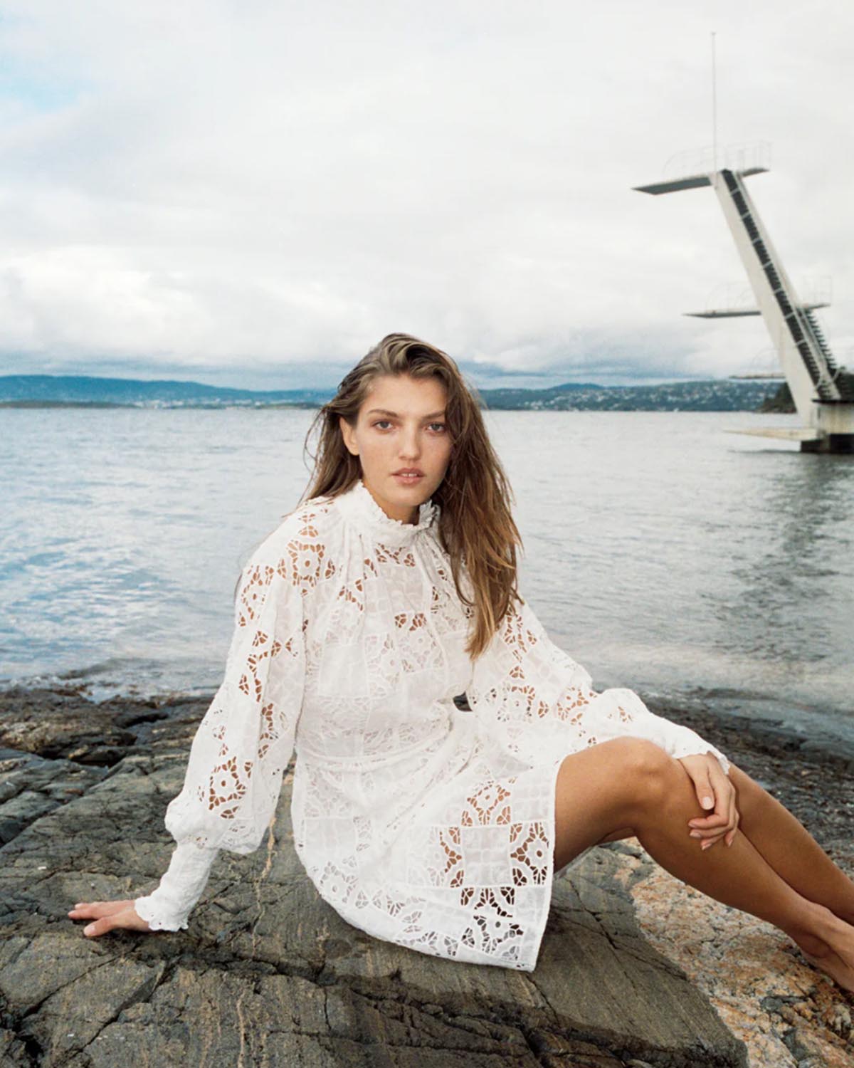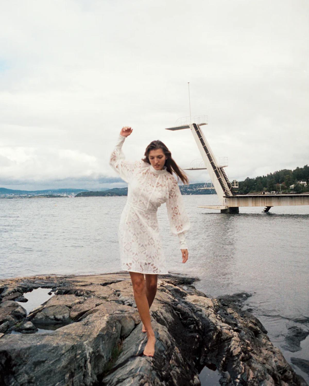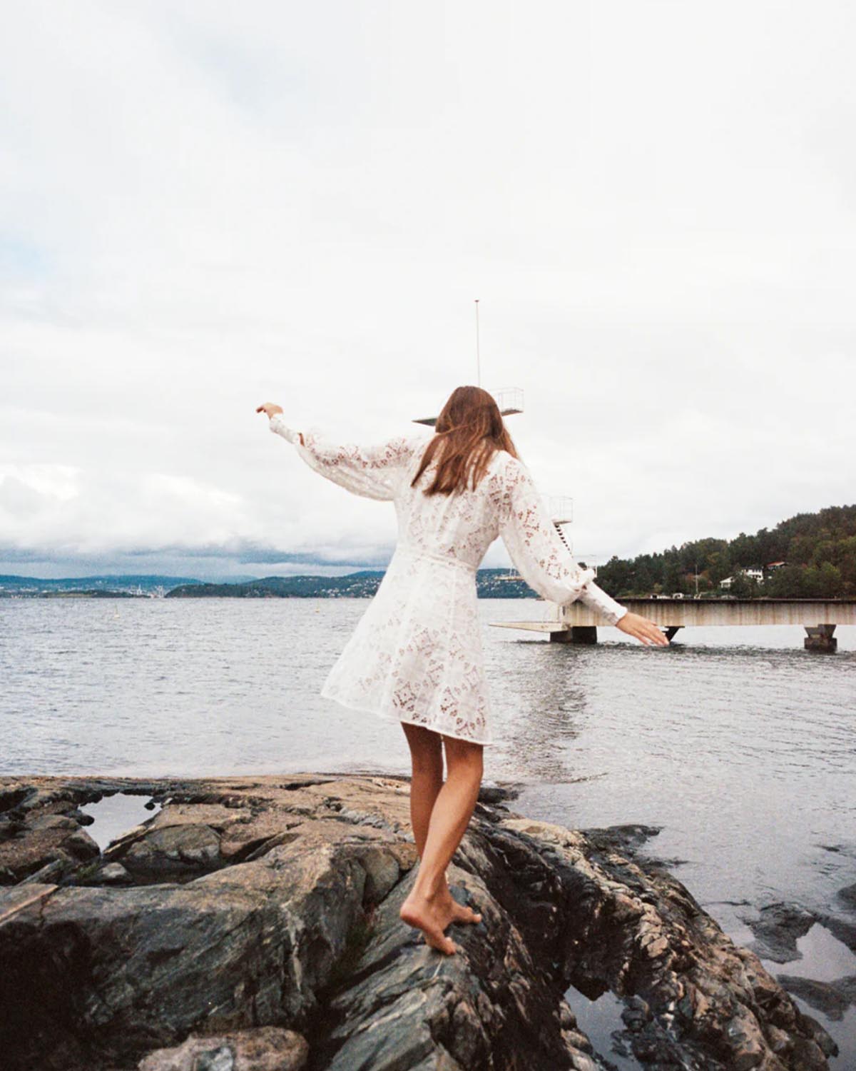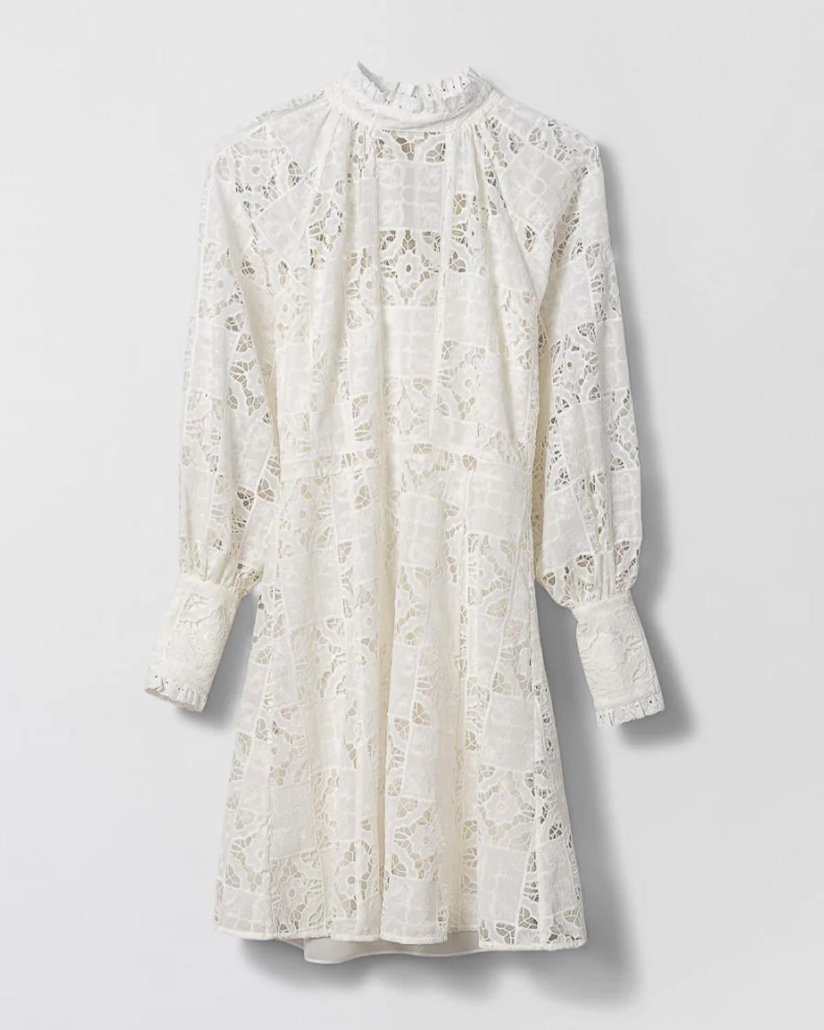 Hvit kjole fra FWSS. Skipper Dress har lange ermer, figursydd midje, halvhøy hals, praktisk glidelås i ryggen og stoffkledde knapper.