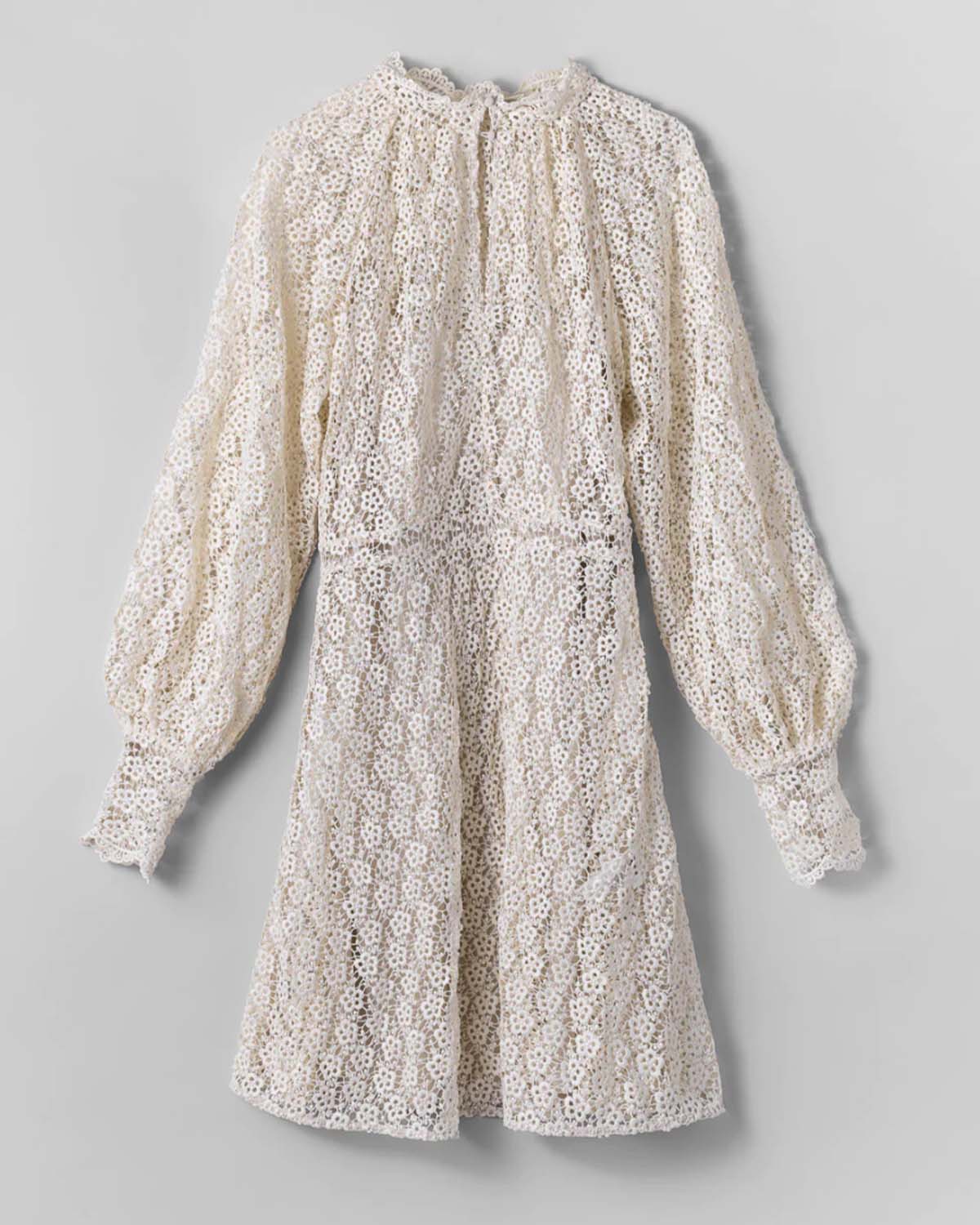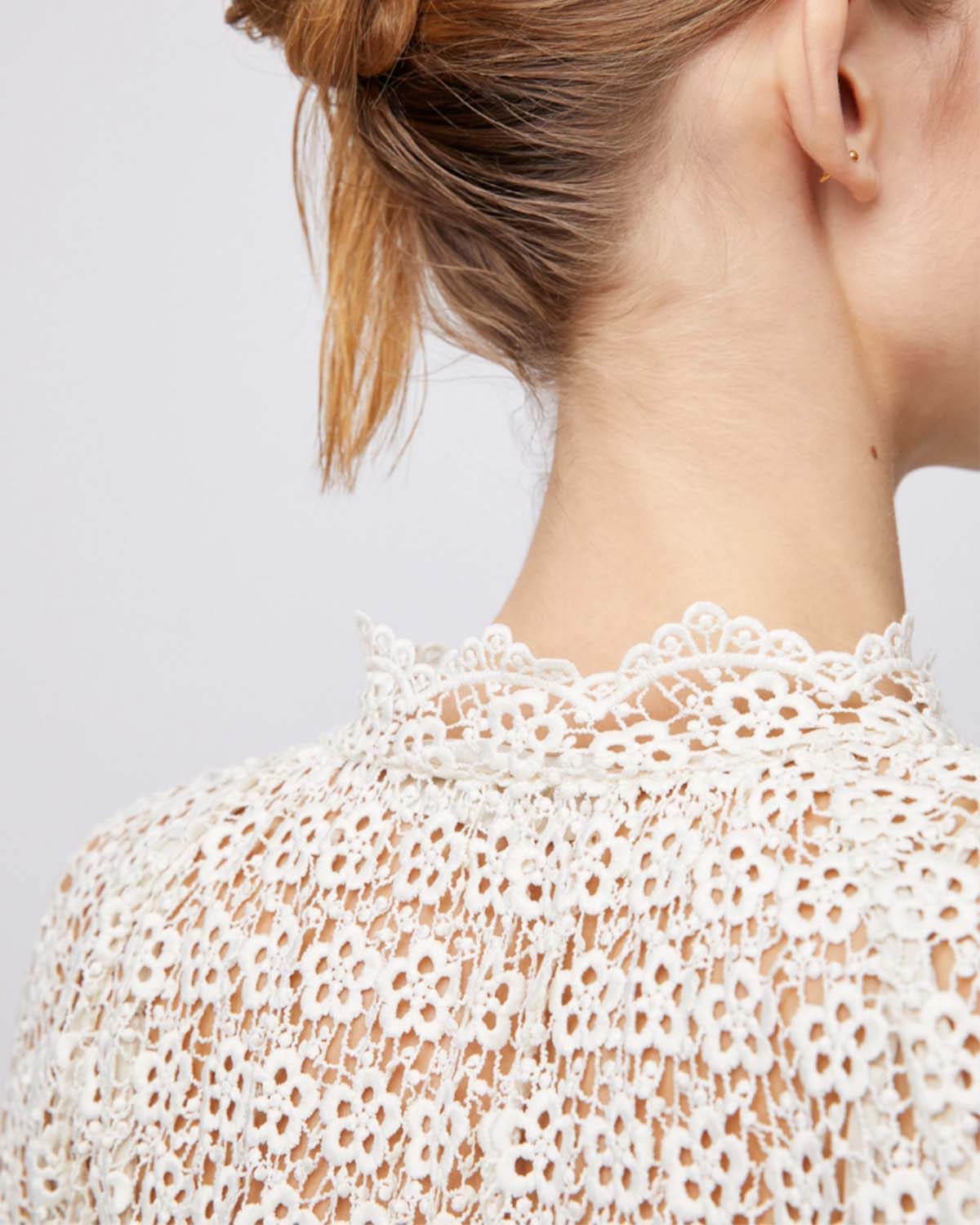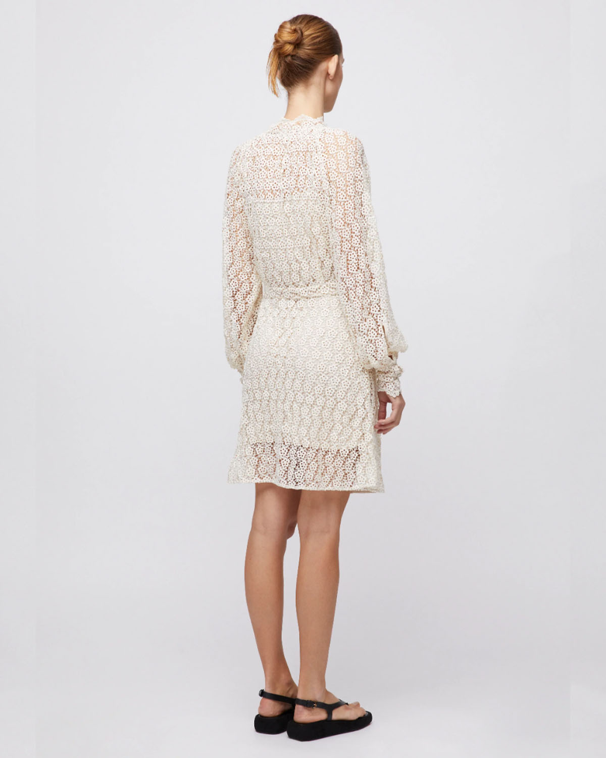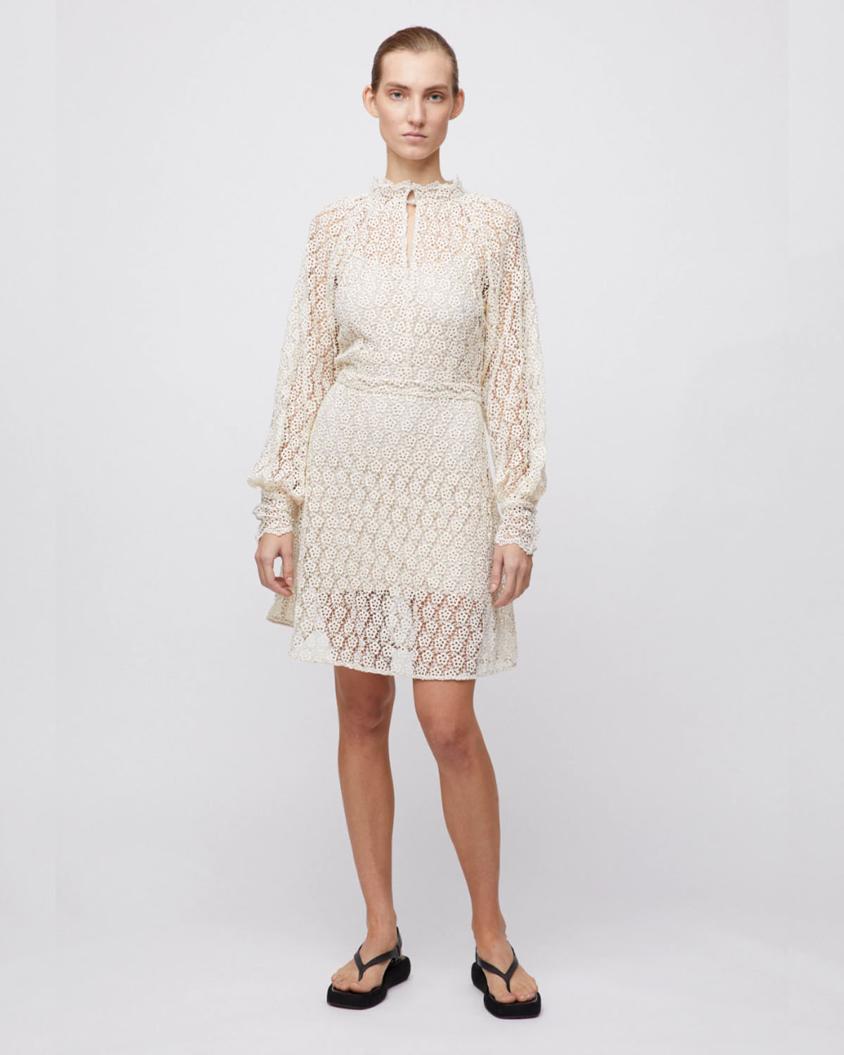 Dahlia Dress er laget i teksturvevde blomsterblonde og har en oppknappet halskrage, med nøkkelhullsåpning foran i halsen som kan brukes åpen eller lukket. Dahlia Dress har en subtil linning som fremhever midjen, samtidig som den beholder en avslappet silhuett. Kjolen har også en usynlig sideglidelås og tone i tone slipkjole. Dahlia-kjolen er et romantisk stykke som er lett å style både opp og ned.