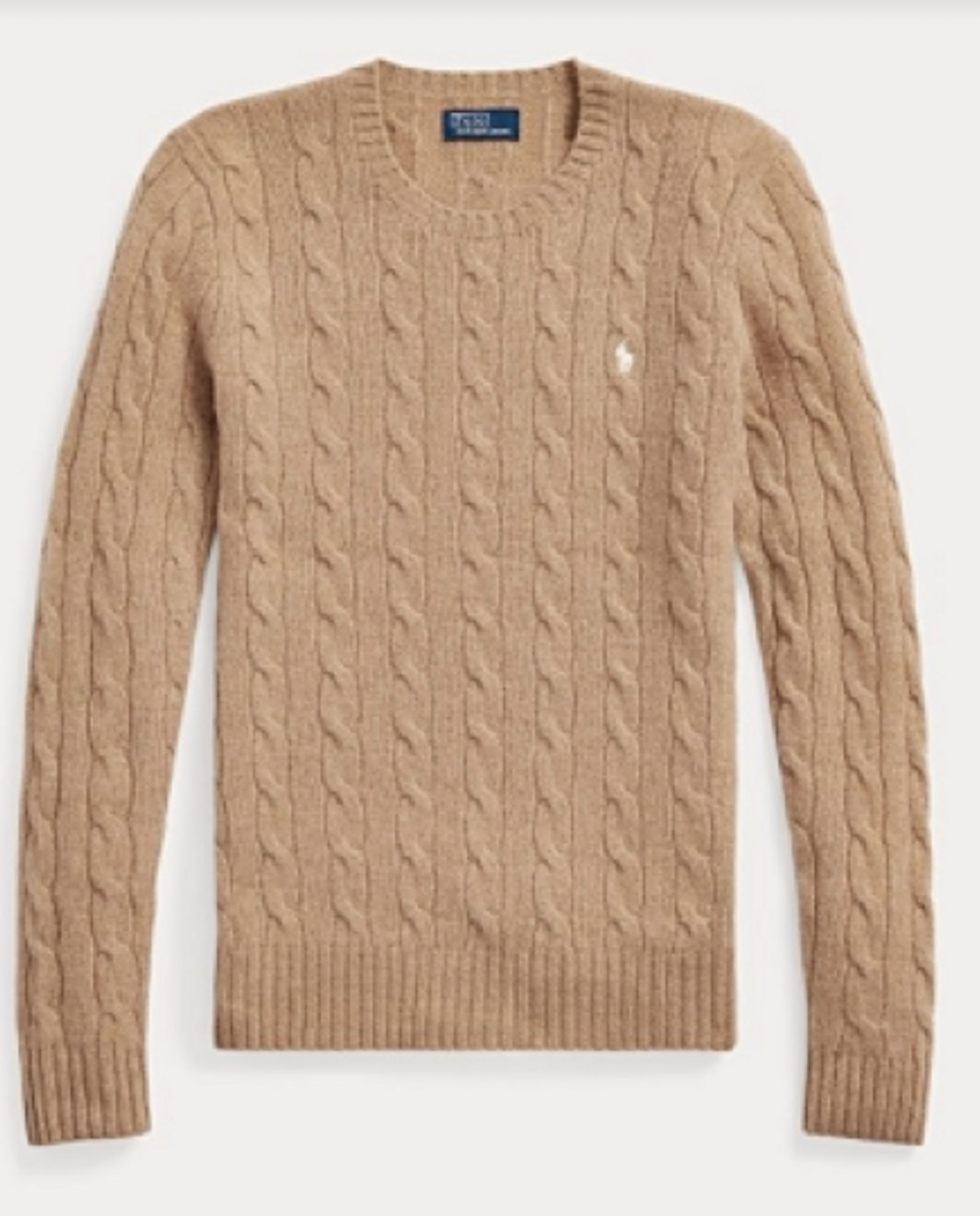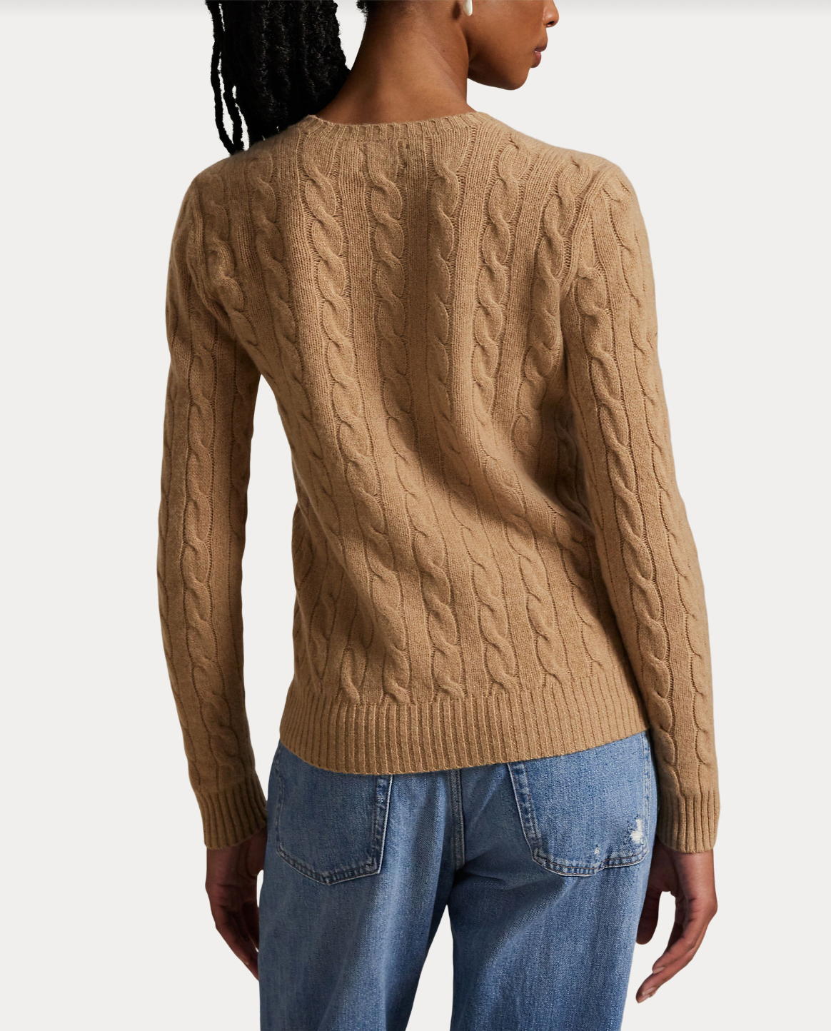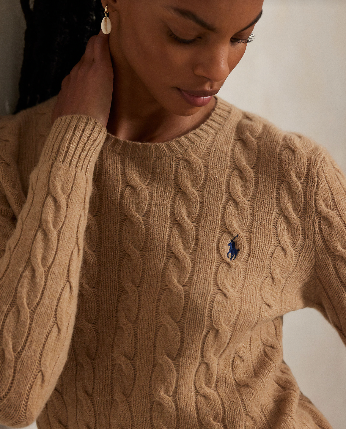 Julianna er en klassisk kabelstrikket genser fra Polo med et slankt snitt og rund hals. Genseren er i en blanding av myk italiensk ull og kashmir, her i en nydelig kamel farge med en blå ponni på brystet.