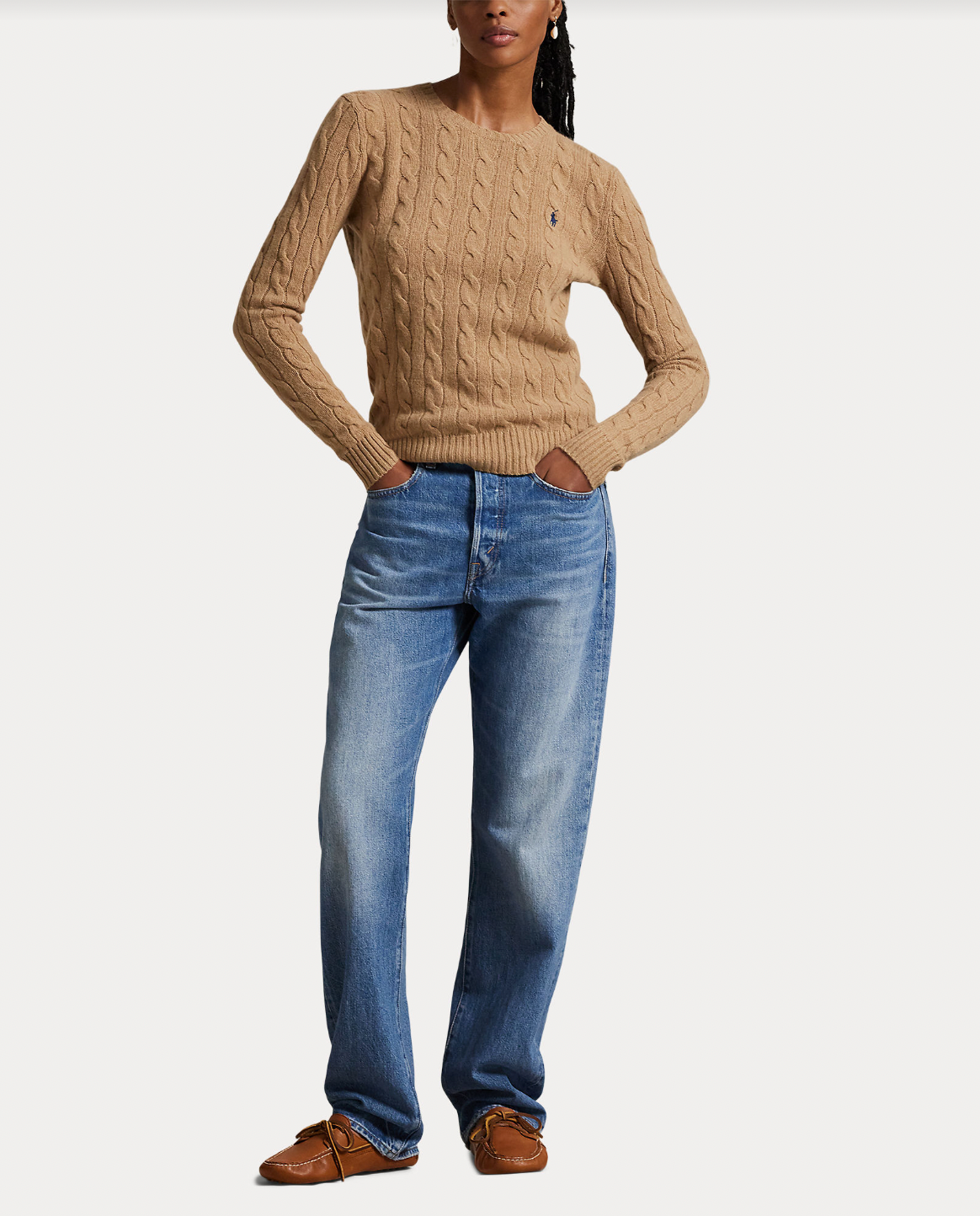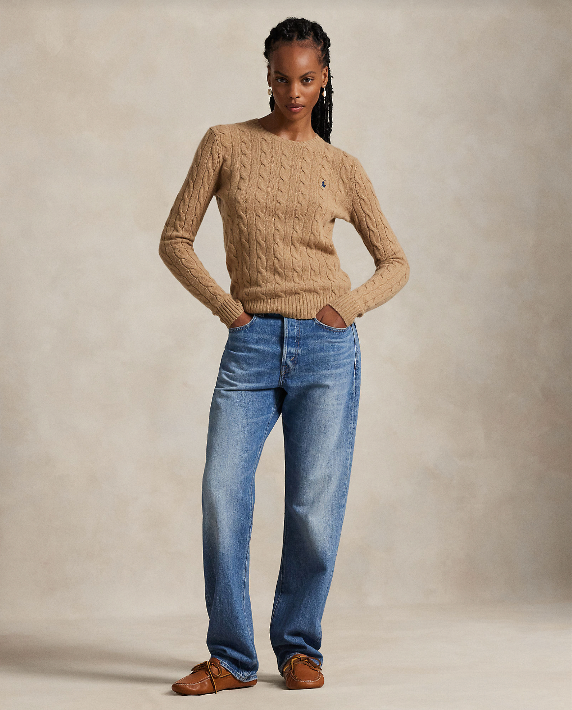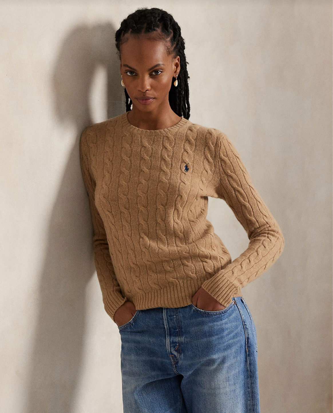 Julianna er en klassisk kabelstrikket genser fra Polo med et slankt snitt og rund hals. Genseren er i en blanding av myk italiensk ull og kashmir, her i en nydelig kamel farge med en blå ponni på brystet.