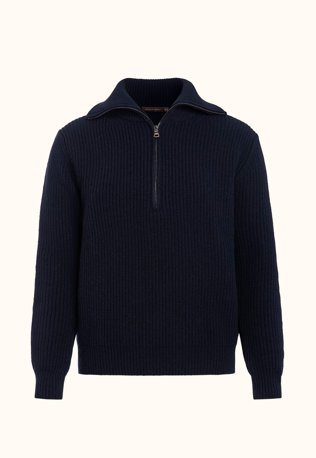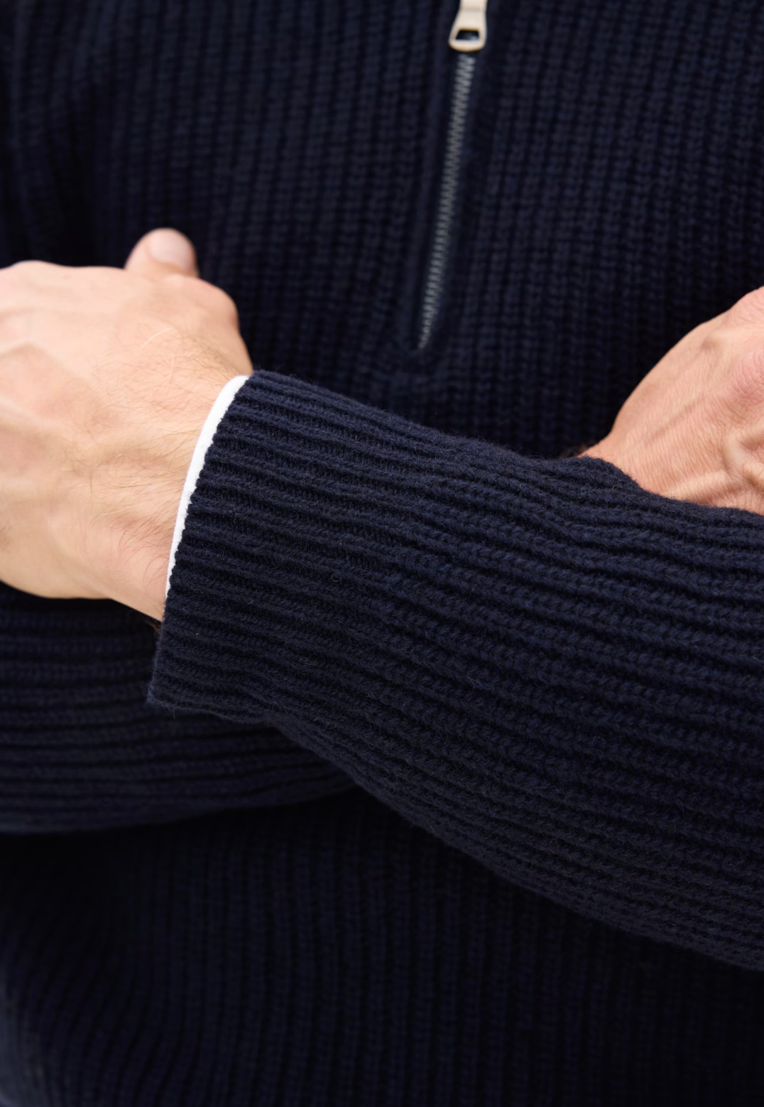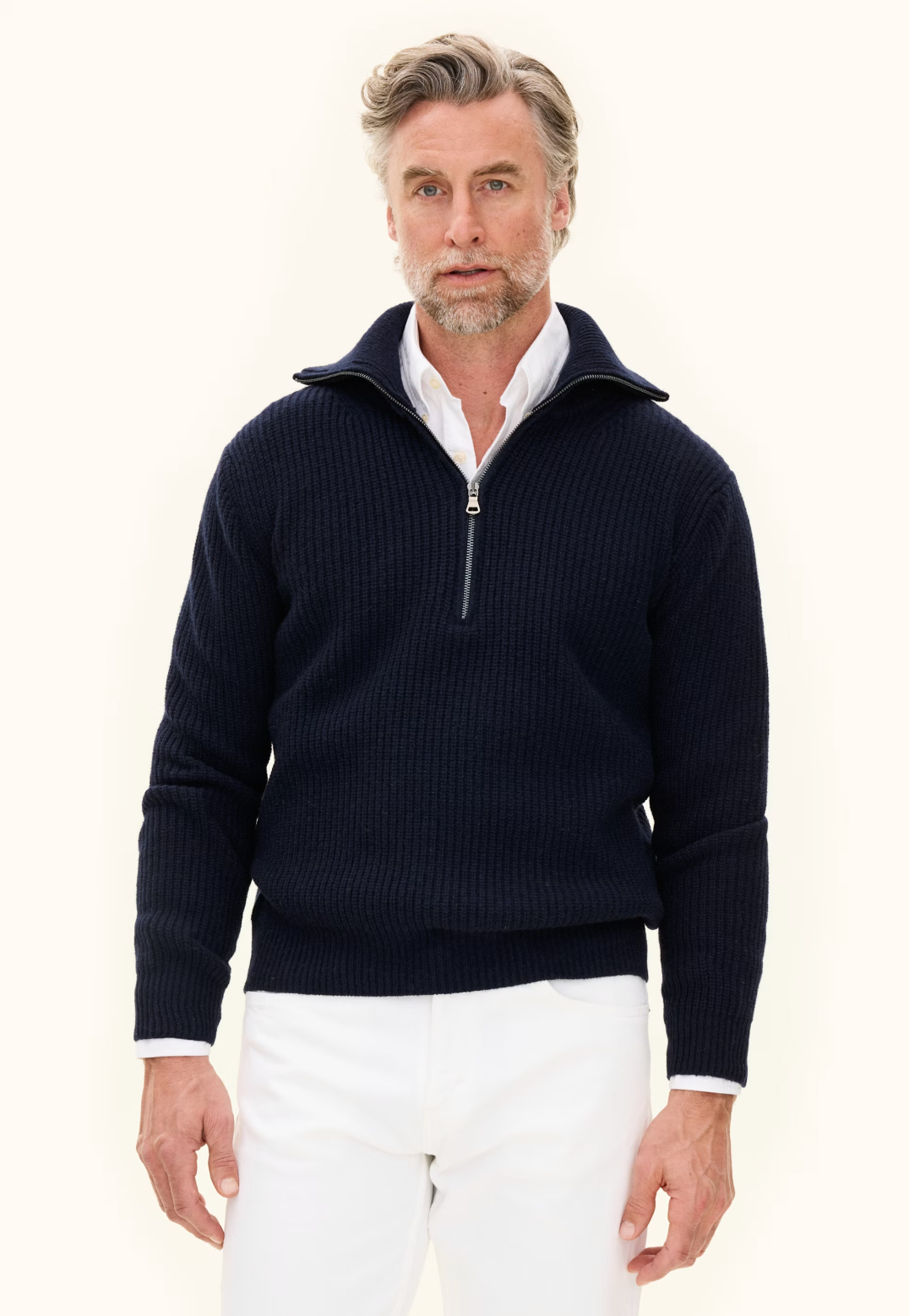 Varm half zip-genser med ekstra høy krage, strikket i 'English rib' som gir en stripet struktur. Strikket i 5gg for en kraftig og varm genser, perfekt for både innendørs og utendørs bruk.