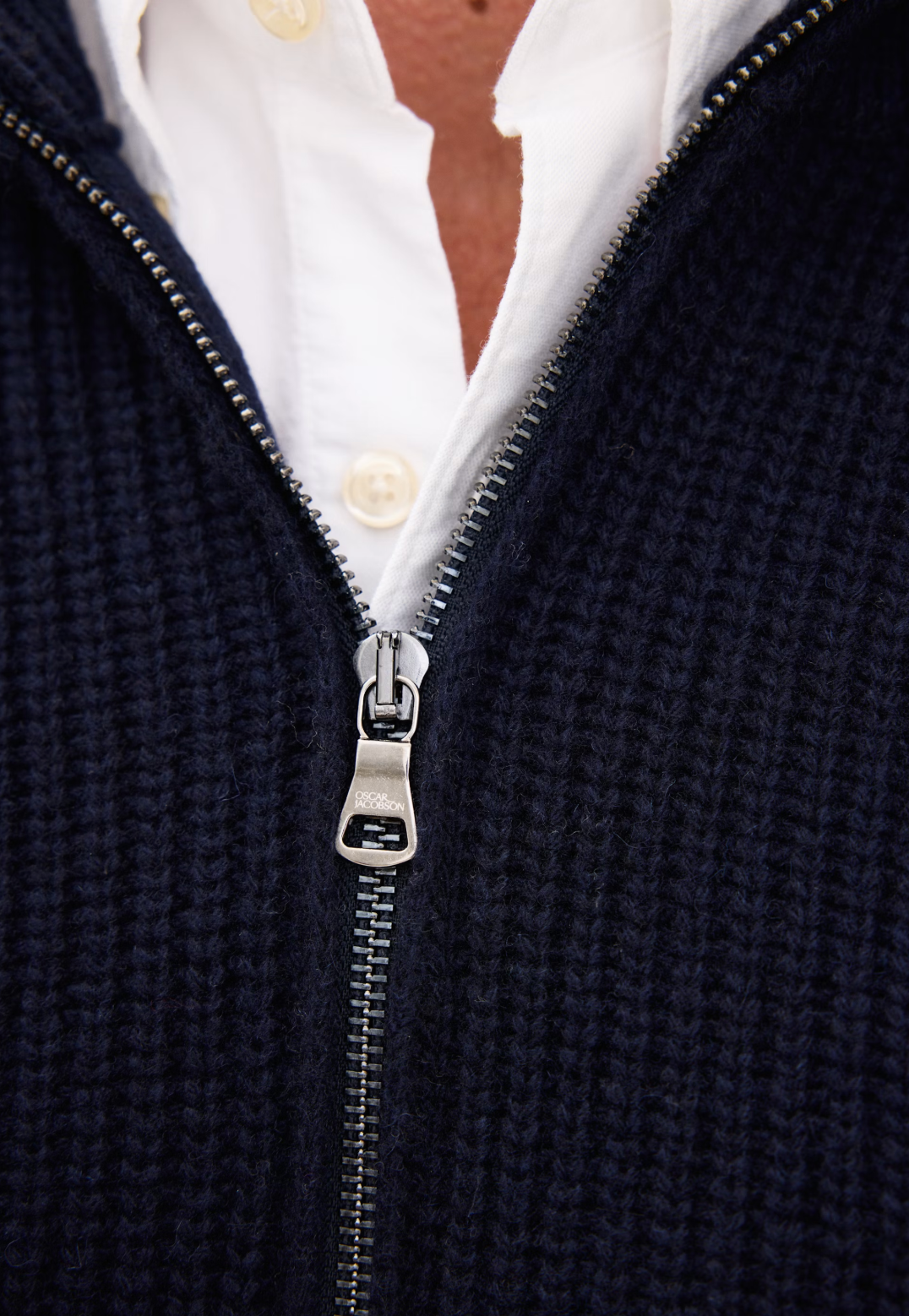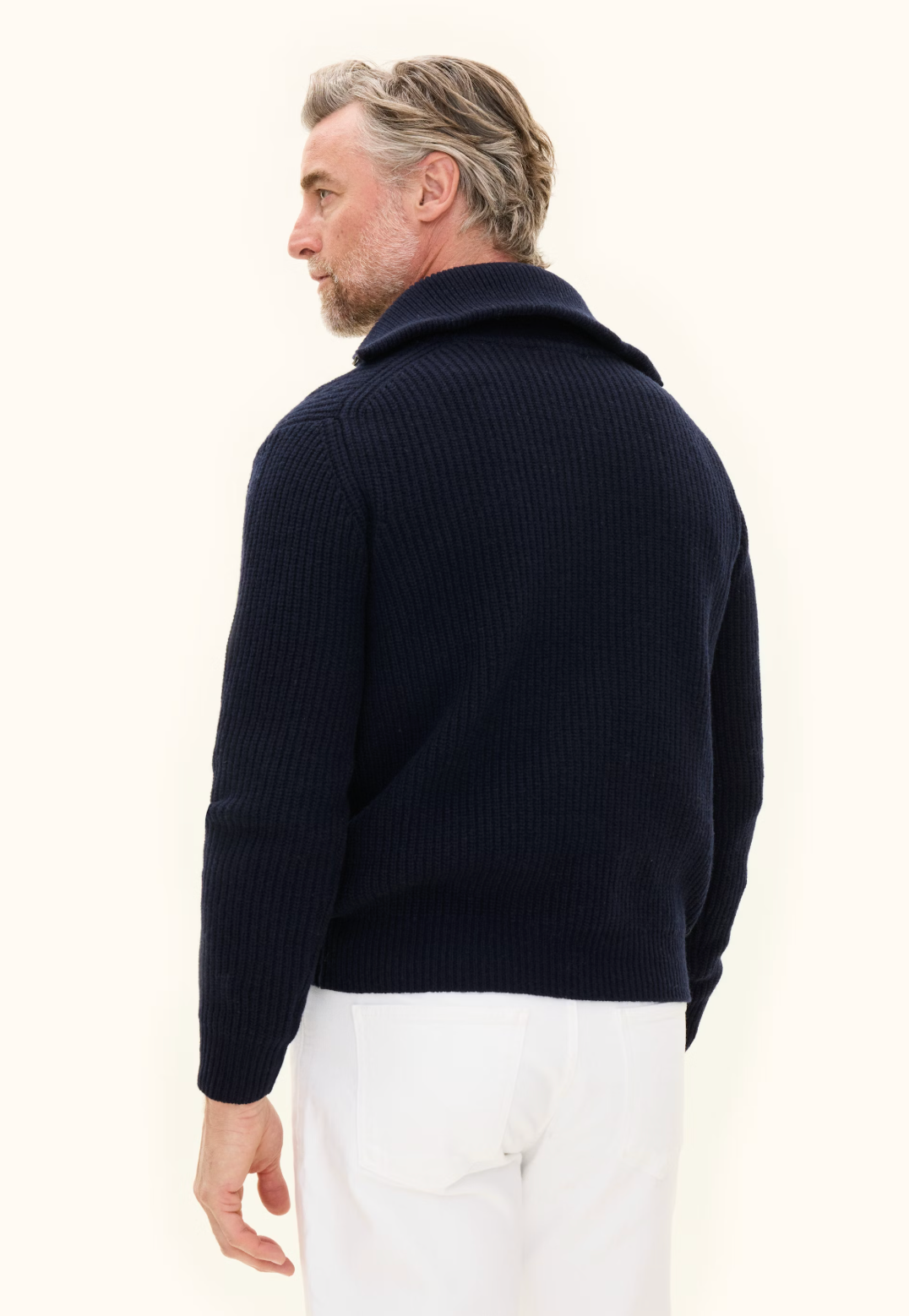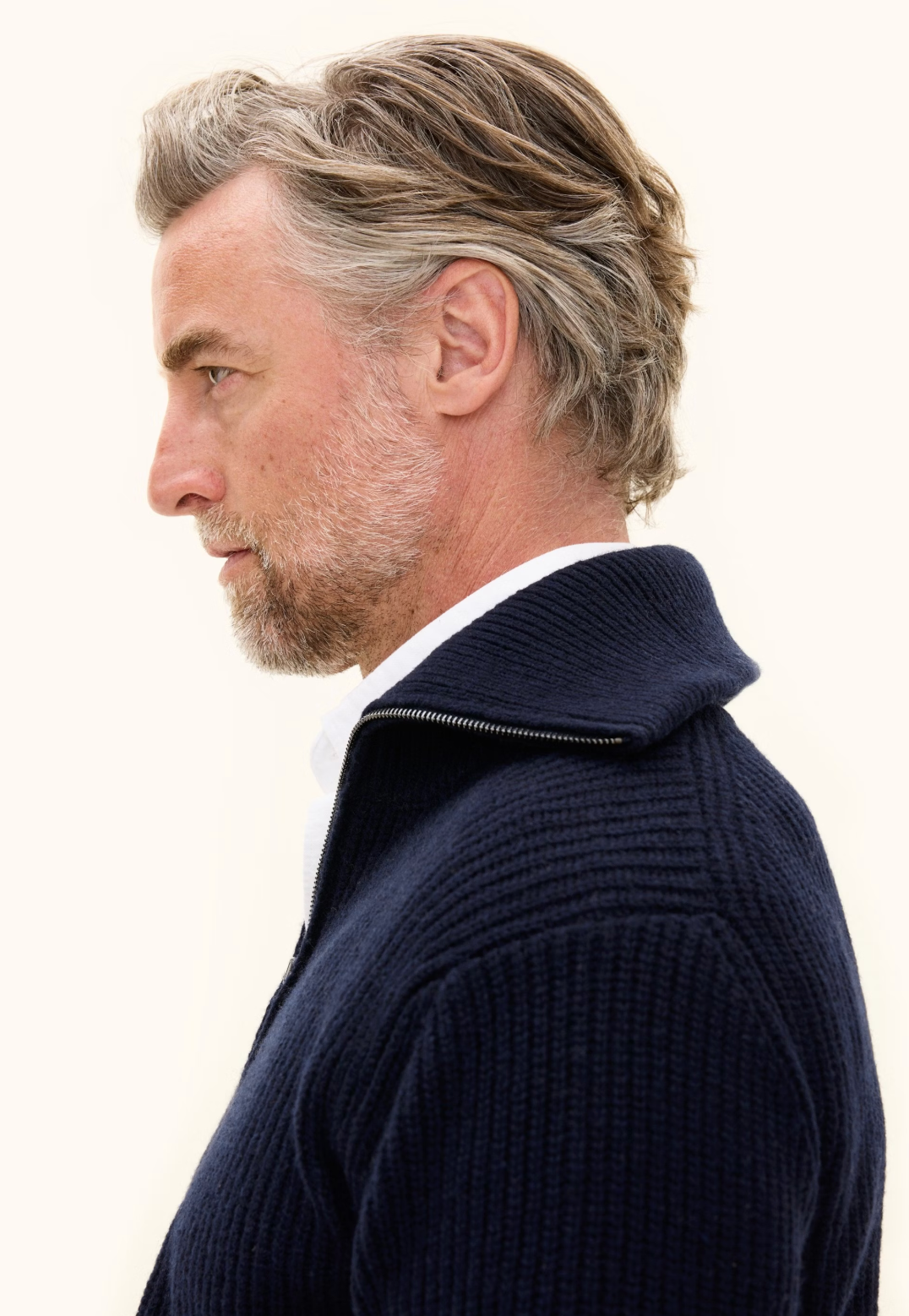 Varm half zip-genser med ekstra høy krage, strikket i 'English rib' som gir en stripet struktur. Strikket i 5gg for en kraftig og varm genser, perfekt for både innendørs og utendørs bruk.