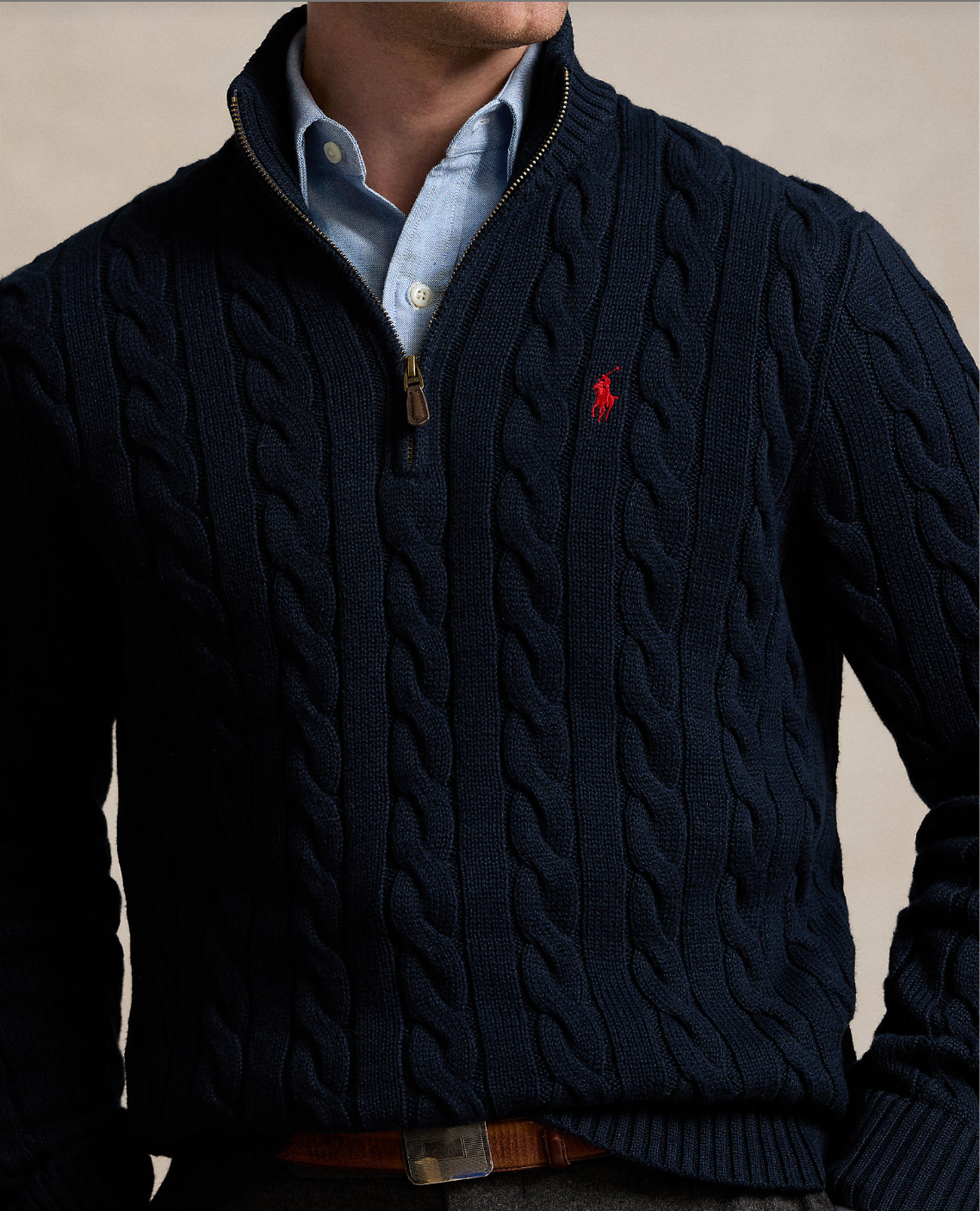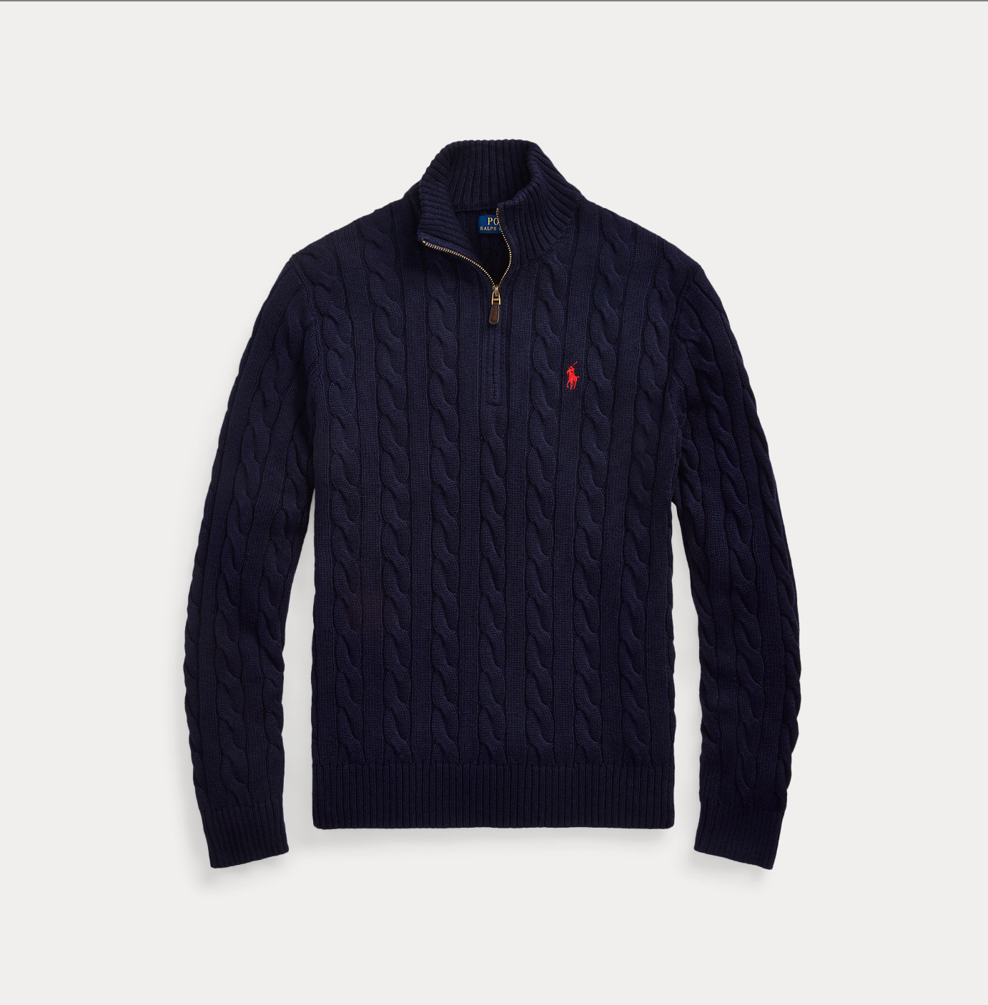 Dette tykkstrikkede bomullslaget har vår ikoniske kabeldesign og signaturbroderte ponni.