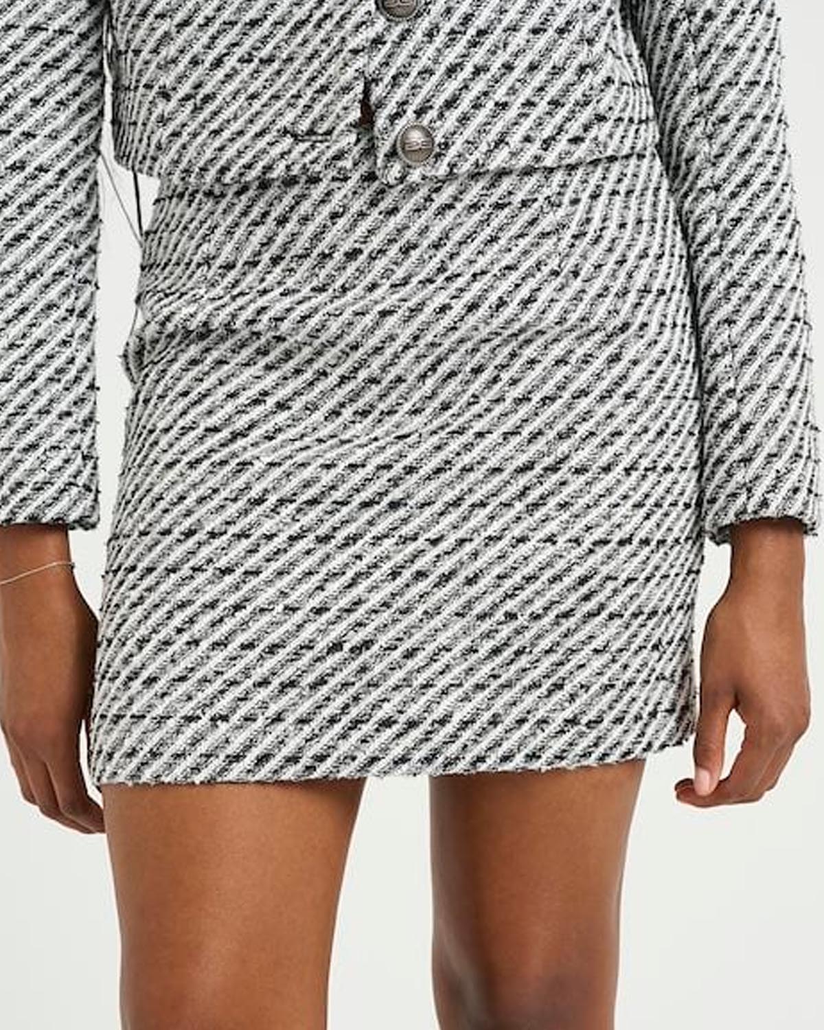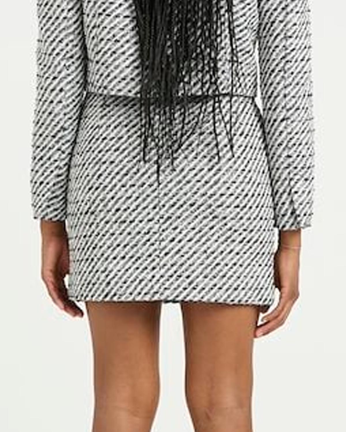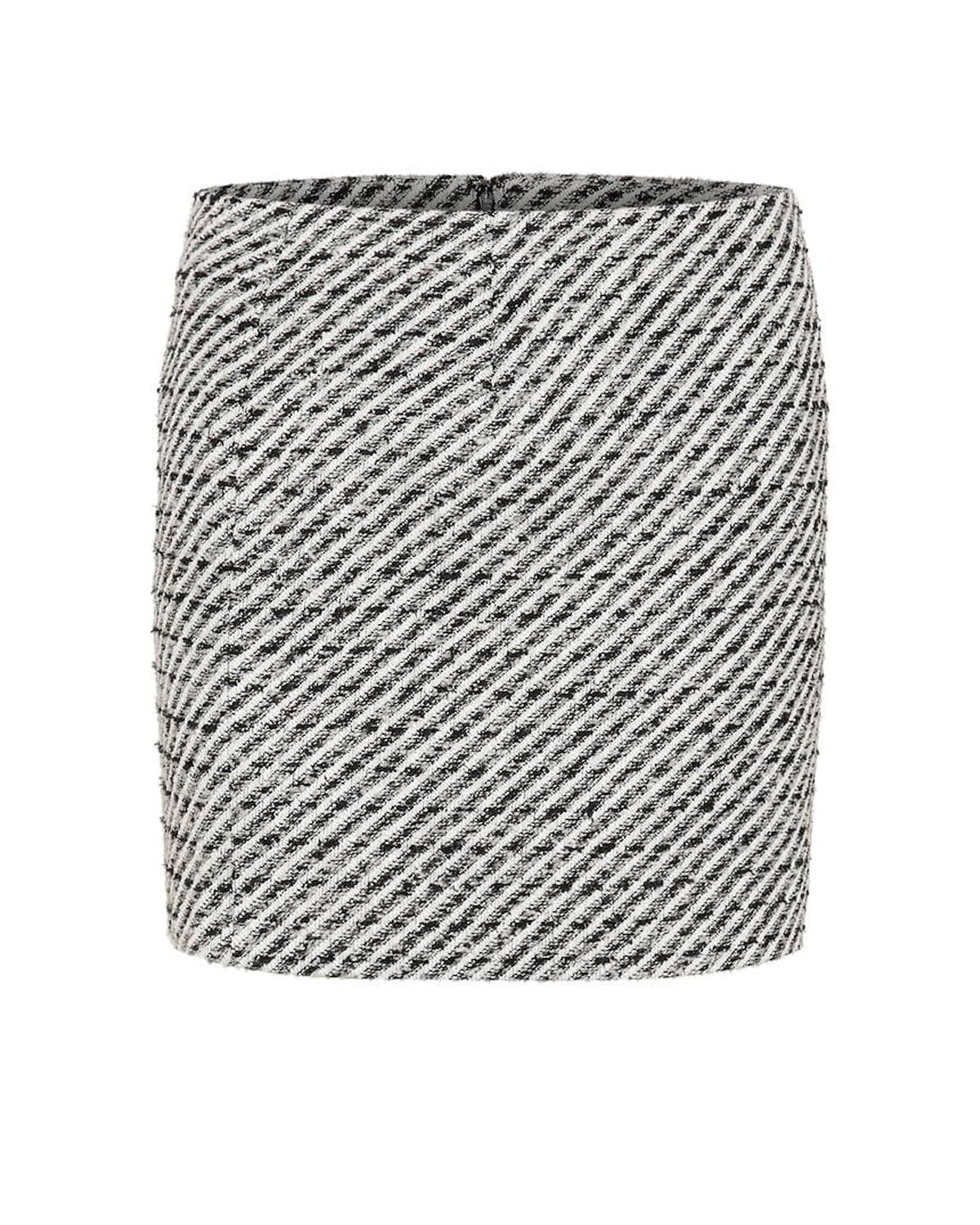 Kort skjørt fra Gestuz. Skjørtet har et stripete mønster i hvite, svarte og grå fargenyanser. Bruk den alene med en topp eller skjorte, eller style den sammen med matchende jakke.