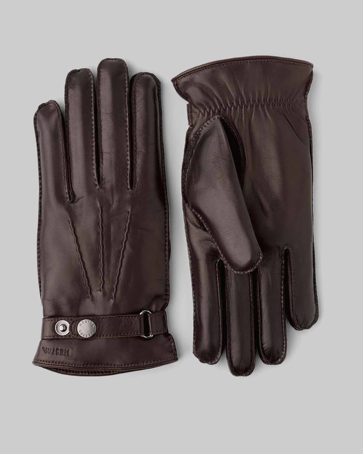 Brune skinnhansker til herre fra Hestra! Jake i fargetonen "Espresso" er en tidløs modell med ull på innsiden. Hanskene har praktisk reim over håndleddet som lukkes med knapp.