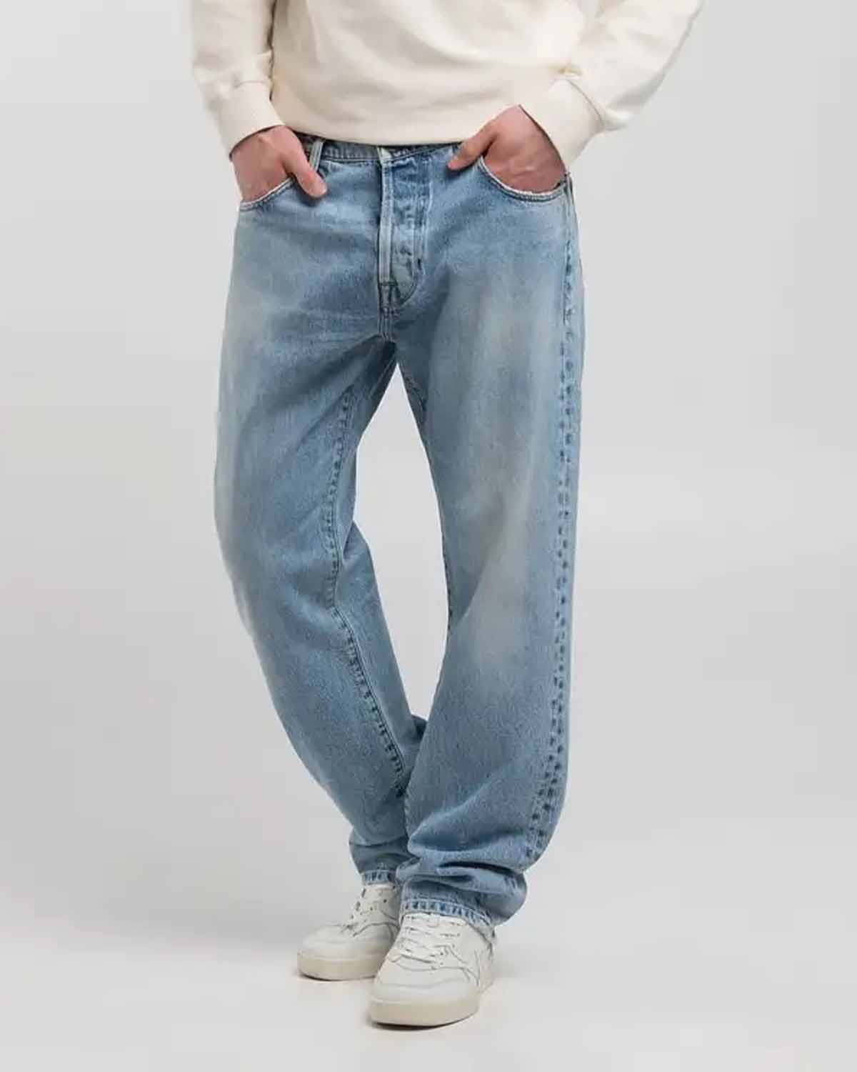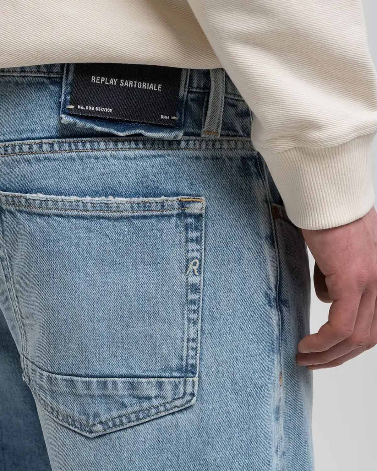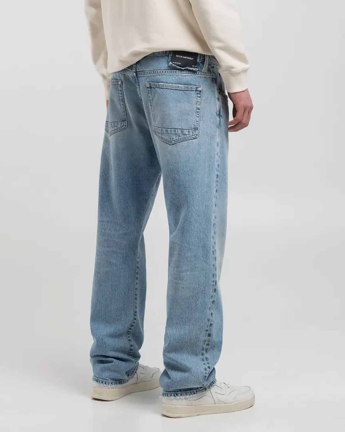 Jeans med avslappet passform med vanlig midje og et avslappet ben fra lår til kant som gir en løs passform og bevegelsesfrihet. Dette stykket kommer i 9-oz stretch bomull indigo denim med en lett enzym steinvask og blekevask. Denne fem-lommers buksen har en distressed effekt skapt med en høyoppløselig laservask, en håndpåført skittent pigmentbehandling og rifter på lommer og fald. Det ikoniske R-broderiet på en av baklommene, skriftmerket og den lille tilpassede innsatsen på en av frontlommene setter prikken over i-en til disse herrejeansene.