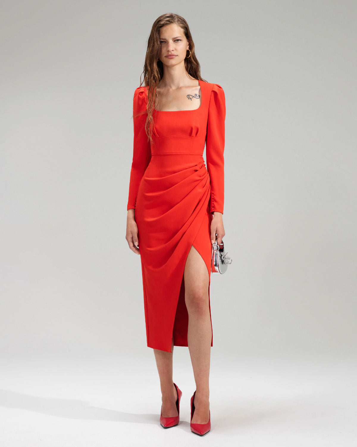 Red Crepe Ruched Midi Dress