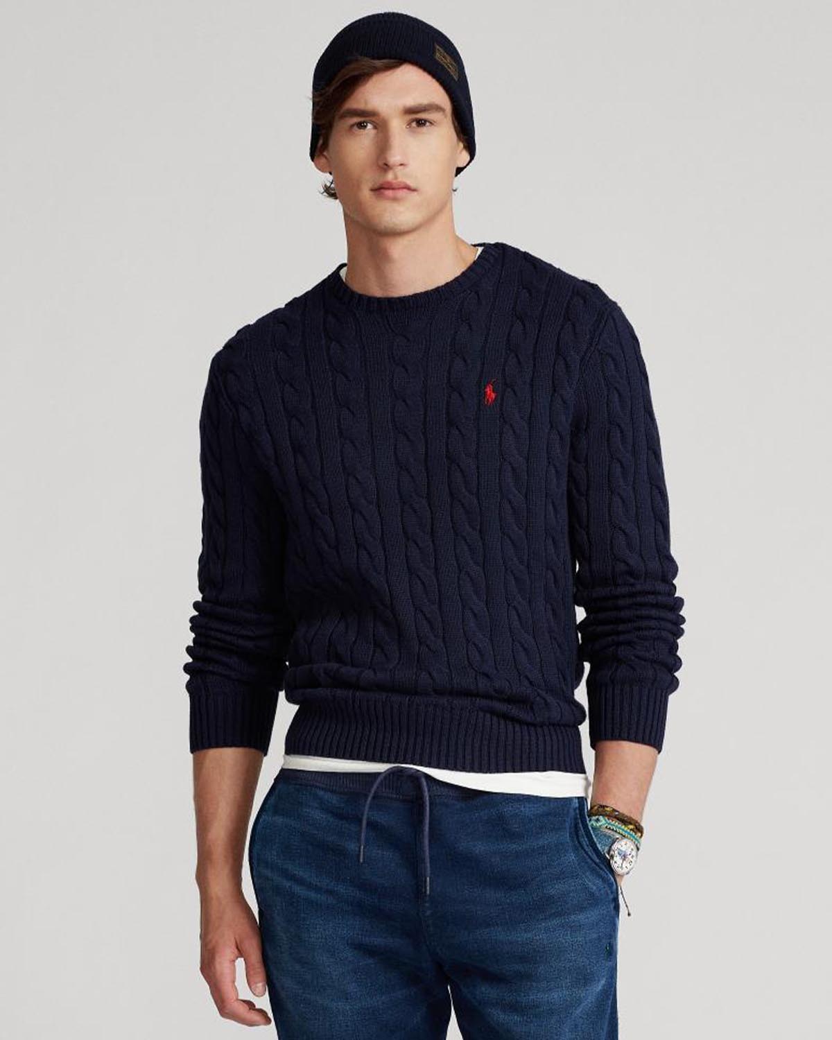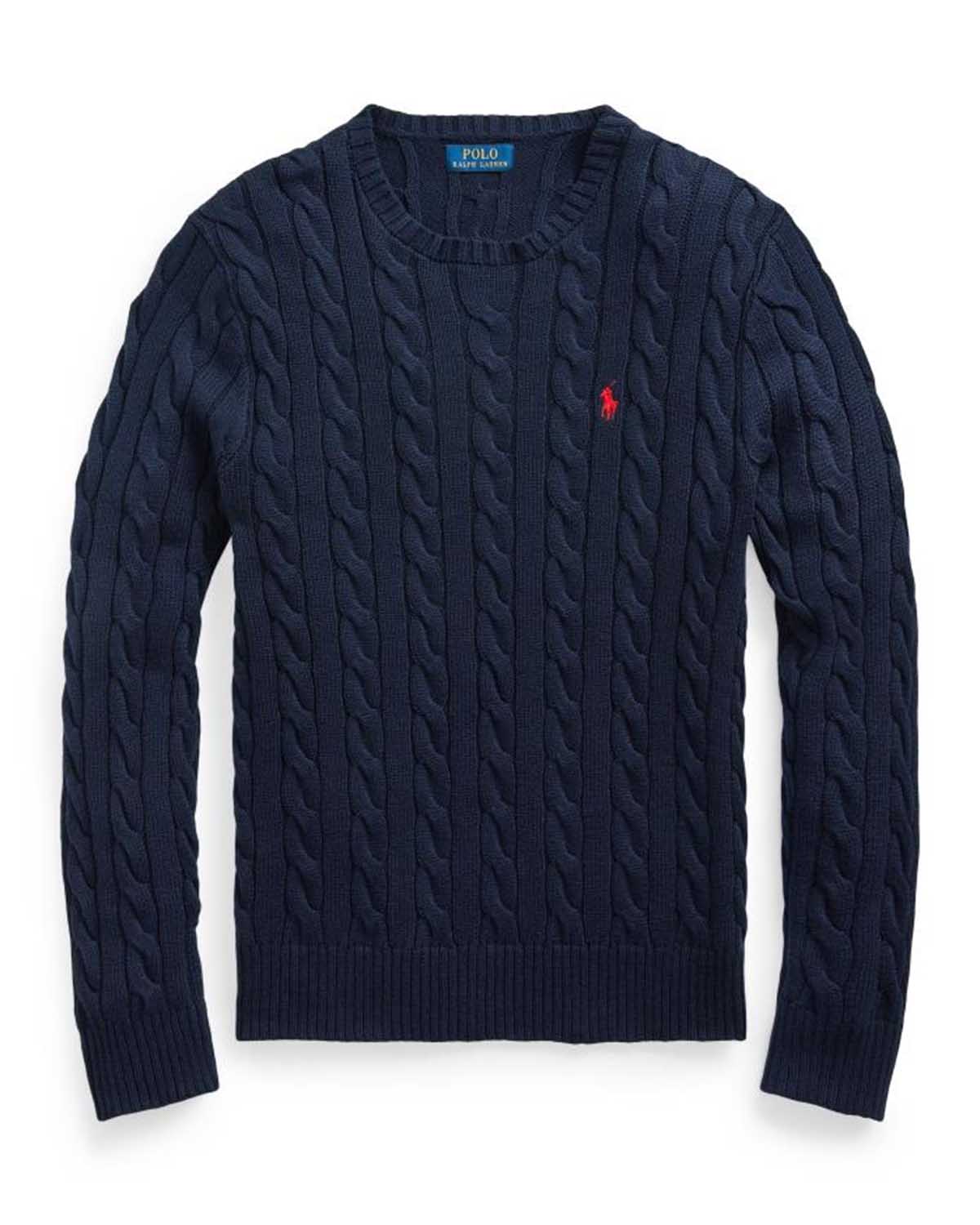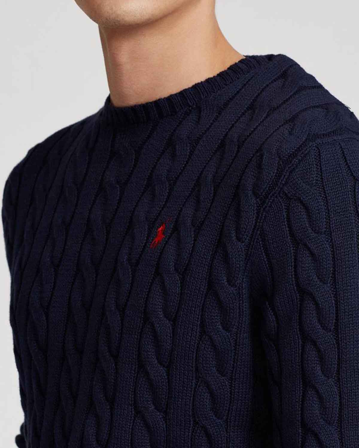 Mørk blå kabelstrikk i myk bomull fra Polo Ralph Lauren. Cable Knit Cotton Sweater har rund hals, rett fasong og lang erm. Genseren fullføres av den kjente polospilleren brodert i rødt på brystet.