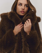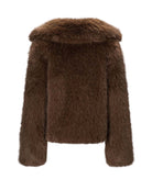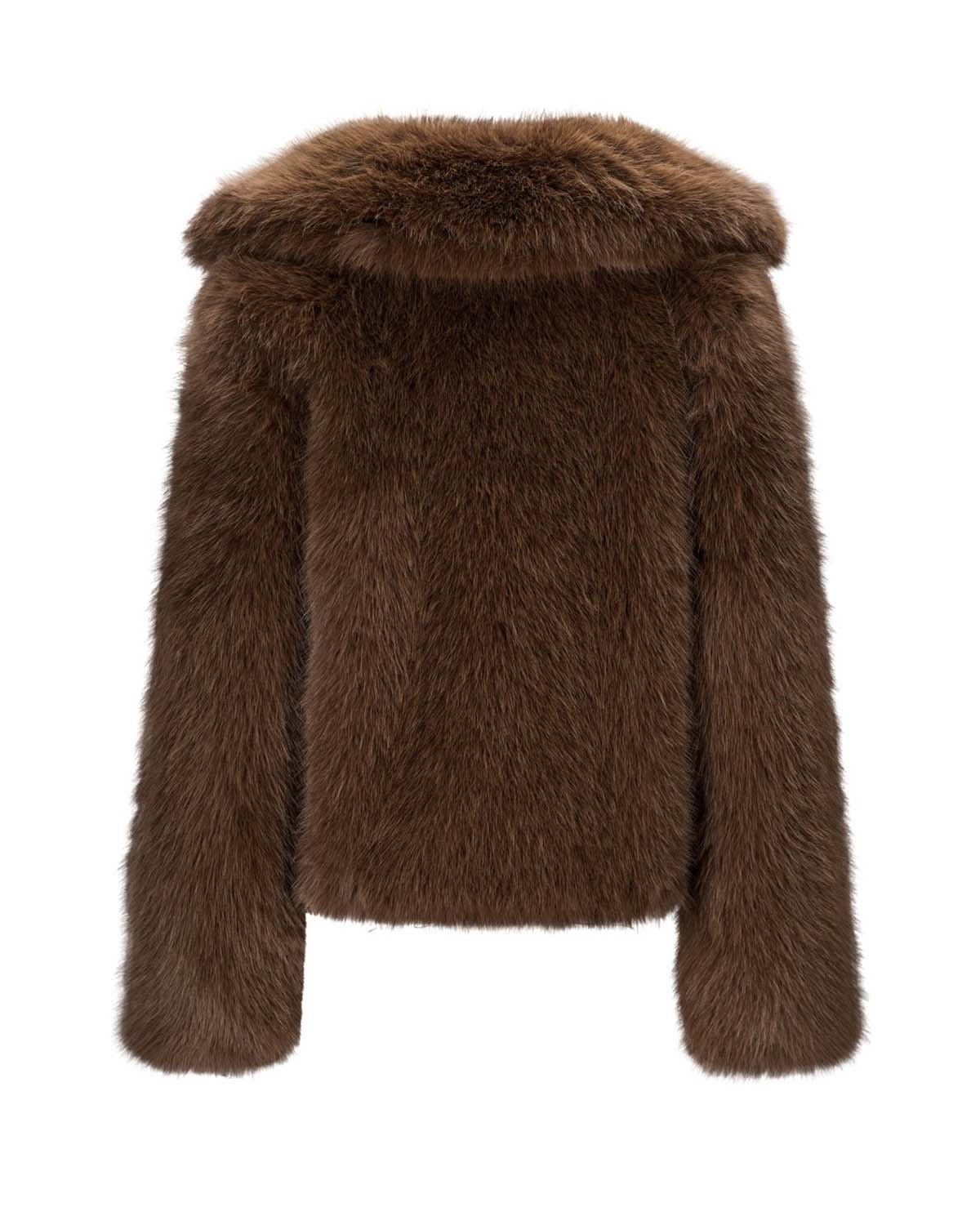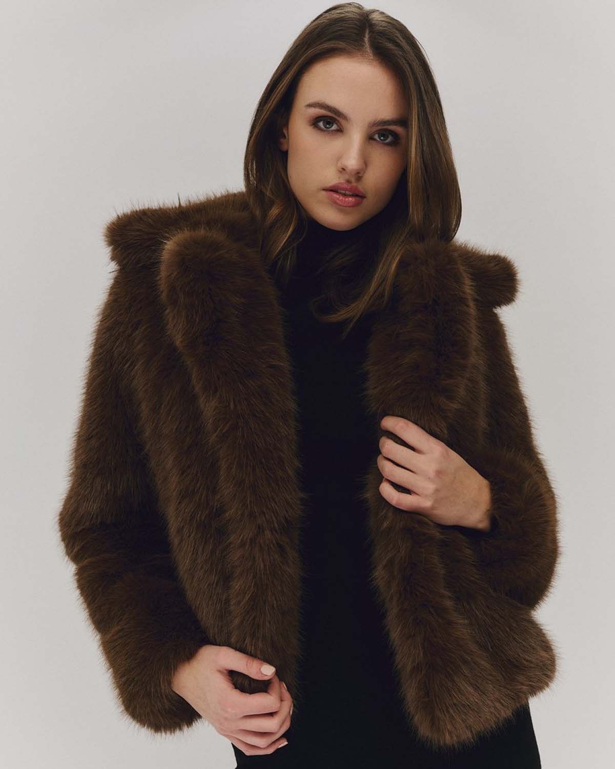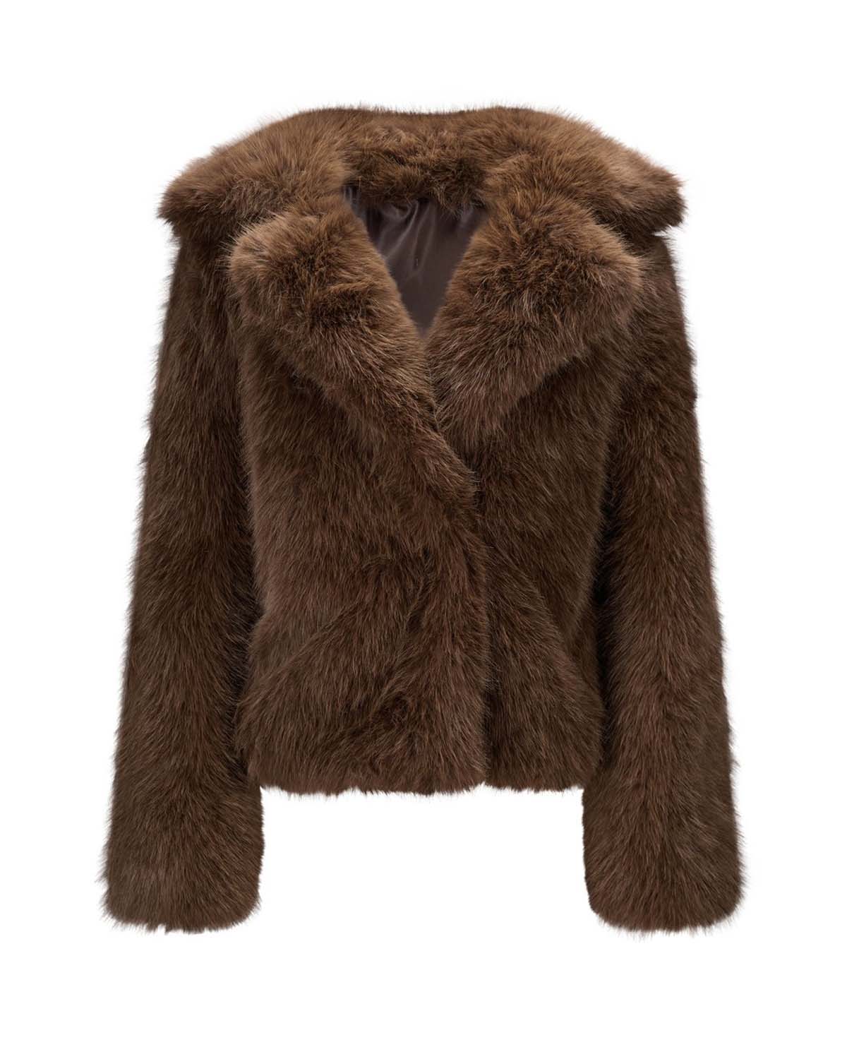 Kort jakke i fuskepels med et elegant, strukturert utseende. Har sidelommer, en hakket krage og knappelukking foran. En diskré hekte på kragen gir en tettsittende lukking i halsen. Merk: denne modellen er liten i størrelsen – vurder å gå opp i størrelsen for en mer komfortabel passform.