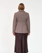 Feminin tweedblazer i en kompakt og myk ullblend. Modellen er designet med bredt jakkeslag, to frontlommer og splitt i ryggen. Insvinget fasong.