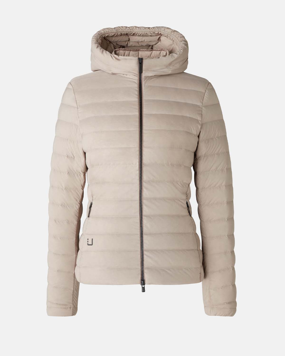 Beige dunjakke til dame fra UBR. Sirius Hooded Jacket i fargetonen "Driftwood" er en lett jakke som passer fint til vår, sommer og høst. Jakken er vindtett og vannavvisende, har god pusteevne og full stretch.