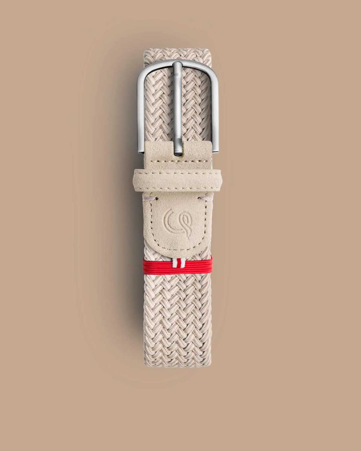 Knokke-beltet, laget av semsket skinn og flettet i en marmorert beige fargetone.