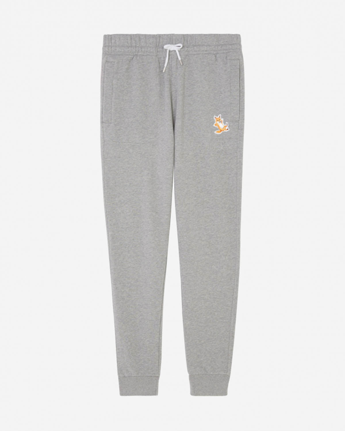 Grå joggebukse i myk bomull fra Maison Kitsuné. Chillax Fox Patch Classic Jog Pants i "Grey Melange" er en tidløs bukse med knyting i livet, lommer i sidene og én lomme bak. Buksa fullføres av merkets rev i avslappet positur på låret.