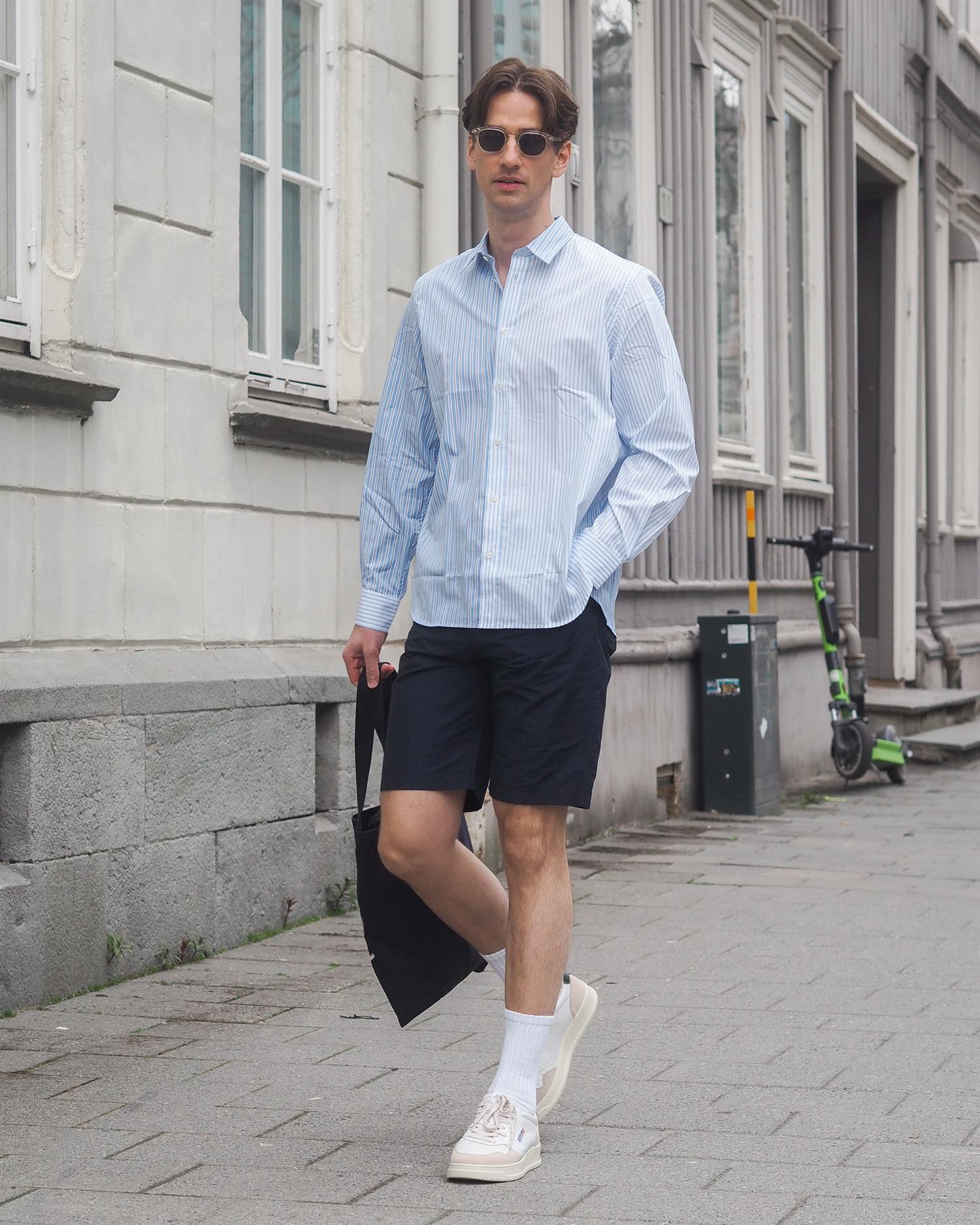 Blå shorts fra Maison Kitsuné. Style med skjorte, caps og sneakers for et sommerlig uttrykk.