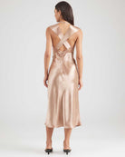 Glizia satengkjole med dyp V-utringning, lett drapert foran, feminin og raffinert. Den brede skulderen skaper nesten et halvt erme, som krysser bak i en dyp utringning. Bak lukkes utringningen med en skjult glidelås. Kjolens linje er litt tettsittende, men faller litt fra hoftene for å fremheve figuren, og ender i et langt skjørt som ikke er for voluminøst.