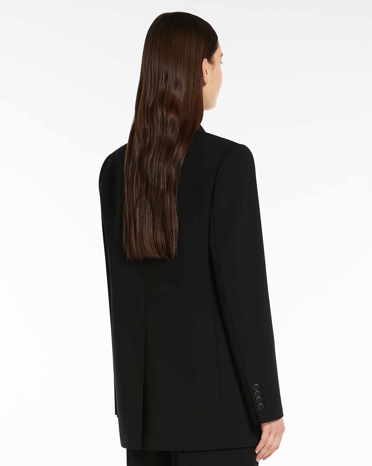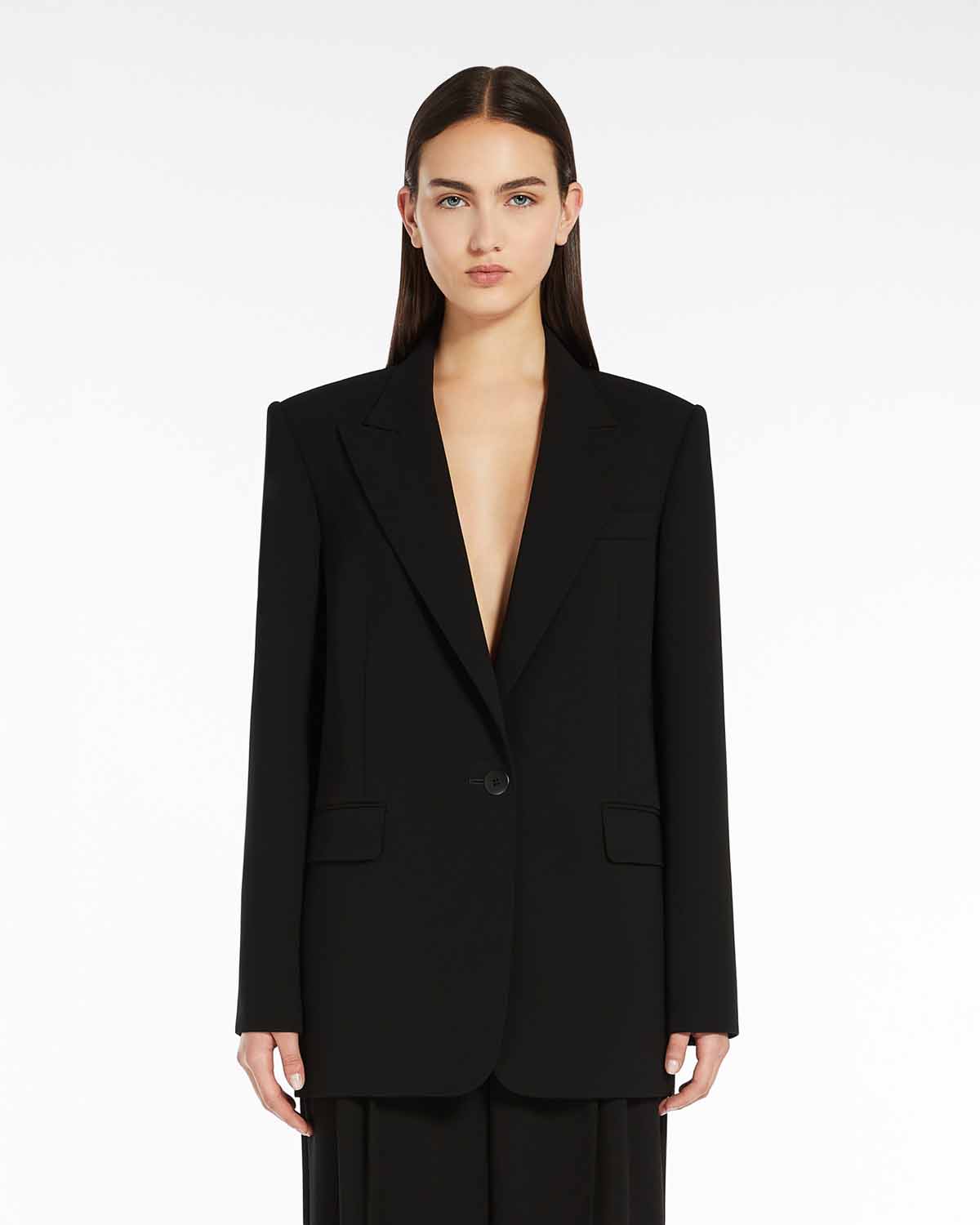 Moderne enkeltspent cady-blazer med topp-jakkekrage, lange innsatte ermer, statement-skuldre og lommer foran. Utsmykket med brystlomme og mansjetter med knapper. Lavt skåret enknappsfeste.