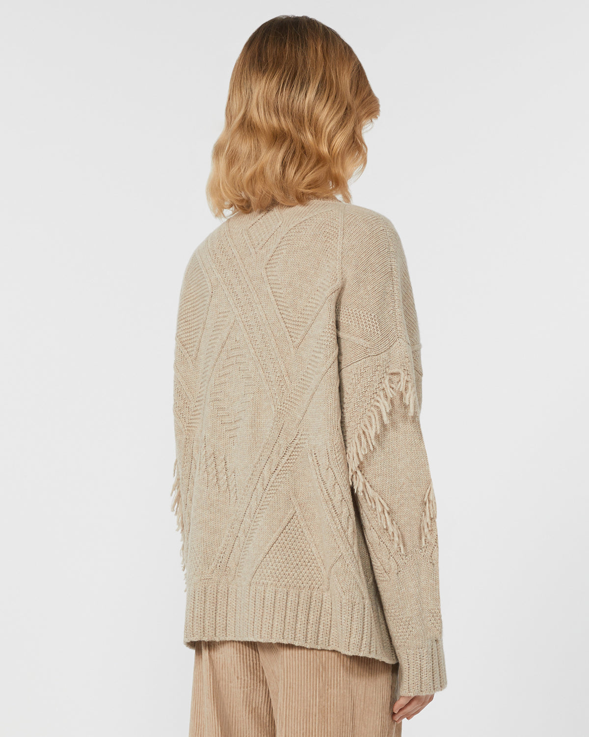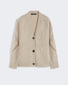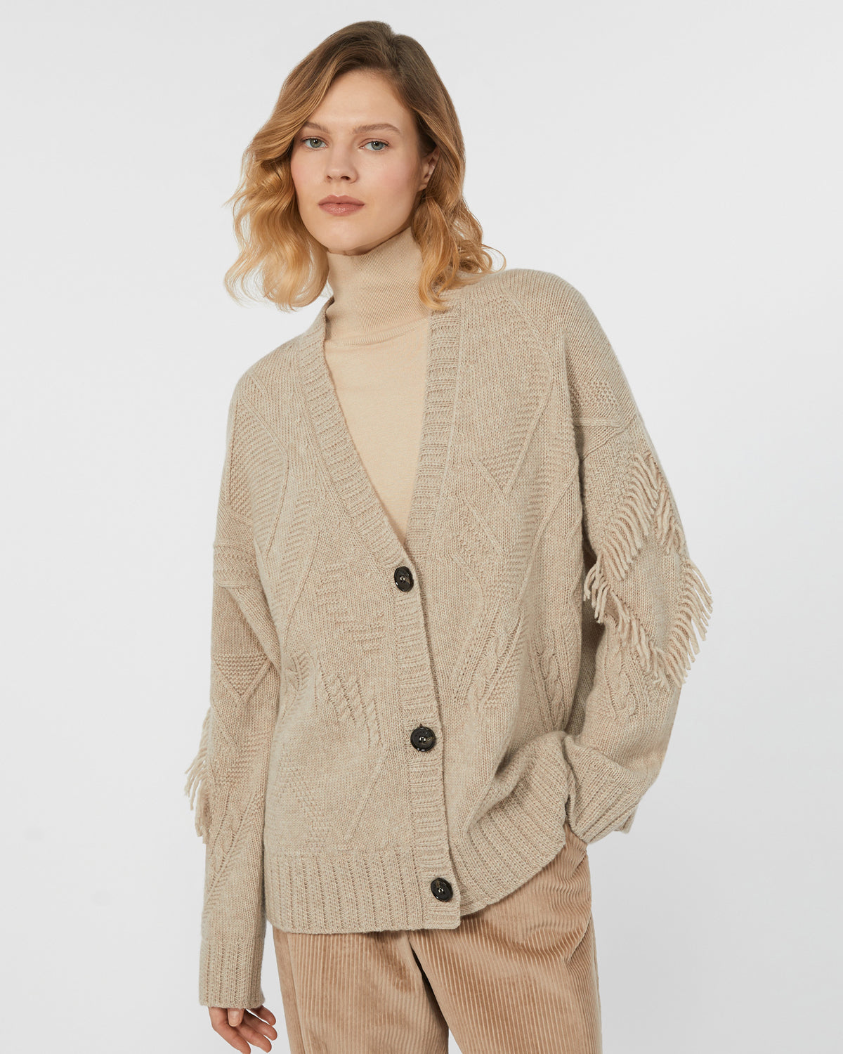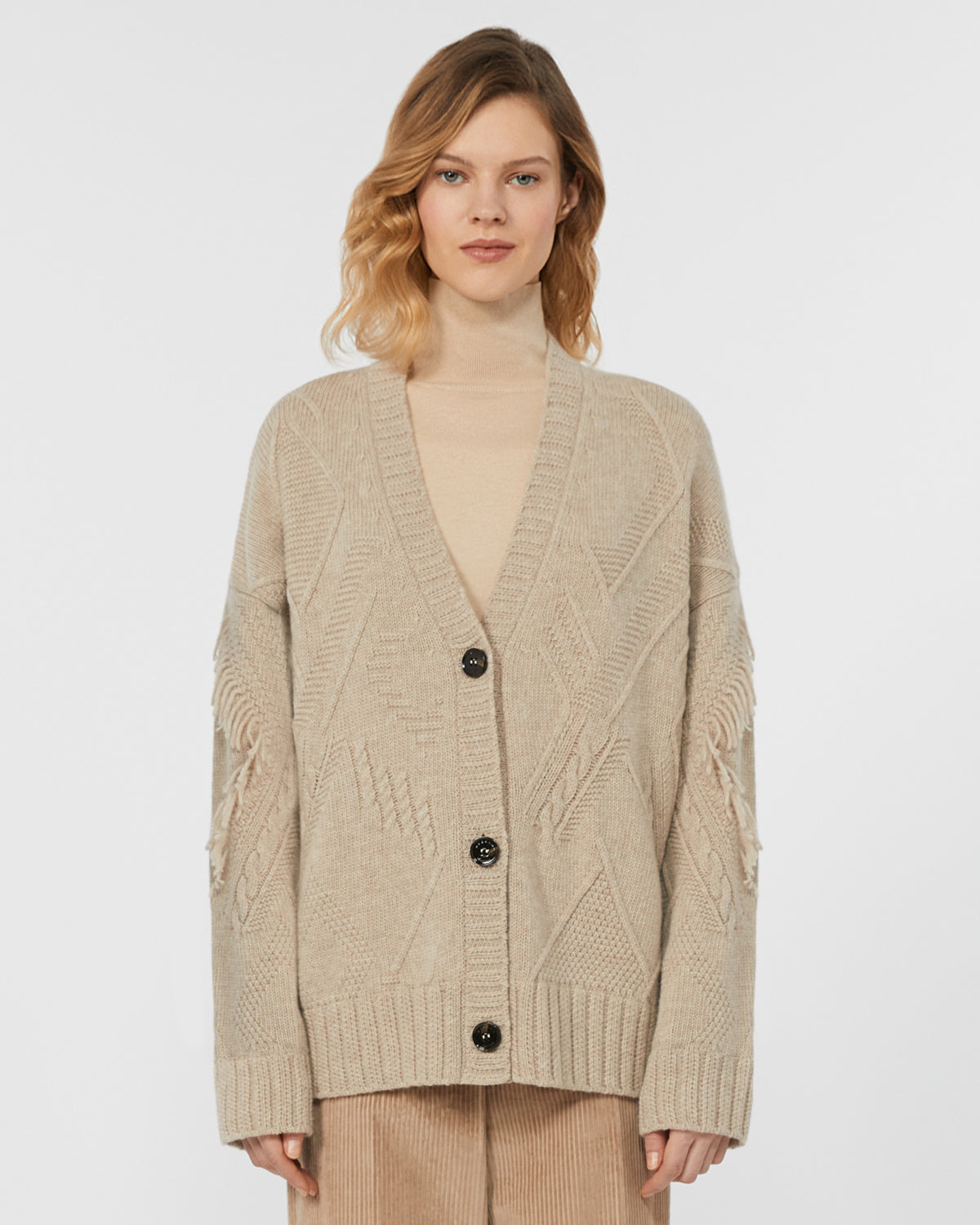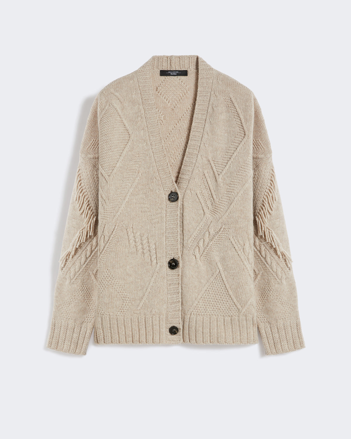 Cardigan med varierende strikkesømmer som gir struktur til plaggets tekstur.