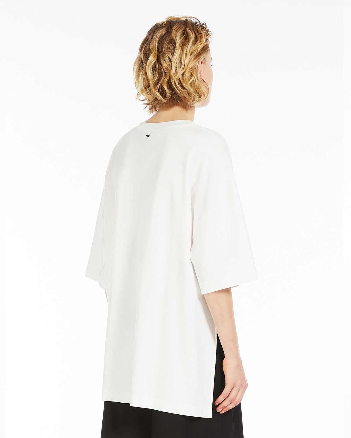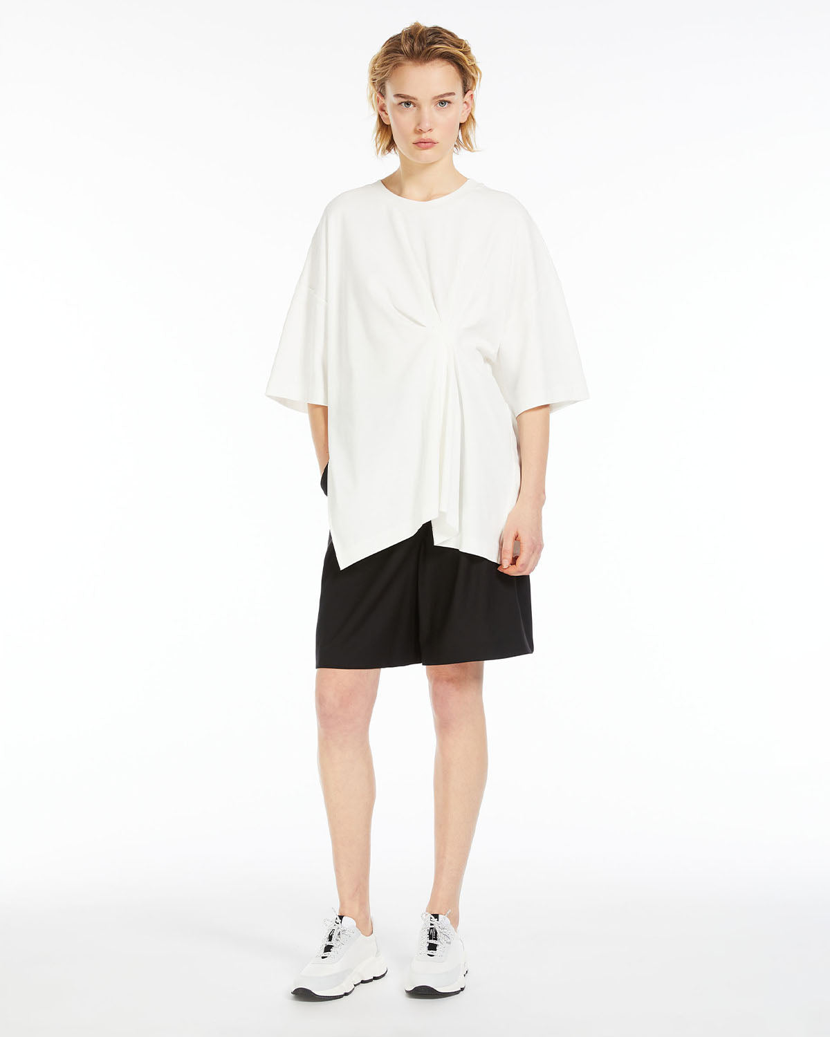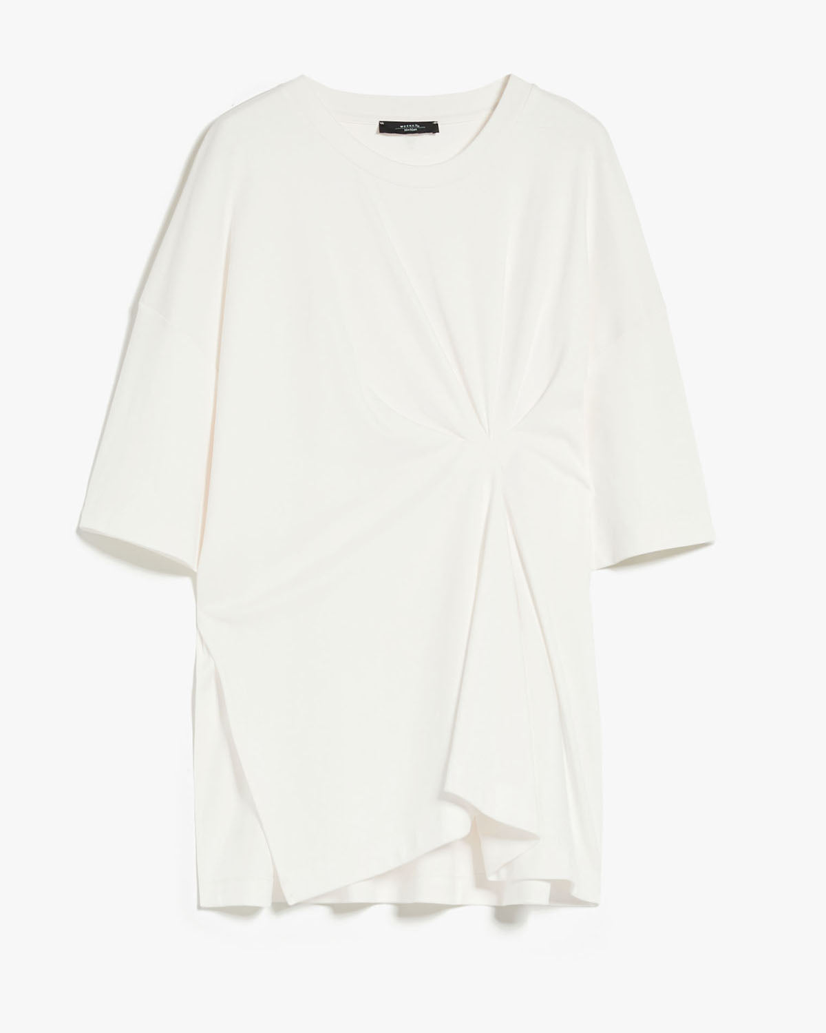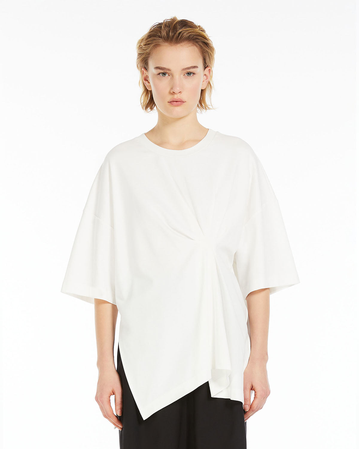 Kortermet t-skjorte i myk bomullsstoff. Den overdimensjonerte modellen har delikat asymmetrisk plissering på siden, sidespalter og albuelengde drops-skulderermer.