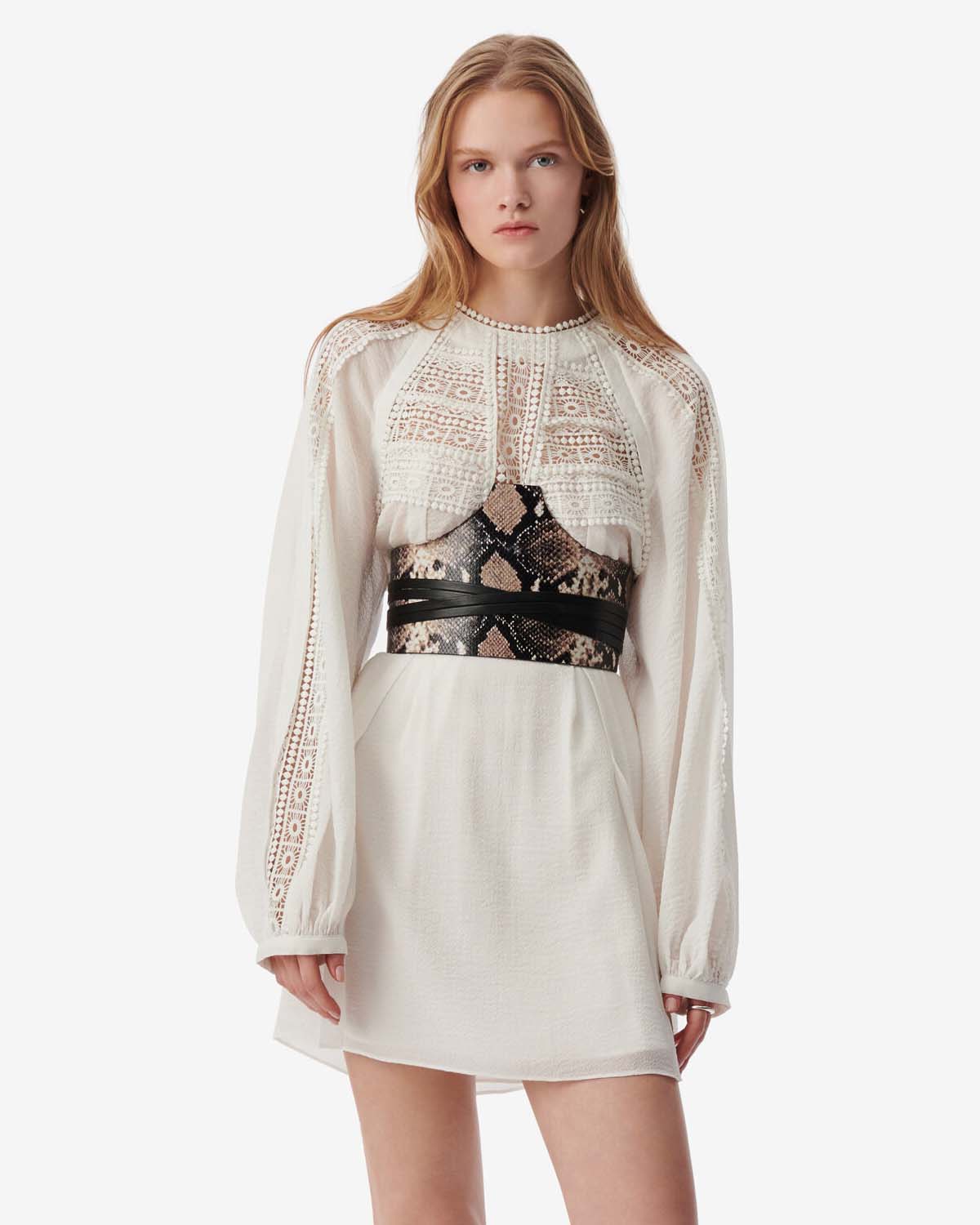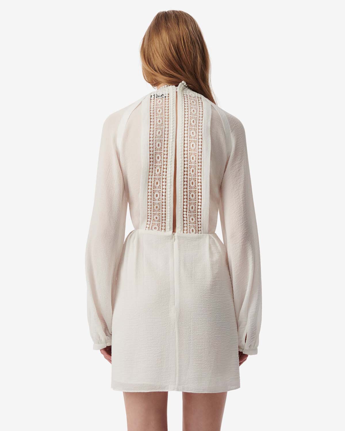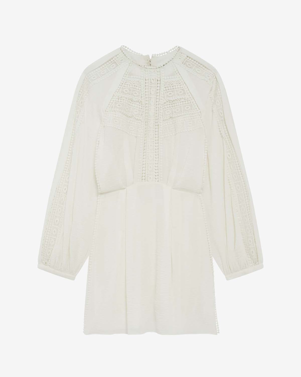 RYNNA er en kort kjole med grafisk broderi, rund krage og dyp bakåpning fra IRO.